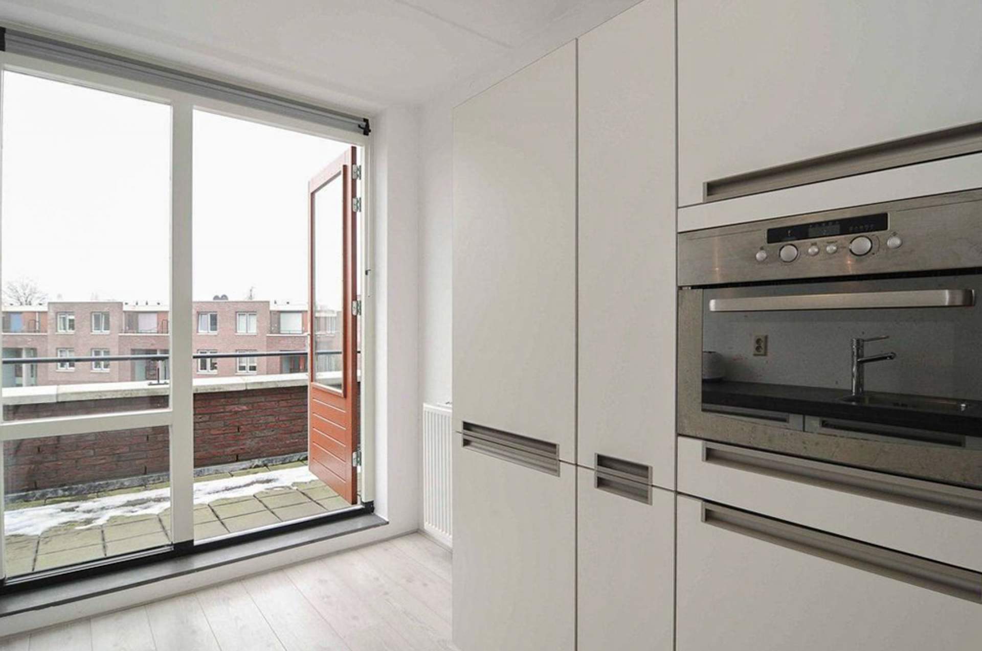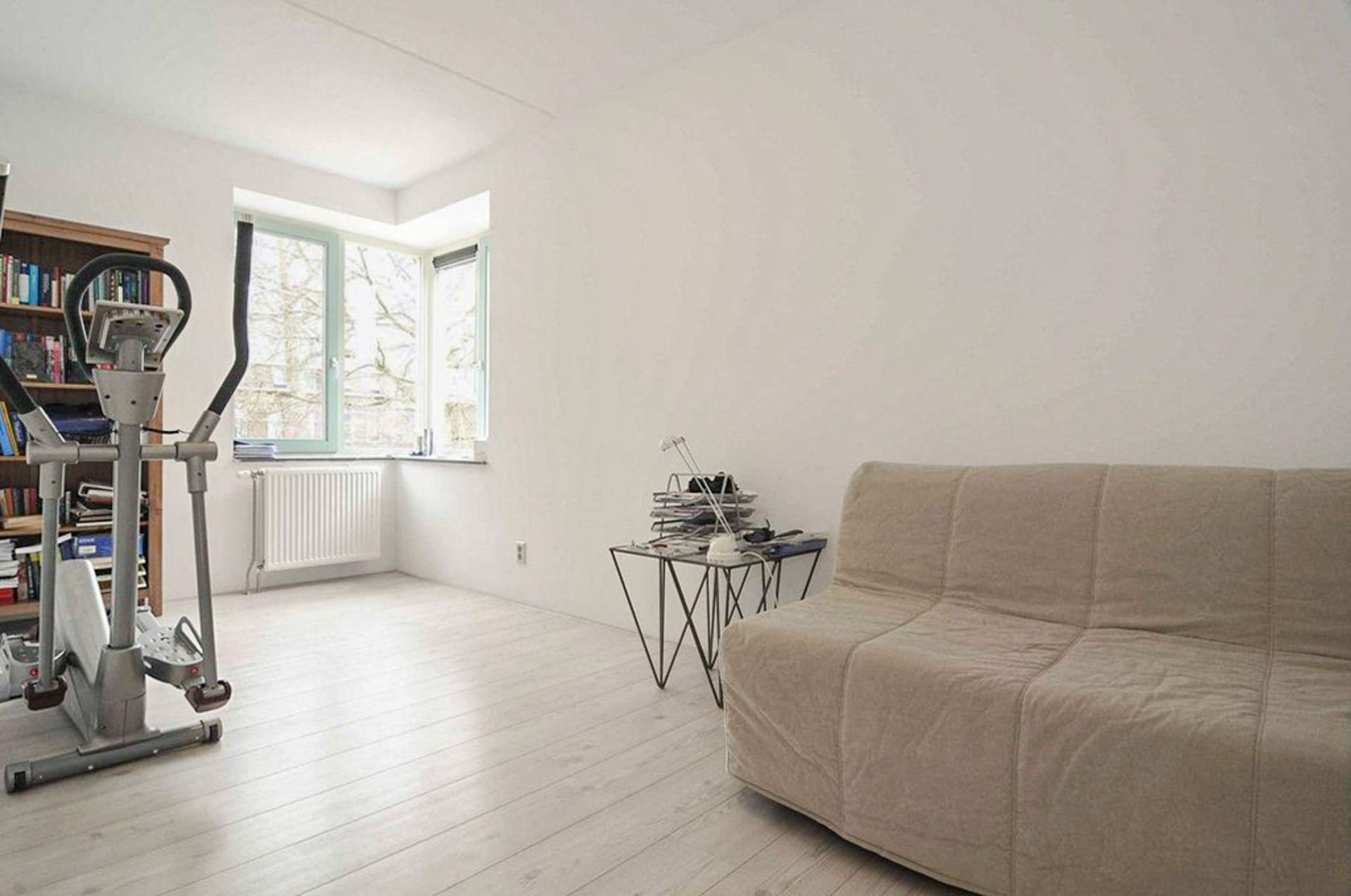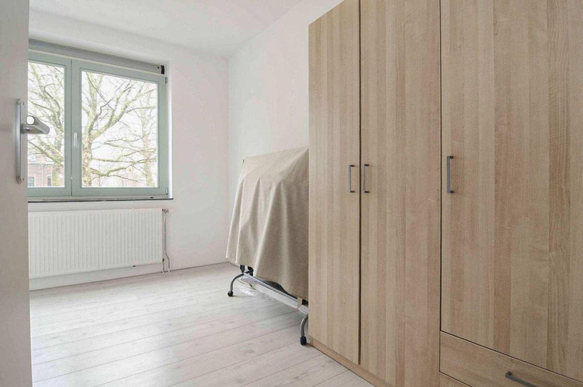 Landing with a storage room with the central heating and central ventilation. There is also the second toilet. There is a very bright living room with a beautiful view over the water and the public greenery. The living room is partly furnished. There is a separate kitchen with a dishwasher, fridge / freezer, combi oven, extractor and design hob. Through the kitchen you come to the spacious balcony which is located on the west. There is also a third bedroom here, which is also the largest. Here is a bed with a slatted base and a chest of drawers.