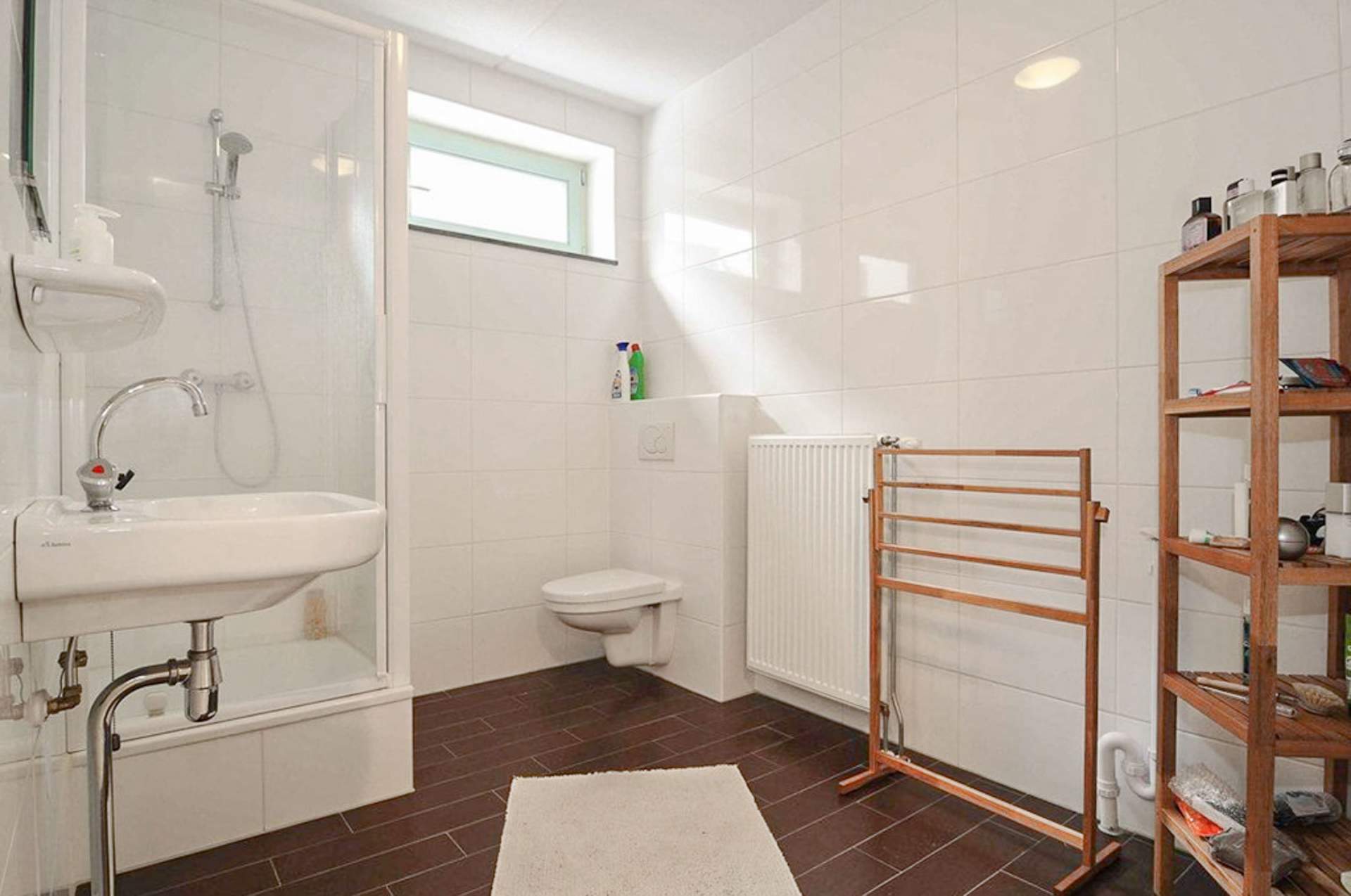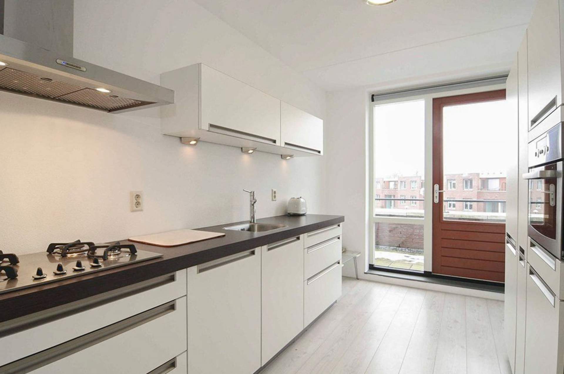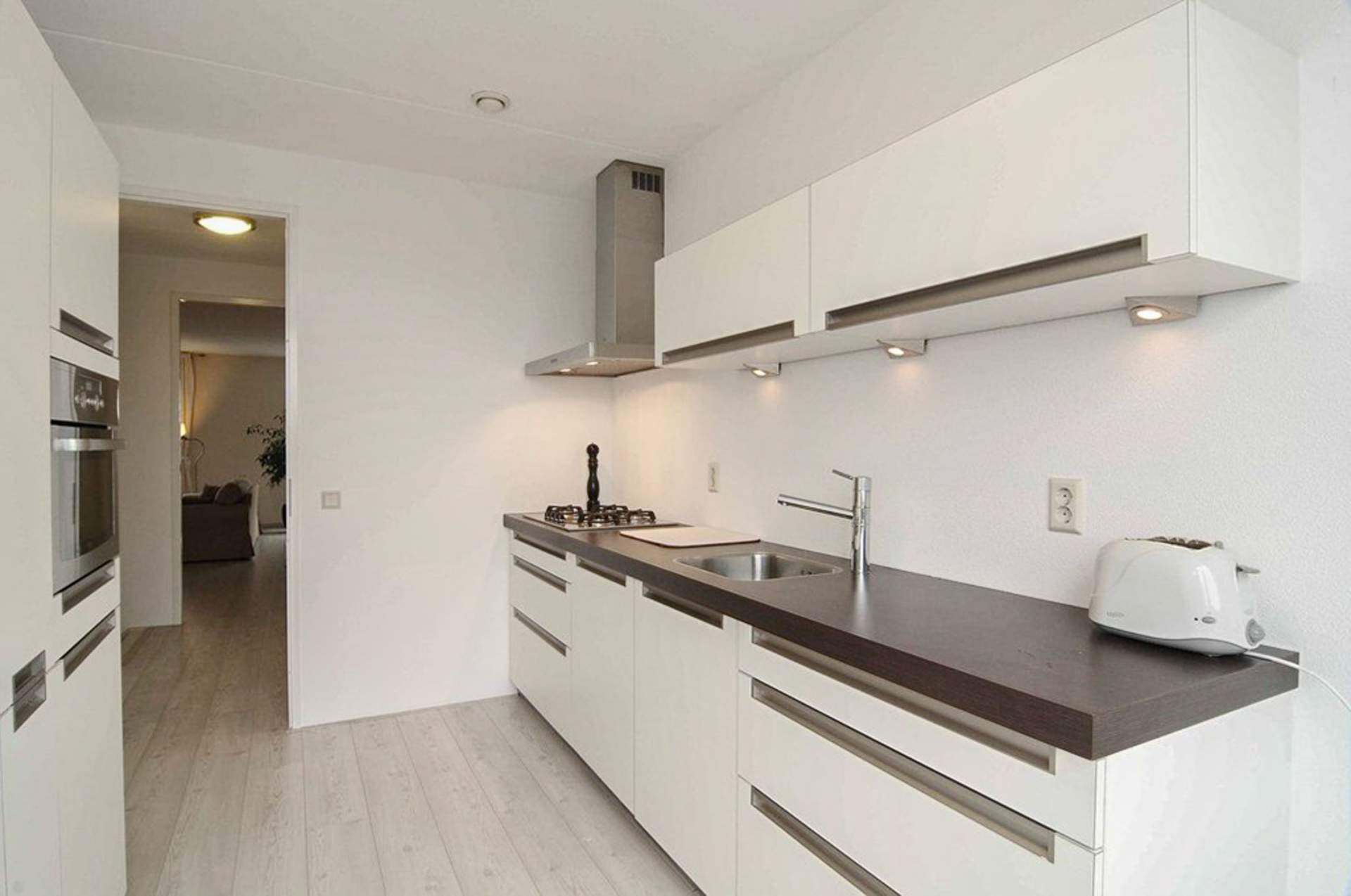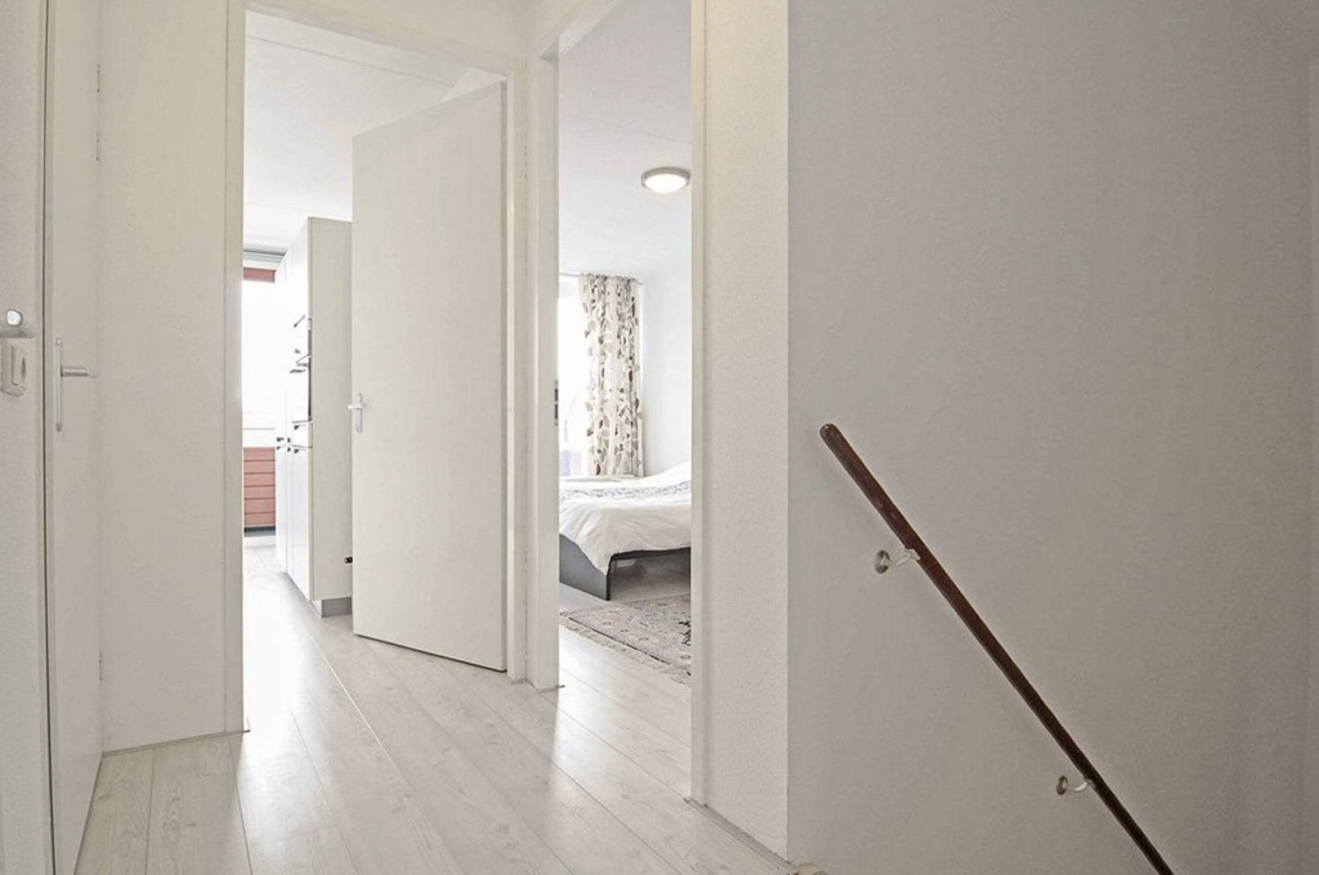 Landing with a storage room with the central heating and central ventilation. There is also the second toilet. There is a very bright living room with a beautiful view over the water and the public greenery. The living room is partly furnished. There is a separate kitchen with a dishwasher, fridge / freezer, combi oven, extractor and design hob. Through the kitchen you come to the spacious balcony which is located on the west. There is also a third bedroom here, which is also the largest. Here is a bed with a slatted base and a chest of drawers.