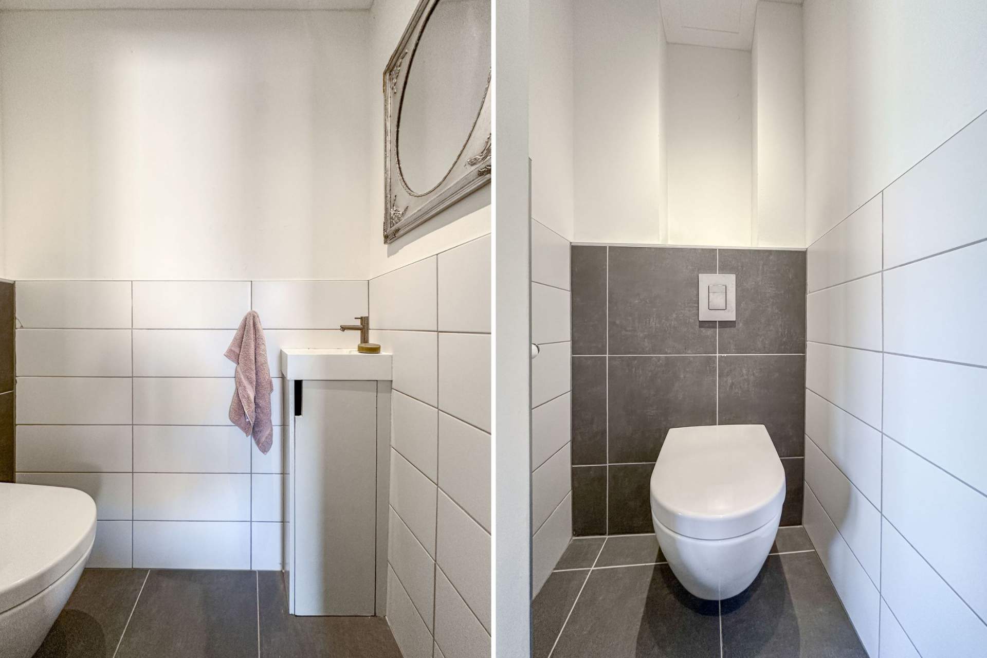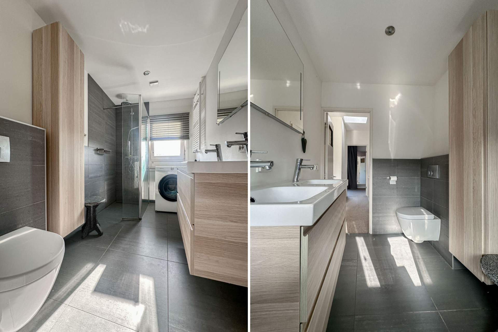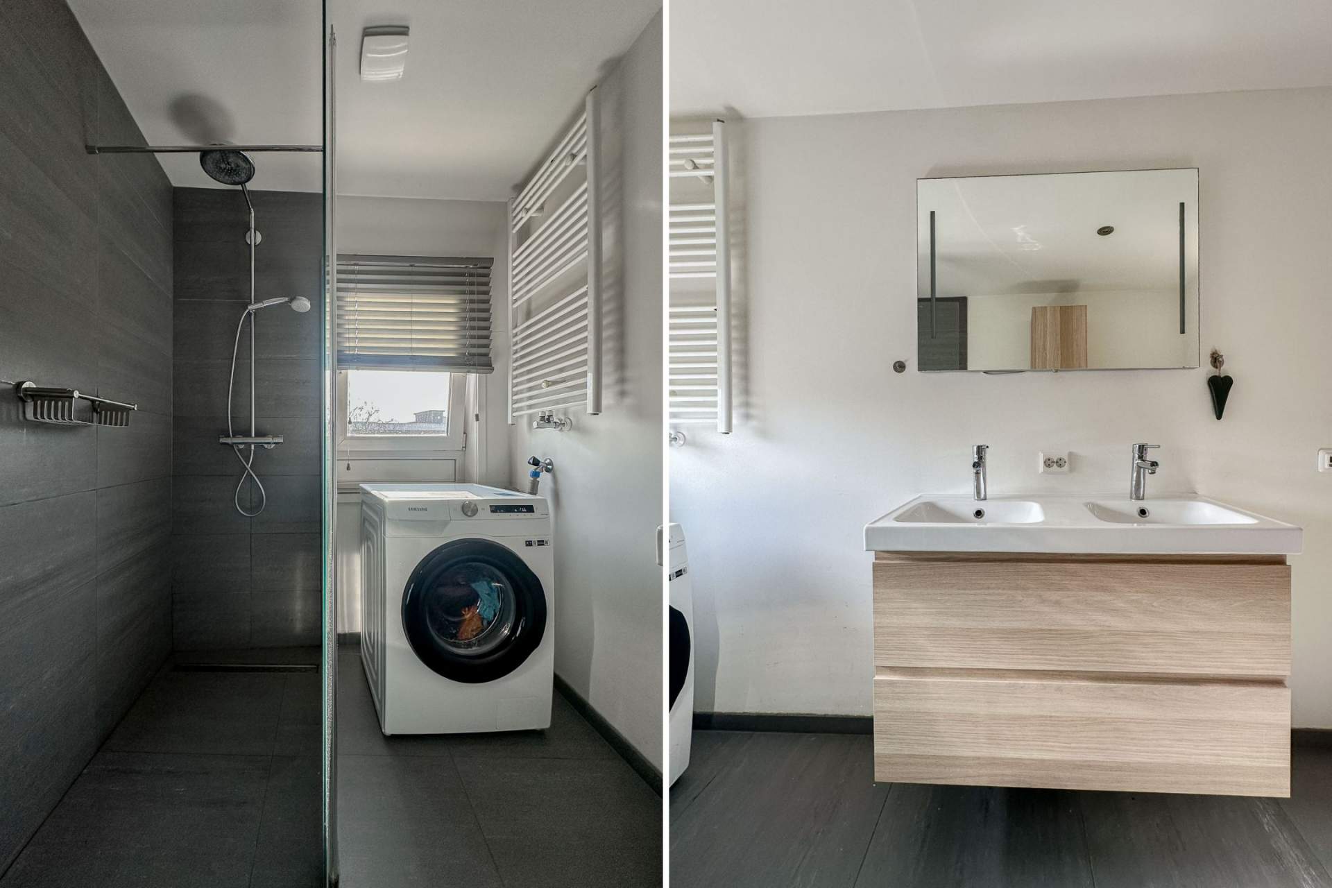 Op de overloop bevindt zich een ruime kastenwand die zorgt voor volop praktische opbergruimte. Daarnaast vind je hier de moderne en compleet uitgeruste badkamer, voorzien van een royale inloopdouche, een wastafel met fraai meubel en een toilet. In de badkamer zijn bovendien een wasmachine en droger aanwezig, wat zorgt voor extra comfort en gemak.