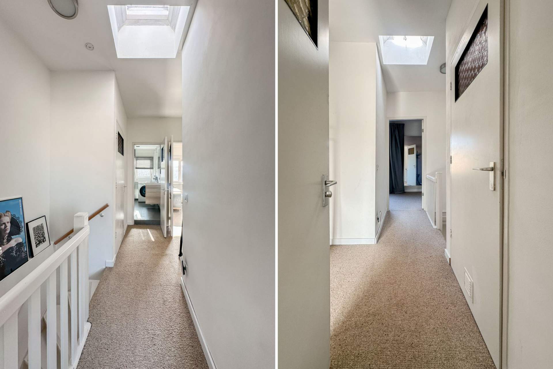 The second floor offers a pleasant and smart layout with two full-sized bedrooms. One room is stylishly furnished as a quiet home office, perfect for focused work. The other is a spacious and bright bedroom at the front of the house, with plenty of room for a large bed and extra closet space.