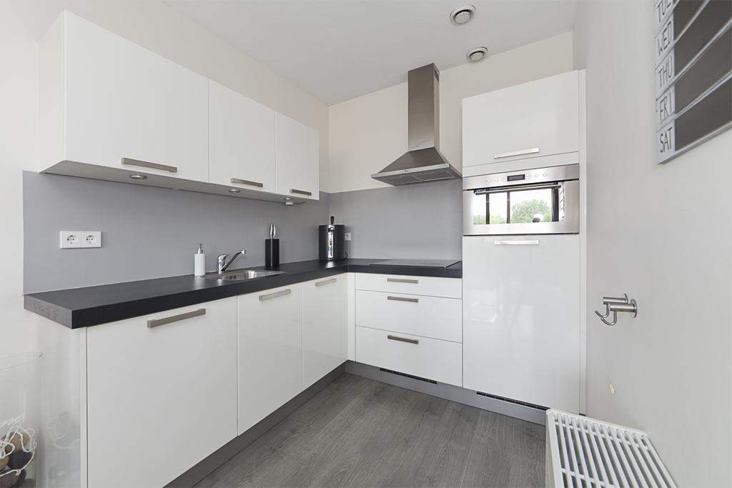 Deze is v.v. inbouwapparatuur, zoals een vierpits kookplaat, afzuigkap, combimagnetron, vaatwasser en koelkast met vriesvak.