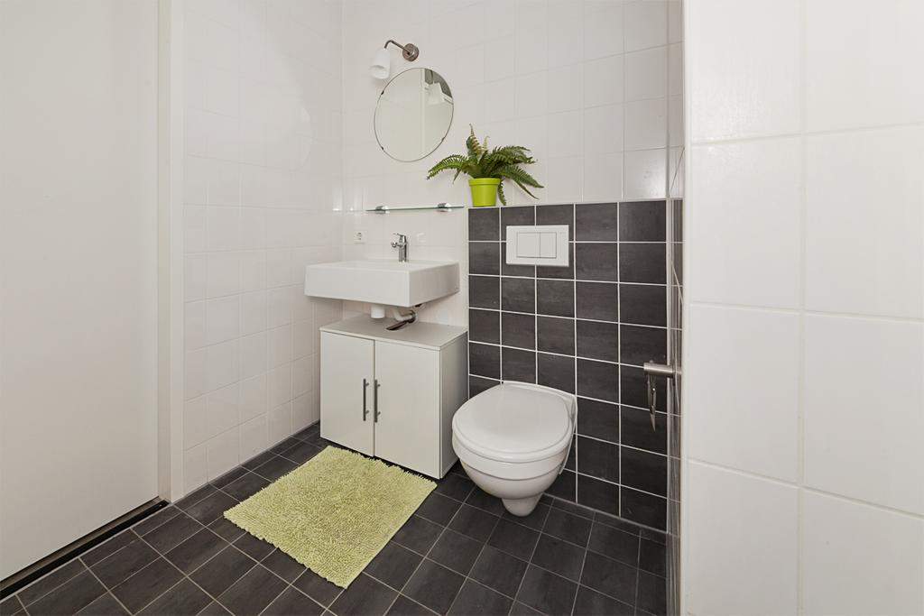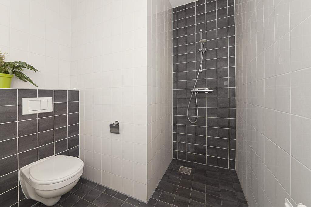 De slaapkamer ligt aan de woonkamer en is door de grote ramen licht. De volledig betegelde badkamer is v.v. een inloopdouche, toilet en een wastafel.