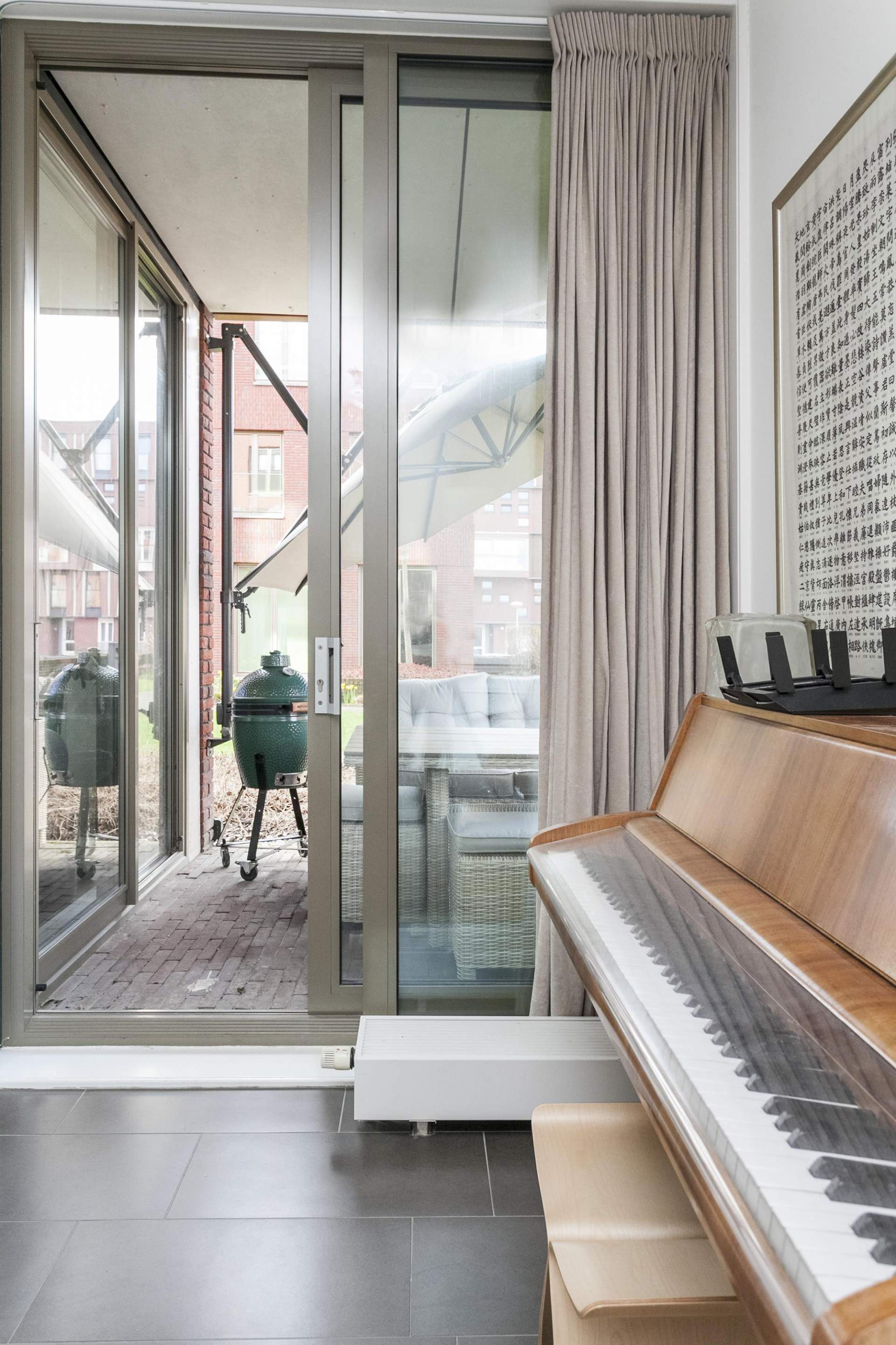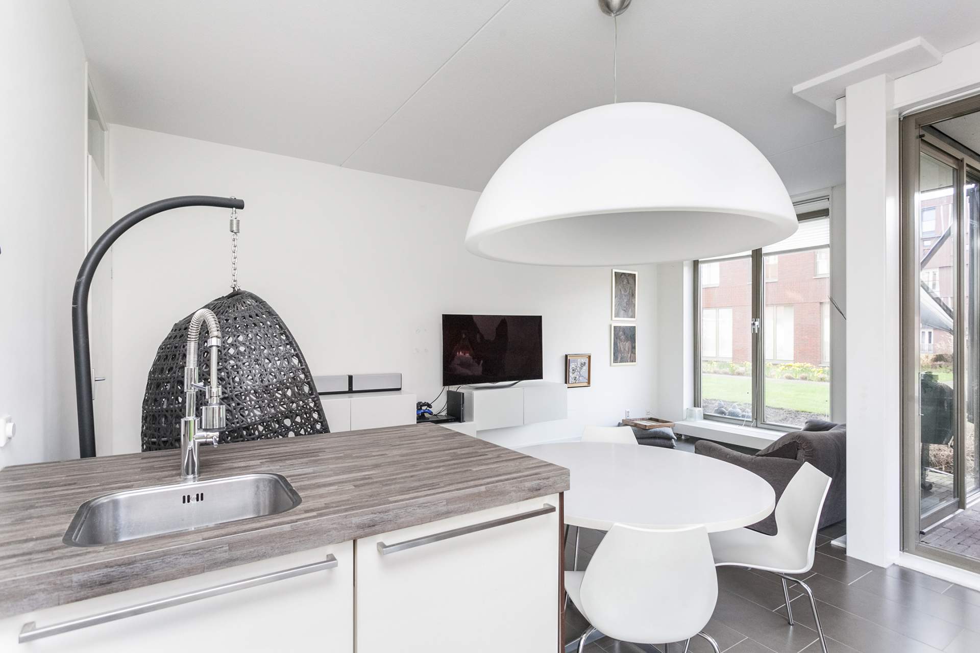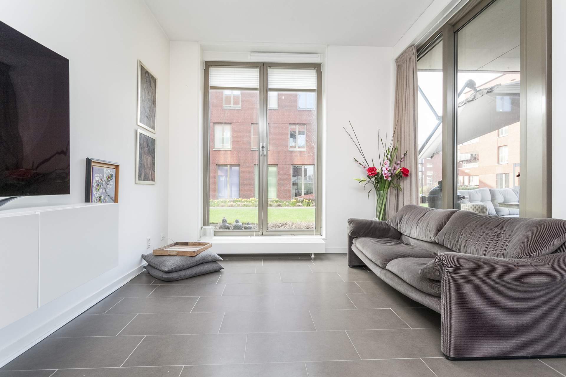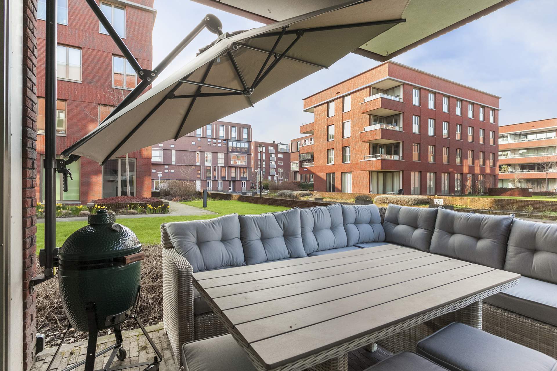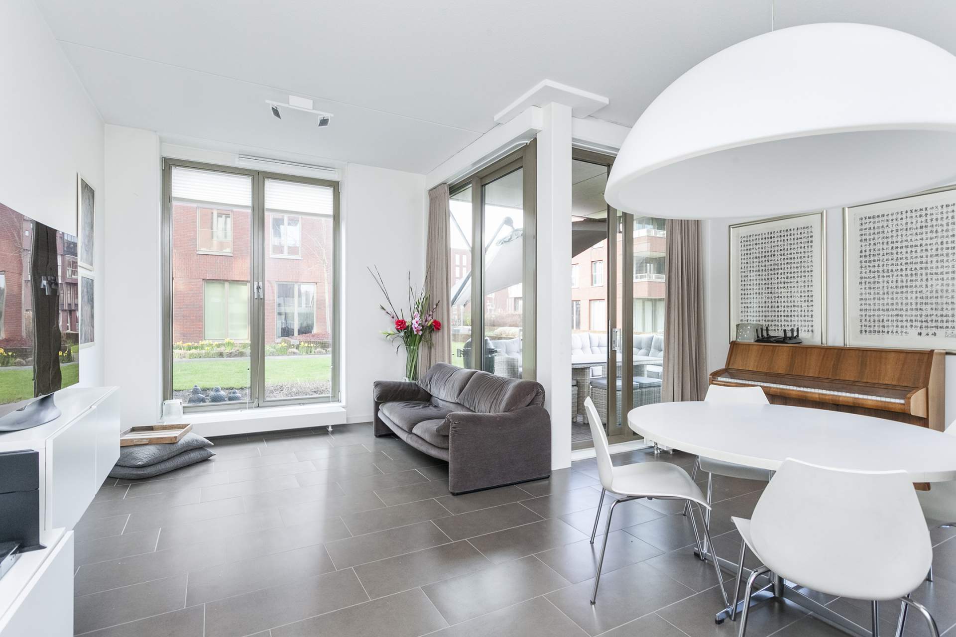 Entree, gang, wasruimte/berging, modern toilet met wandcloset, L-vormige woonkamer met luxe open keuken voorzien van diverse inbouwapparatuur, keramische kookplaat, combi-oven, vaatwasser en afzuigkap, koelkast met vriesvak, schuifpui naar zonnig terras (ca. 3.20 x 2.00m) grenzend aan de binnentuin, slaapkamer