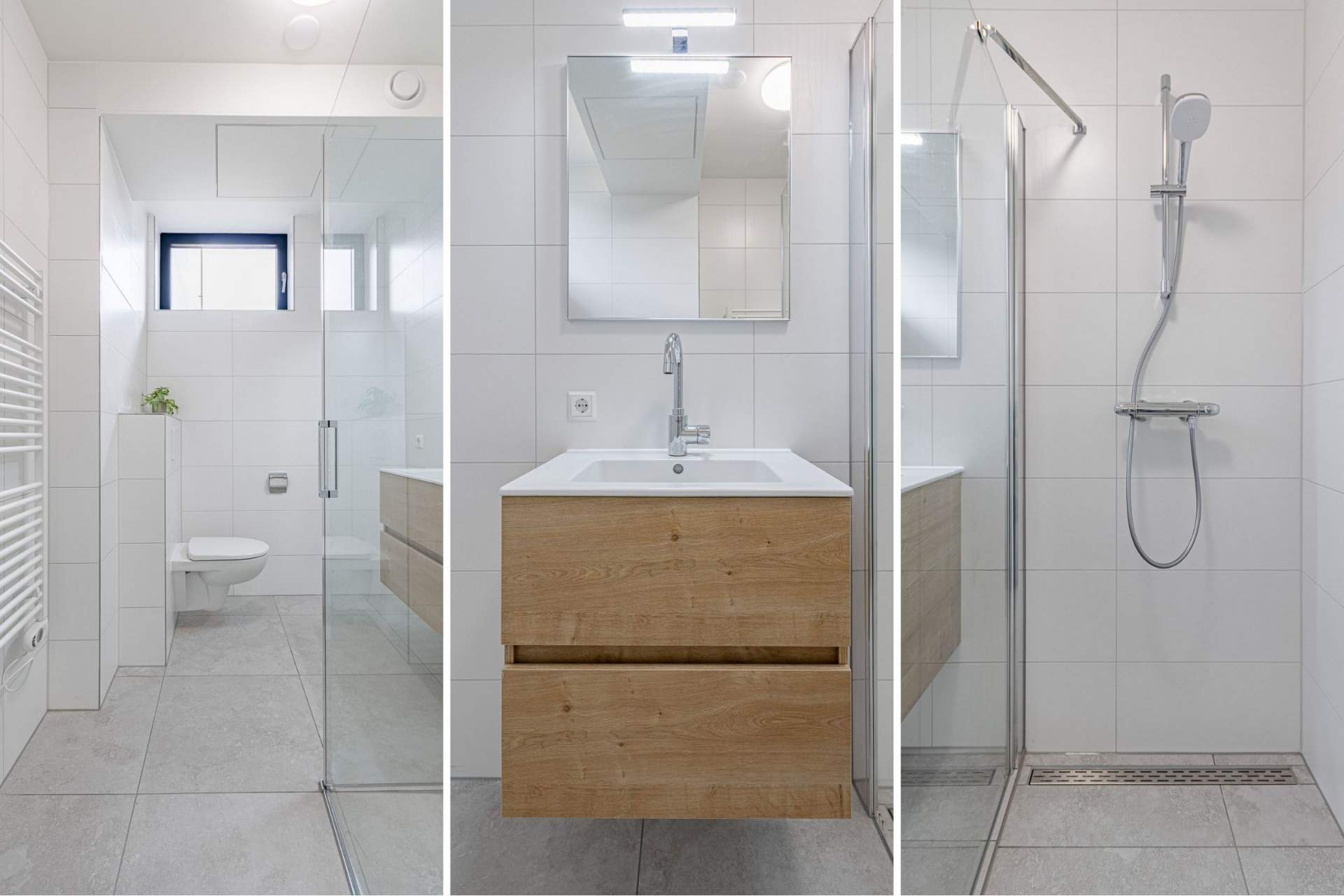 The home features a high-quality finish and includes a complete kitchen with various built-in appliances, including a refrigerator with freezer compartment, induction hob, and dishwasher. As a result, the kitchen is ready for immediate use and ideal for daily convenience. The bedroom offers ample space for a spacious double bed and a wardrobe, and is also equipped with air conditioning. The bathroom features a walk-in shower, a washbasin with vanity unit, a heated towel rail, and a toilet.