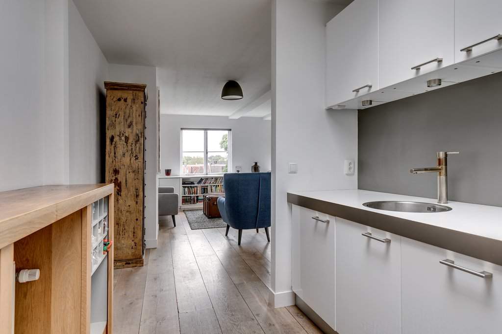 Entrance into the hall. The spacious living room gives a nice view of the inner gardens of the Nieuwegracht. Throughout the house lies a light oak floor with 28 cm wide boards. There is a very spacious bedroom with a double bed and wardrobe and beautiful outlook over the garden. Same applies for the second bedroom, which is also equipped with a double bed and a wardrobe. The semi open kitchen is a stylish and comes with a fridge with freezer, dishwasher, oven, extractor hood and an induction hob. The washing machine and dryer are located in the utility room. The bathroom has a shower, toilet and a double sink.