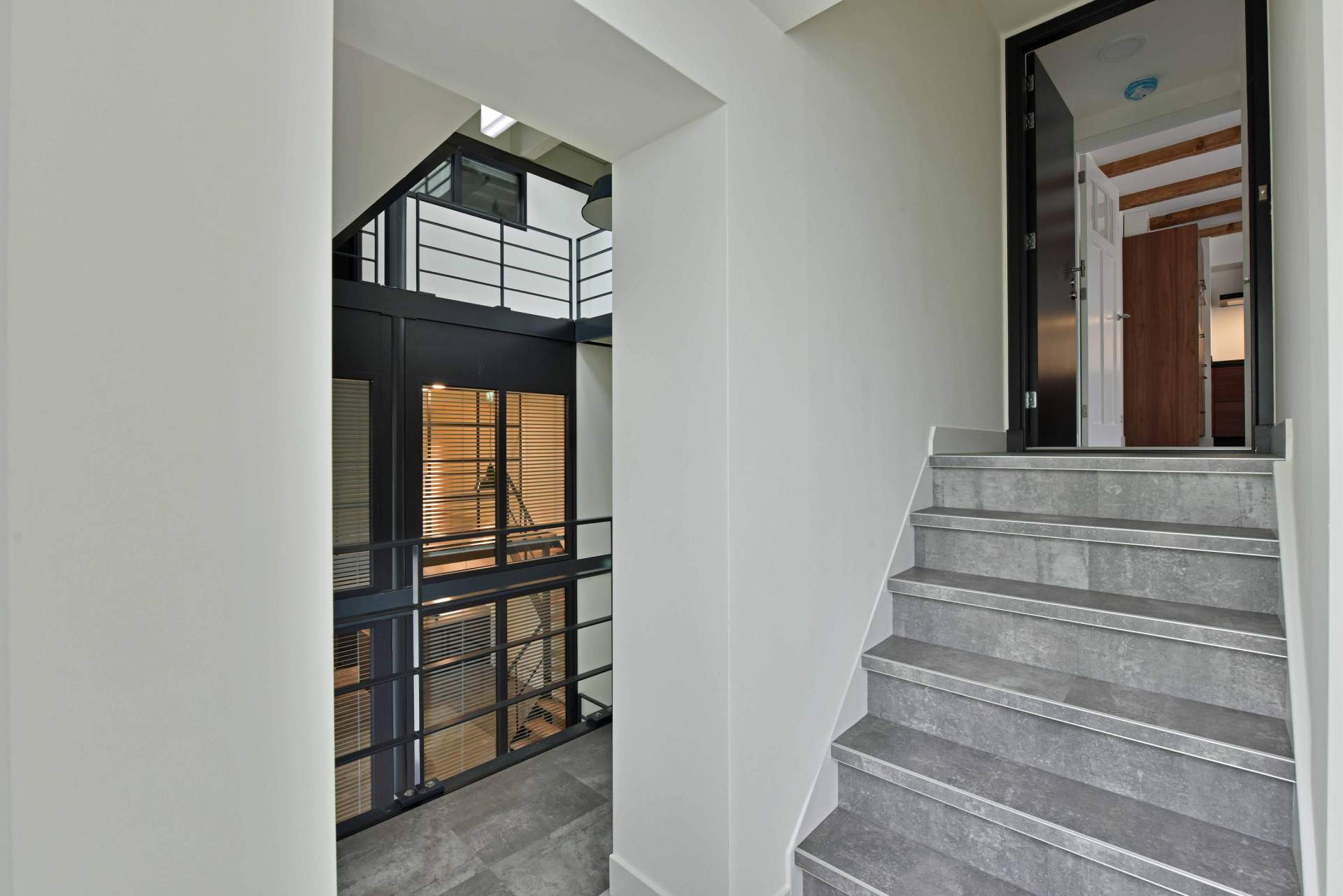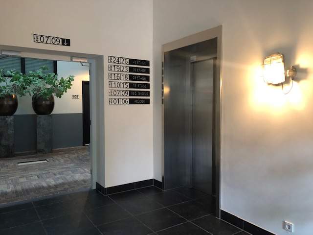 Gezamenlijke afgesloten hal met brievenbussen met lift en trappenhuis naar verdiepingen.