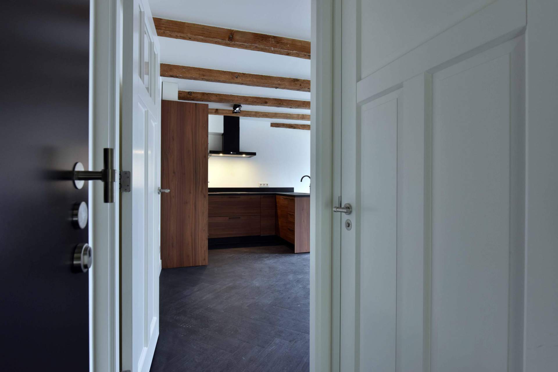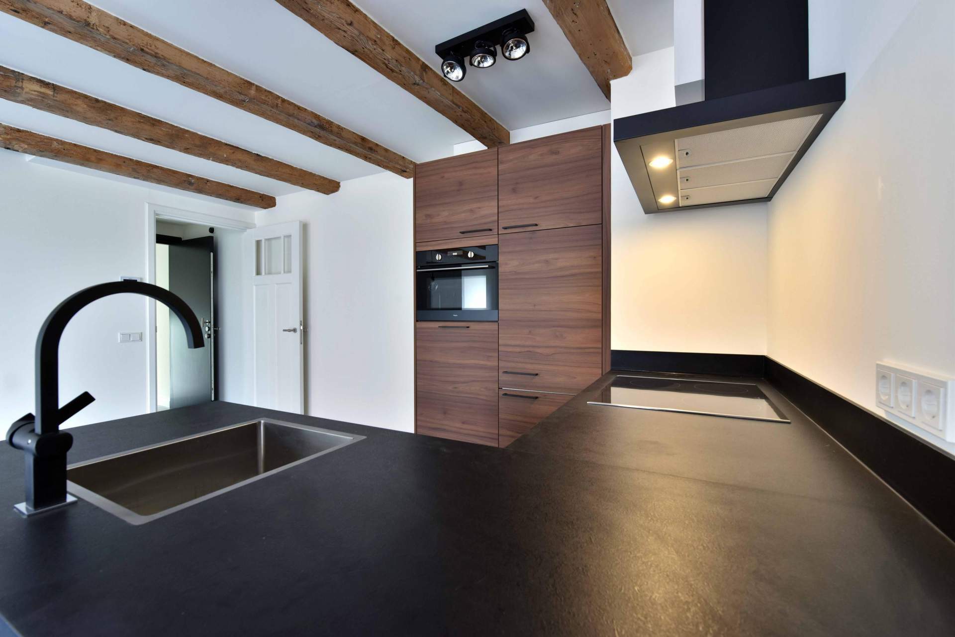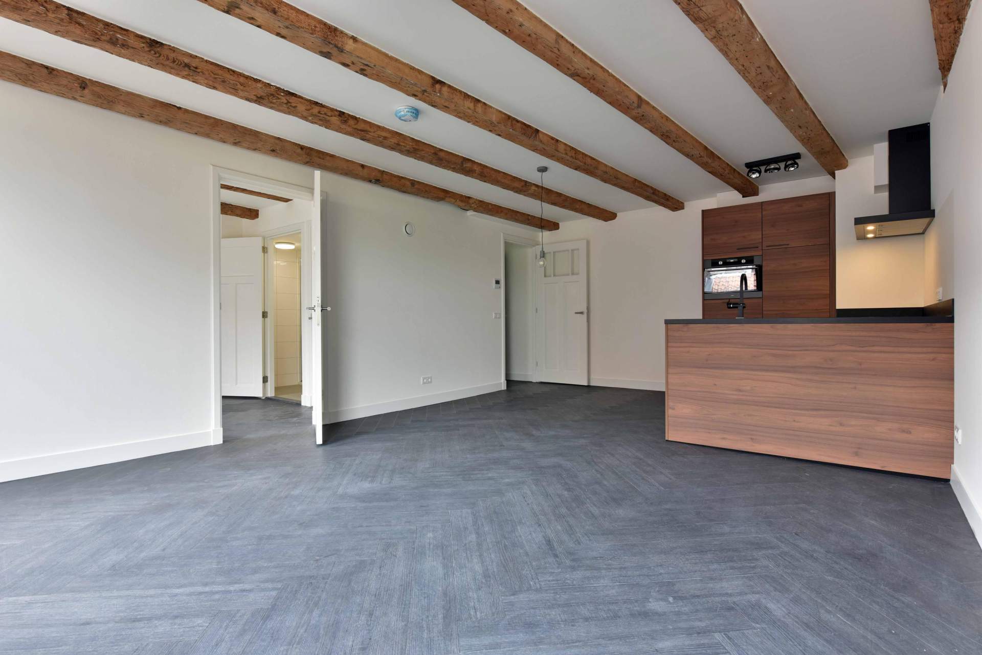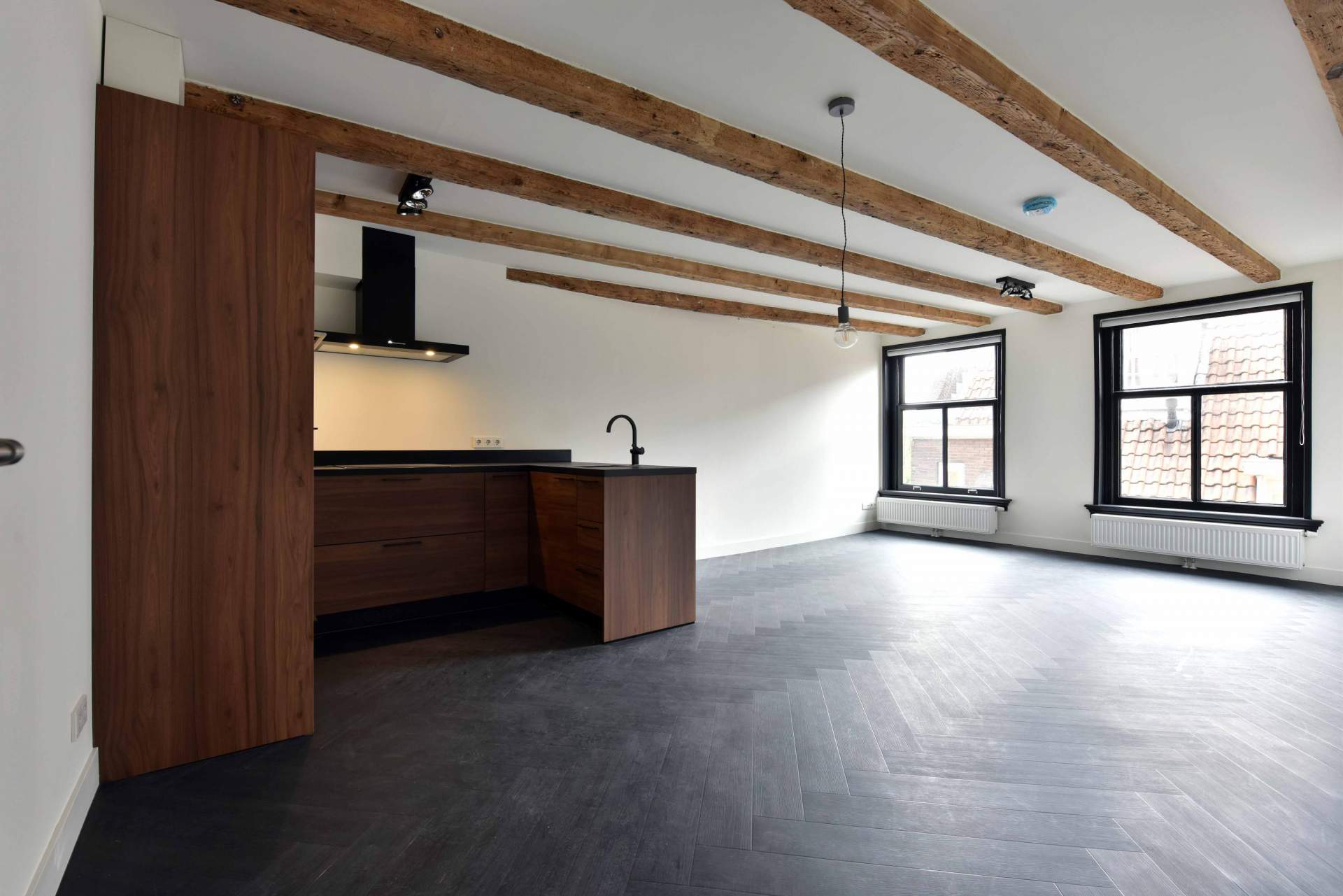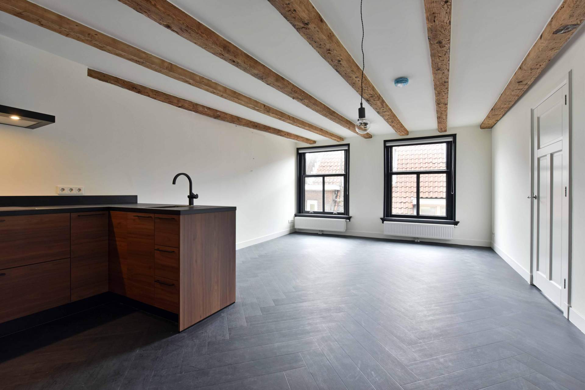 Eigen opgang, entree appartement, grote en luxe open woon-/eetkeuken met prachtig balkenplafond en grote ramen met zicht op de Oudegracht. Deze ruimte is dus verrassend licht en ruim. Koken kan met gebruik van de grote open luxe keuken met kookeiland en alle inbouwapparatuur te weten; koelkast met vriesvak, combi-oven/magnetron, vaatwasser, afzuigkap en kookplaat.