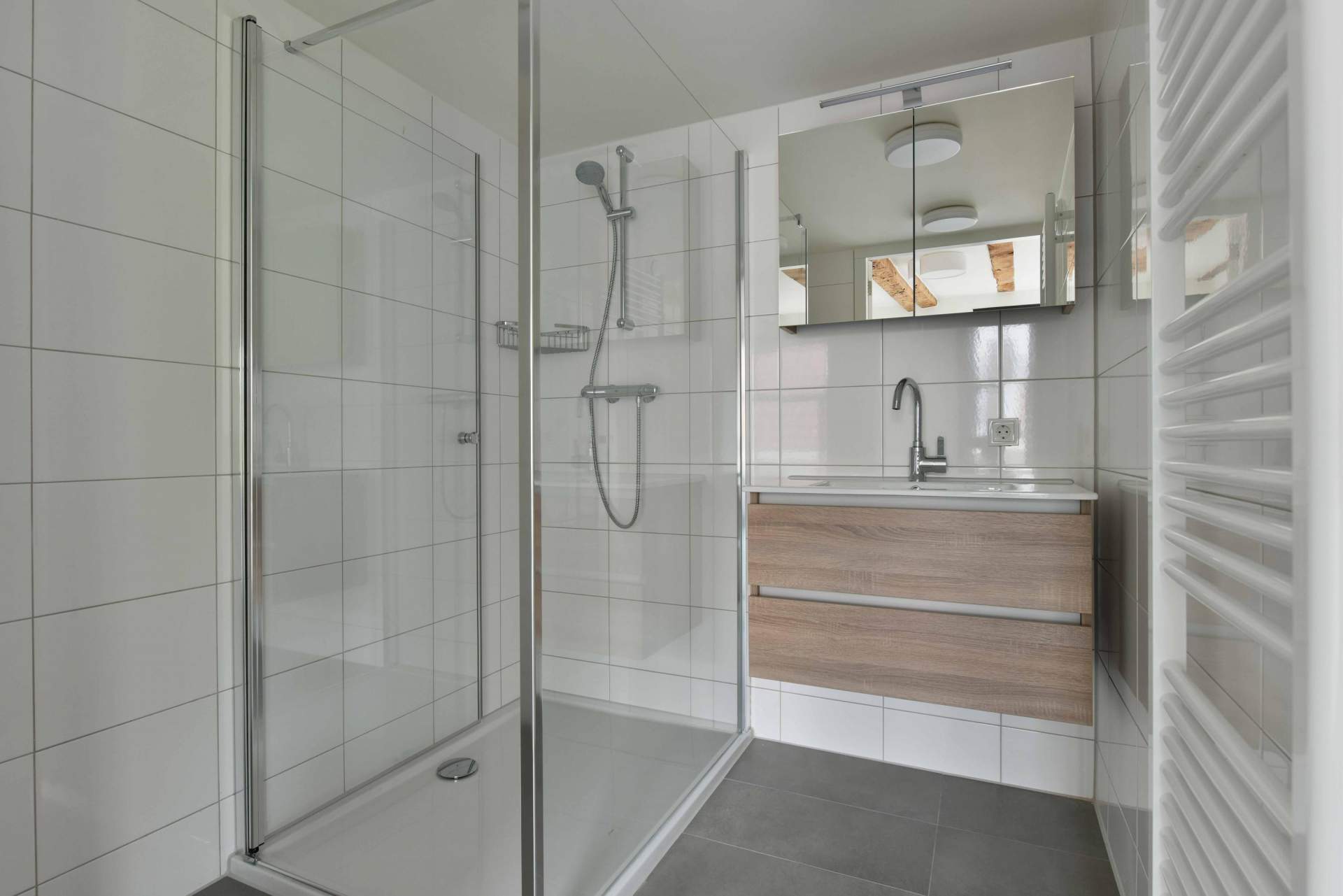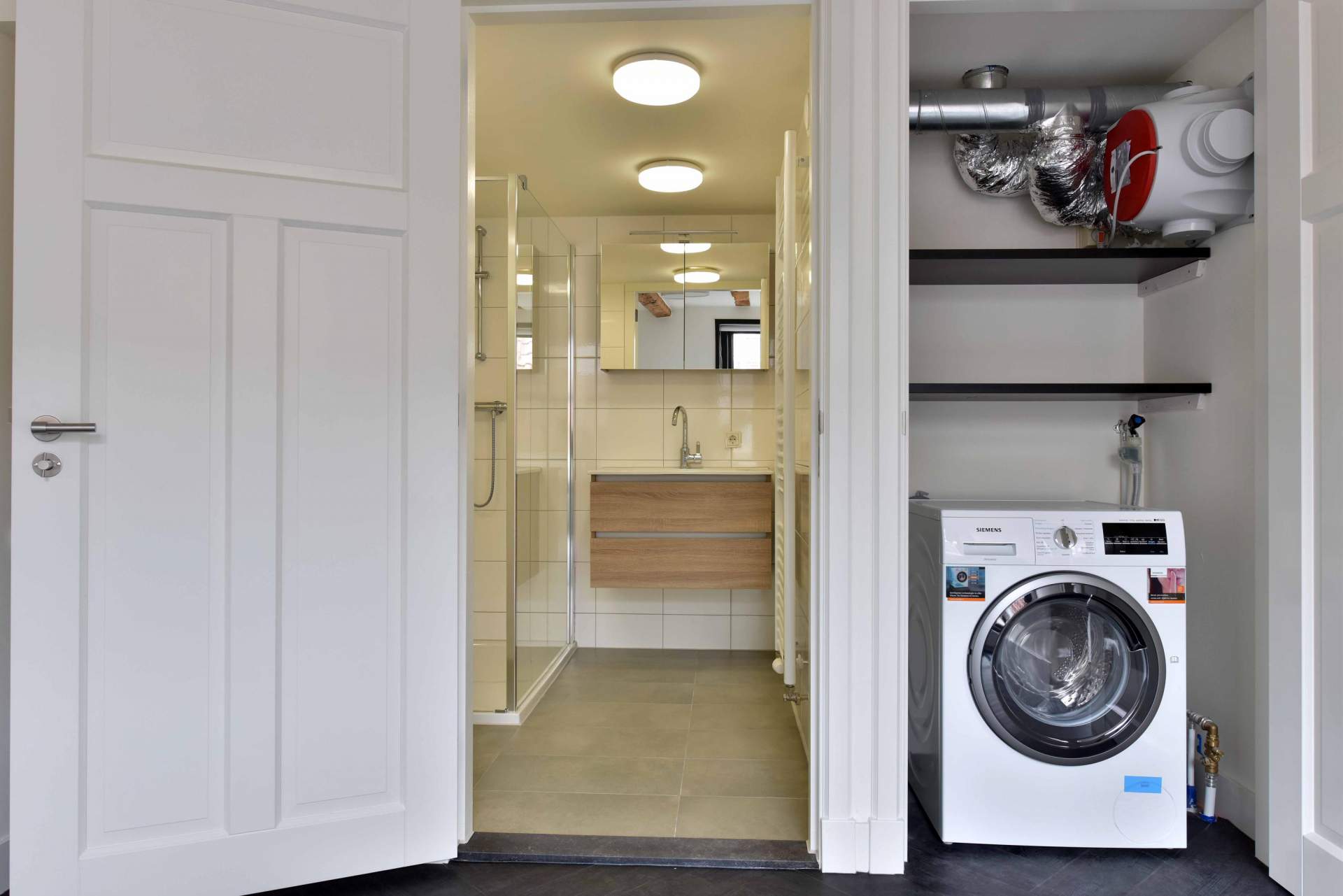 Separate toiletruimte v.v. fonteintje. Deur naar mooie slaapkamer. Vanuit de slaapkamer is er een inloop badkamer te bereiken, deze beschikt over een grote wastafelmeubel met lades, spiegel en ruime douche. Kortom een luxe en hotelgevoel op unieke locatie.