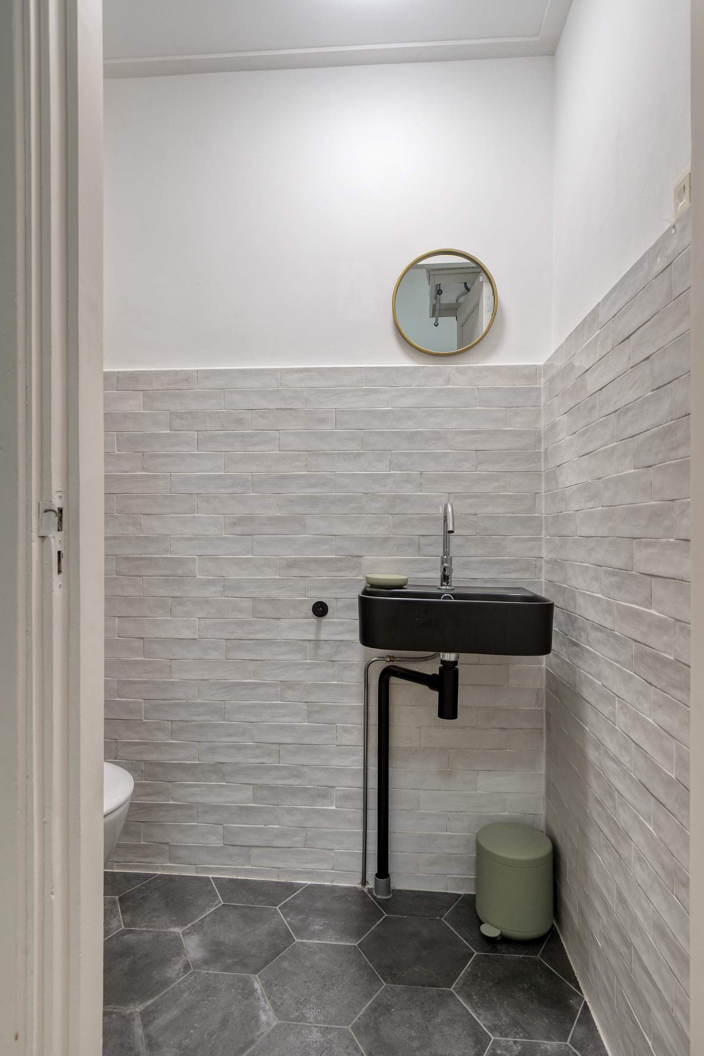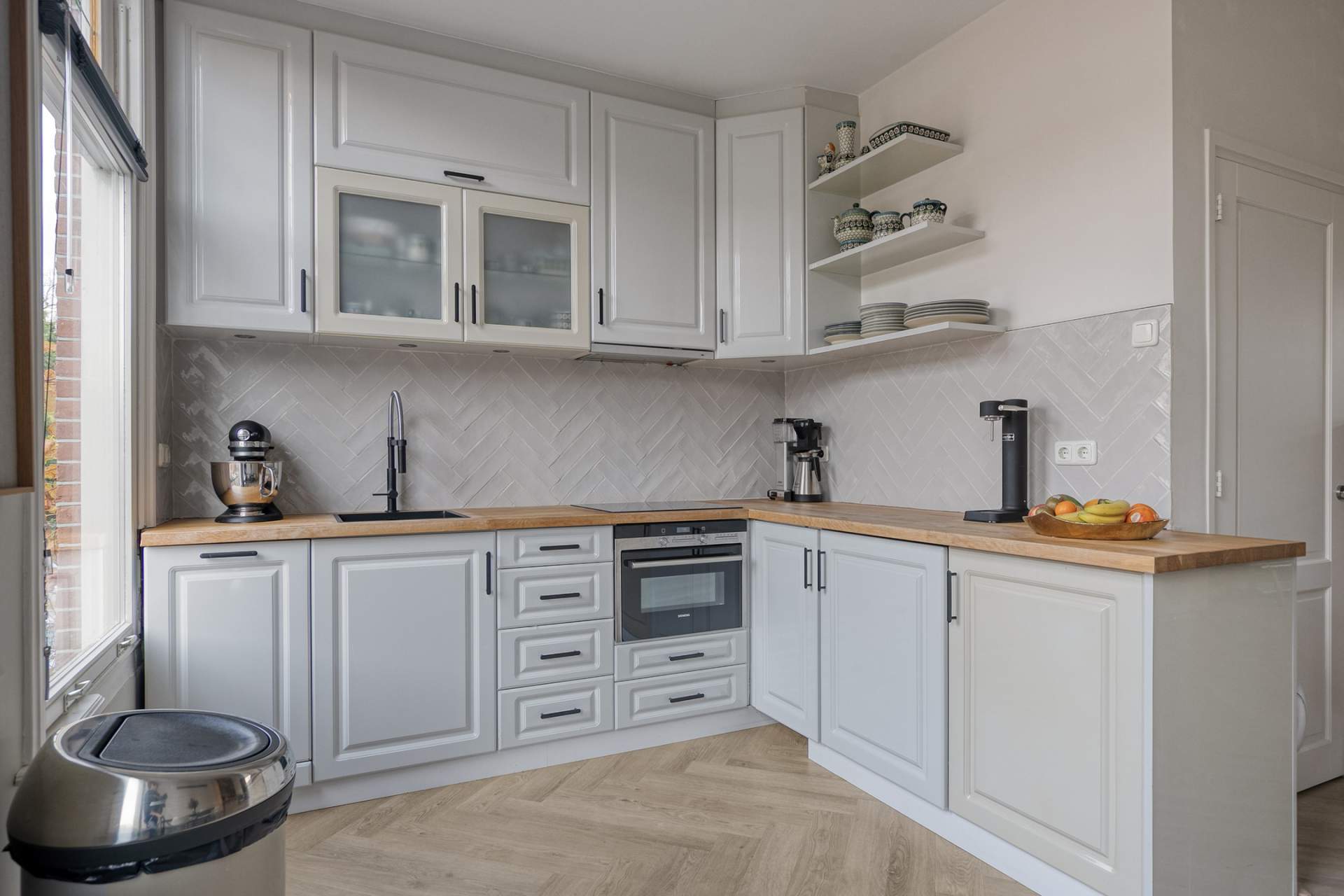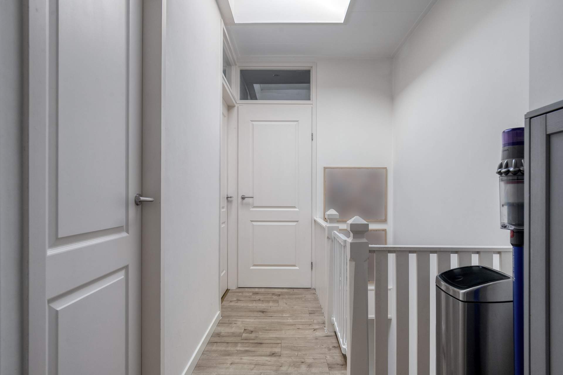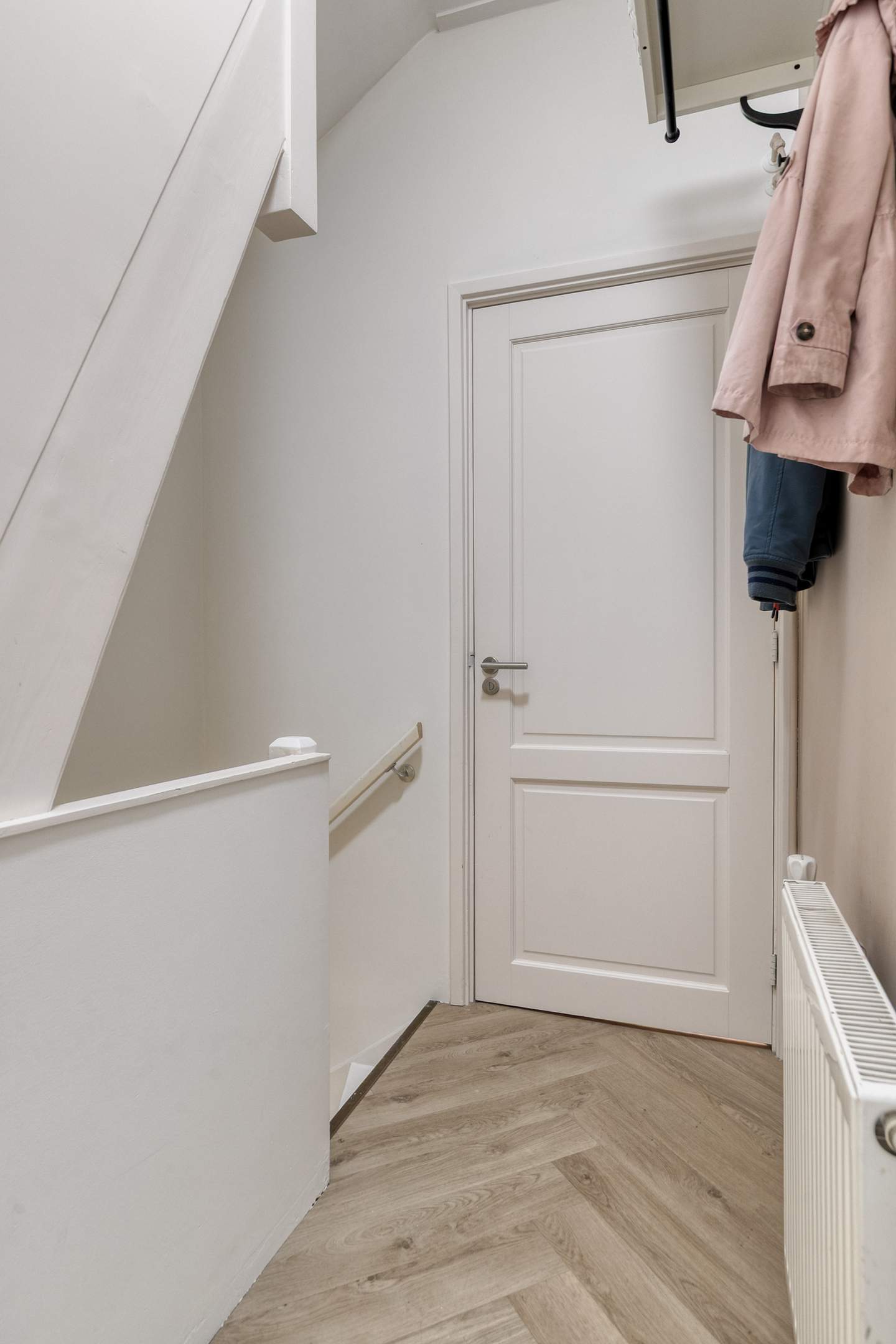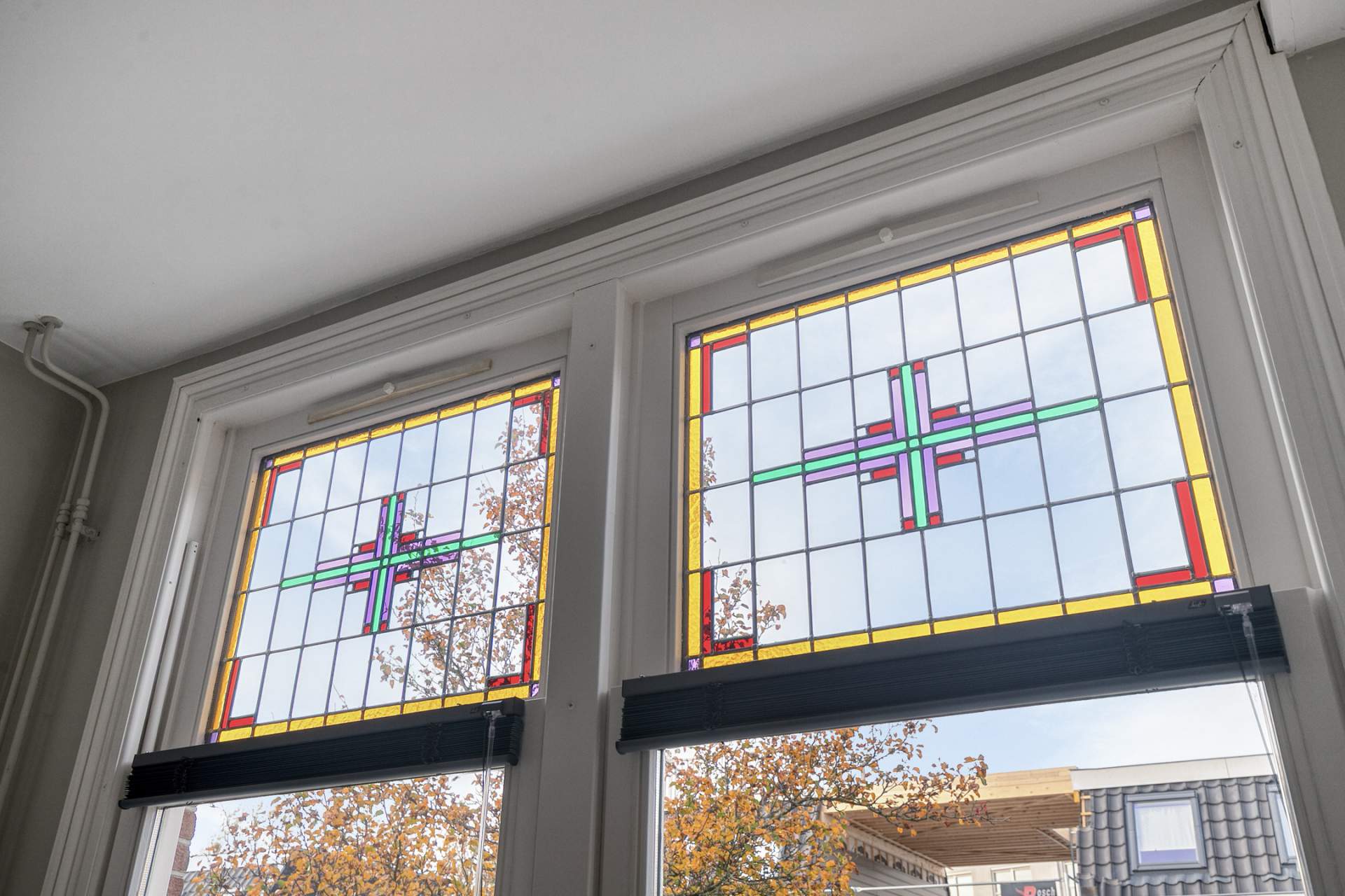 Overloop met garderobe en ruim, modern toilet met fonteintje, royale, lichte woonkamer met hoog plafond en een heerlijke open (woon)keuken met veel ramen aan de voorzijde. De hoge ramen aan de voorzijde, maken extra sfeer door het glas-in-lood.