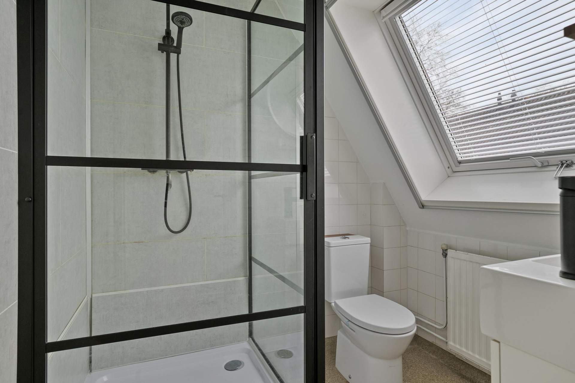 Overloop met toegang tot een nette badkamer met inloopdouche, toilet en wastafelmeubel en een ruime slaapkamer aan de voorzijde met dakkapel.