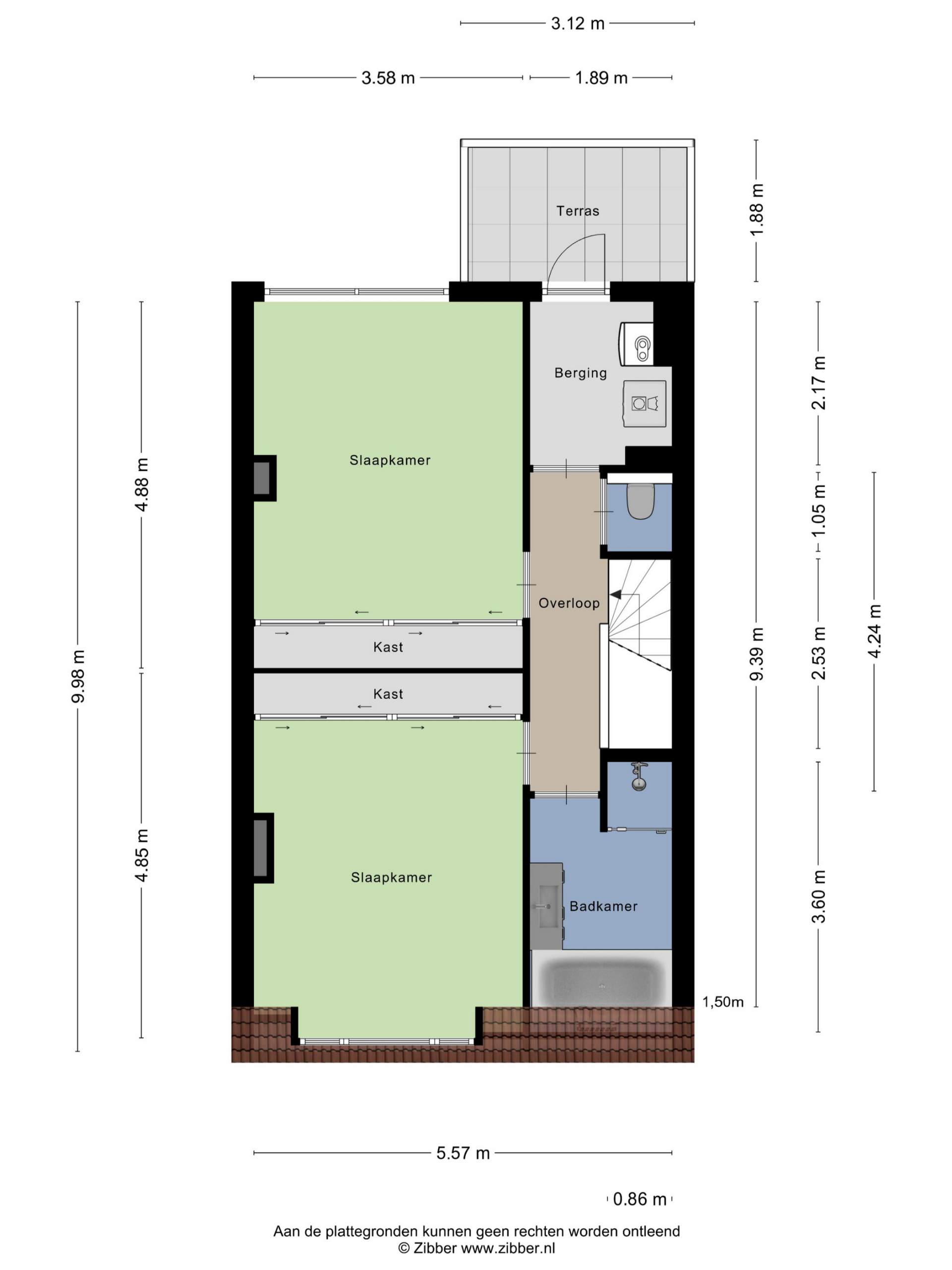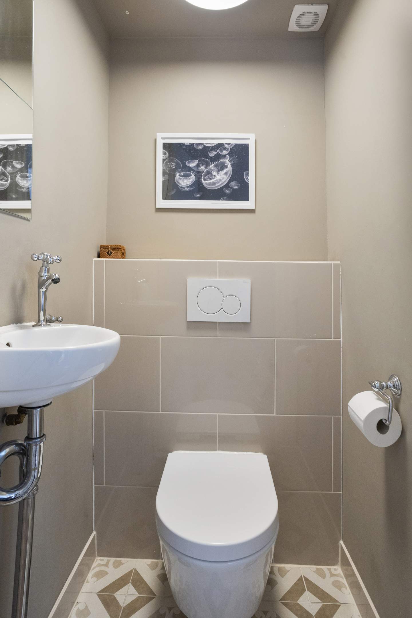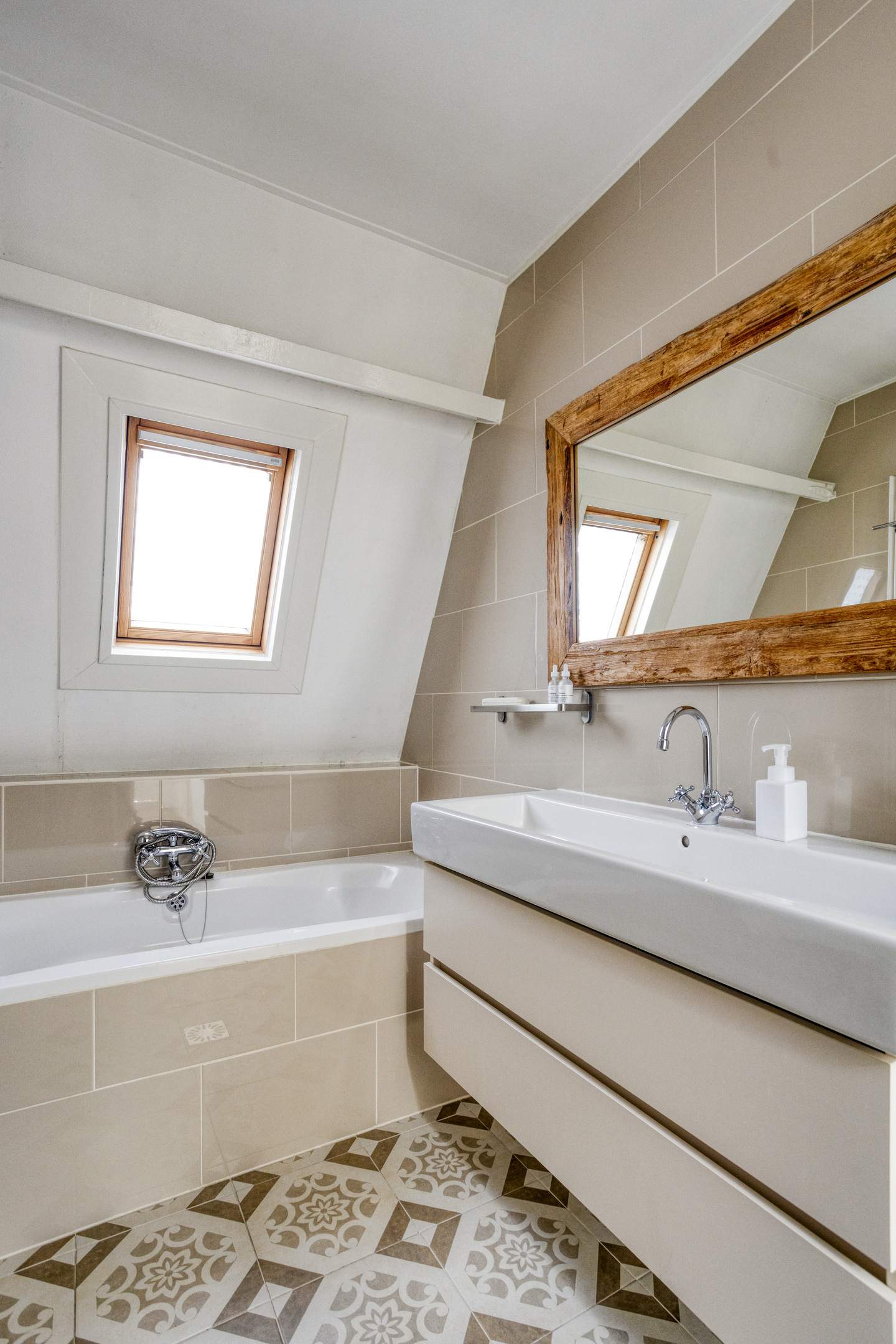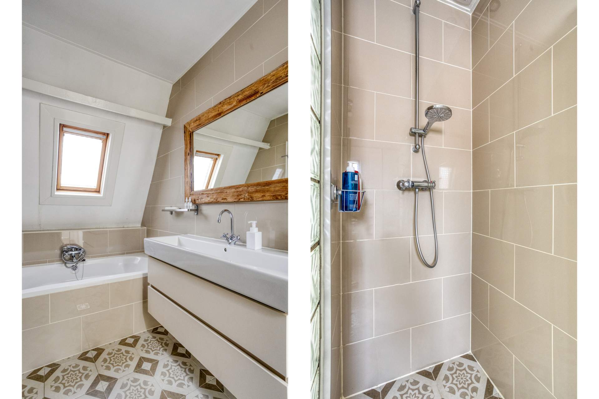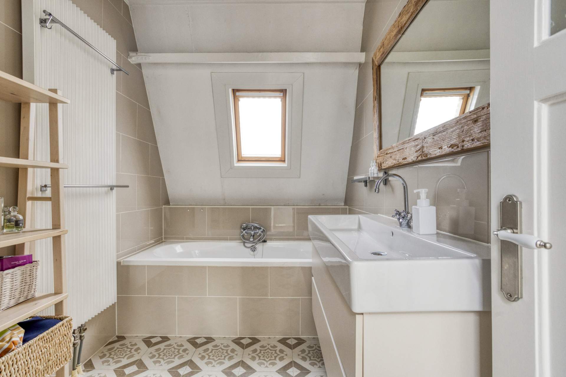 Overloop met daklicht, tweede toilet en een praktische wasruimte met cv-ketel en toegang tot het tweede dakterras, eveneens op het zuidwesten. Twee slaapkamers met laminaatvloer en vaste kastenwanden. De moderne badkamer is voorzien van een ligbad, aparte inloopdouche, wastafel en designradiator.