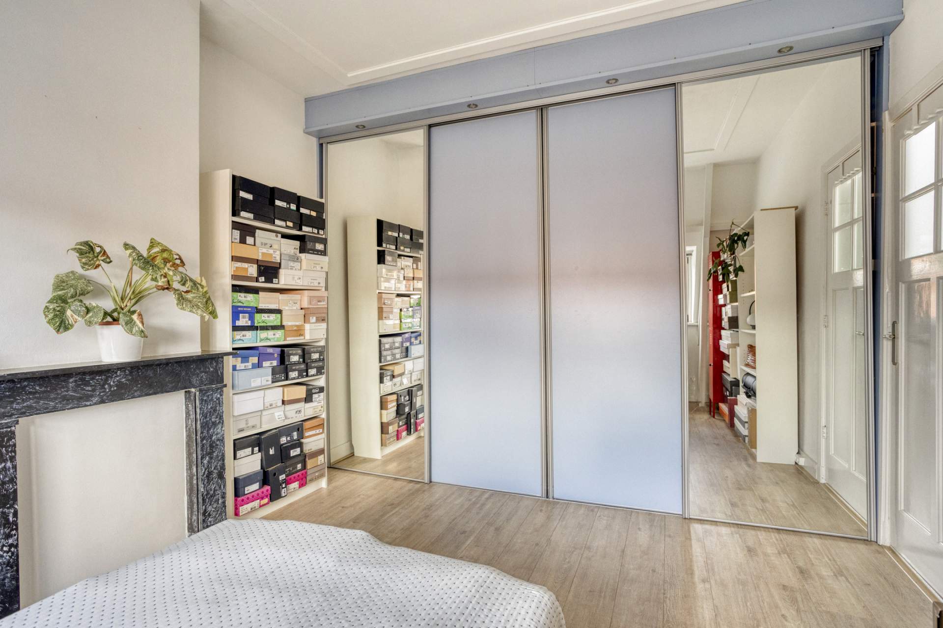 Ruime overloop met garderobekast en toiletruimte. De royale, lichte woonkamer heeft een hoog plafond, een prachtige lamelparketvloer, een sfeervolle erker en een doorgebroken zijkamer met toegang tot een klein balkon aan de voorzijde. De open keuken is modern en uitgerust met inbouwapparatuur: een gasfornuis, oven (2019), vaatwasser, koel-vriescombinatie (2018) en afzuigkap. Vanuit de keuken bereikt u het eerste – zeer ruime – dakterras, ideaal gelegen op het zuidwesten.