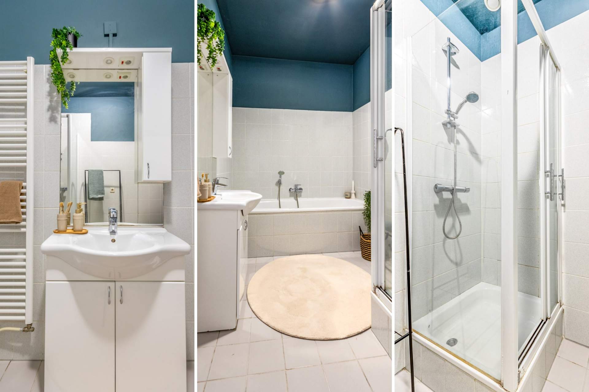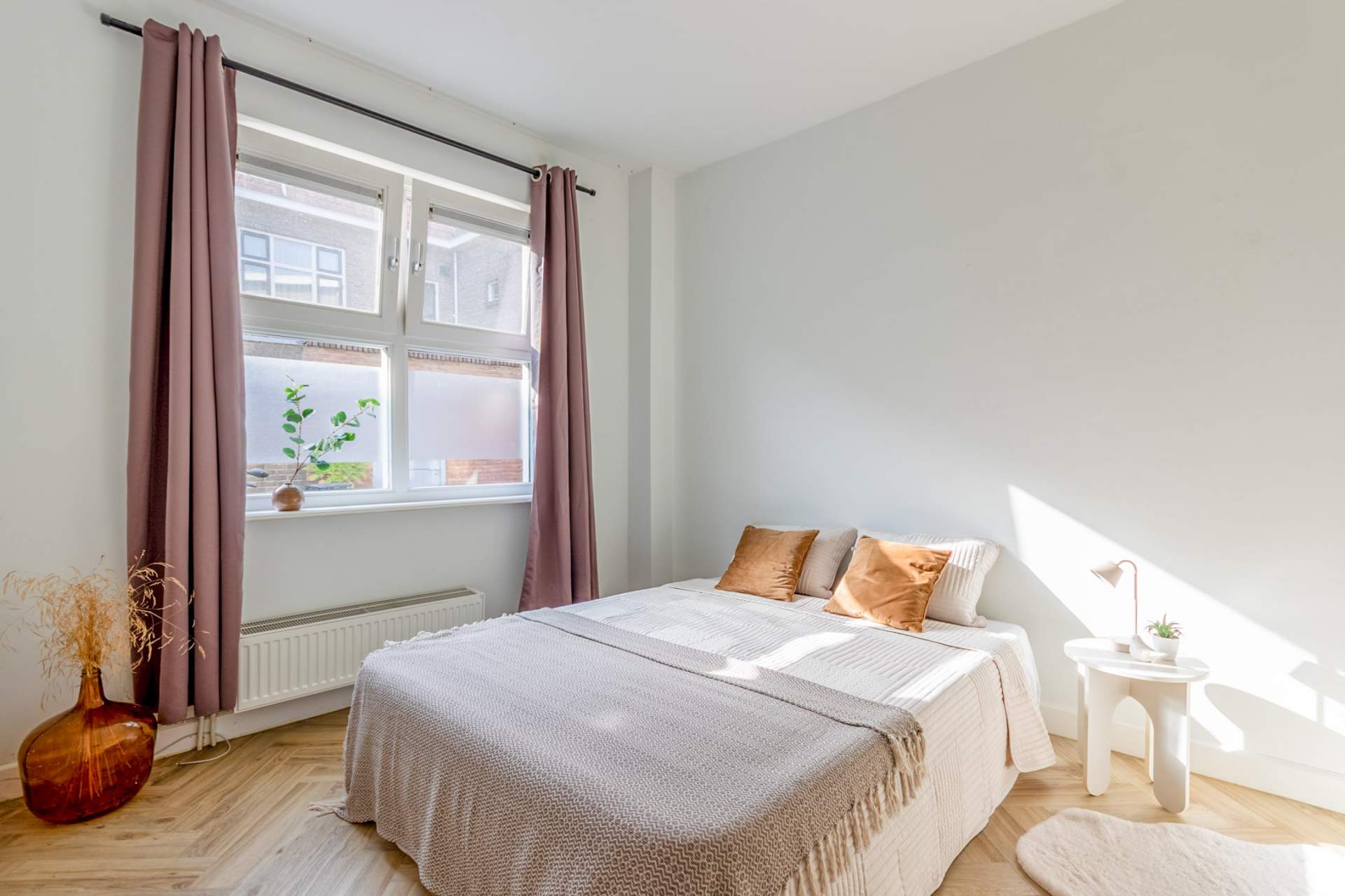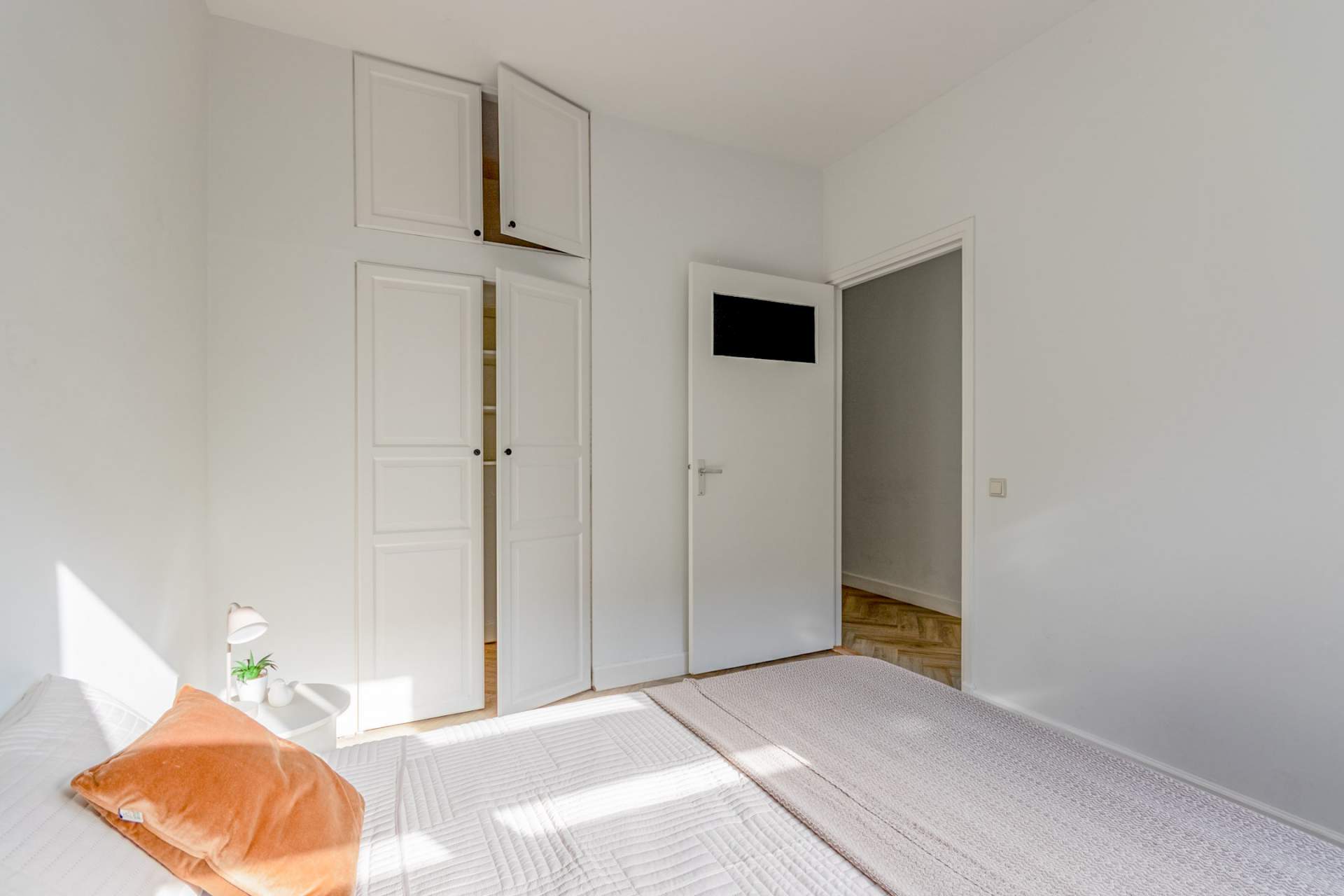 De ruime slaapkamer ligt aan de rustige zijde van de woning. De badkamer is ruim en voorzien van ligbad, douchecabine, wastafel met meubel, aansluitingen voor wasmachine en droger