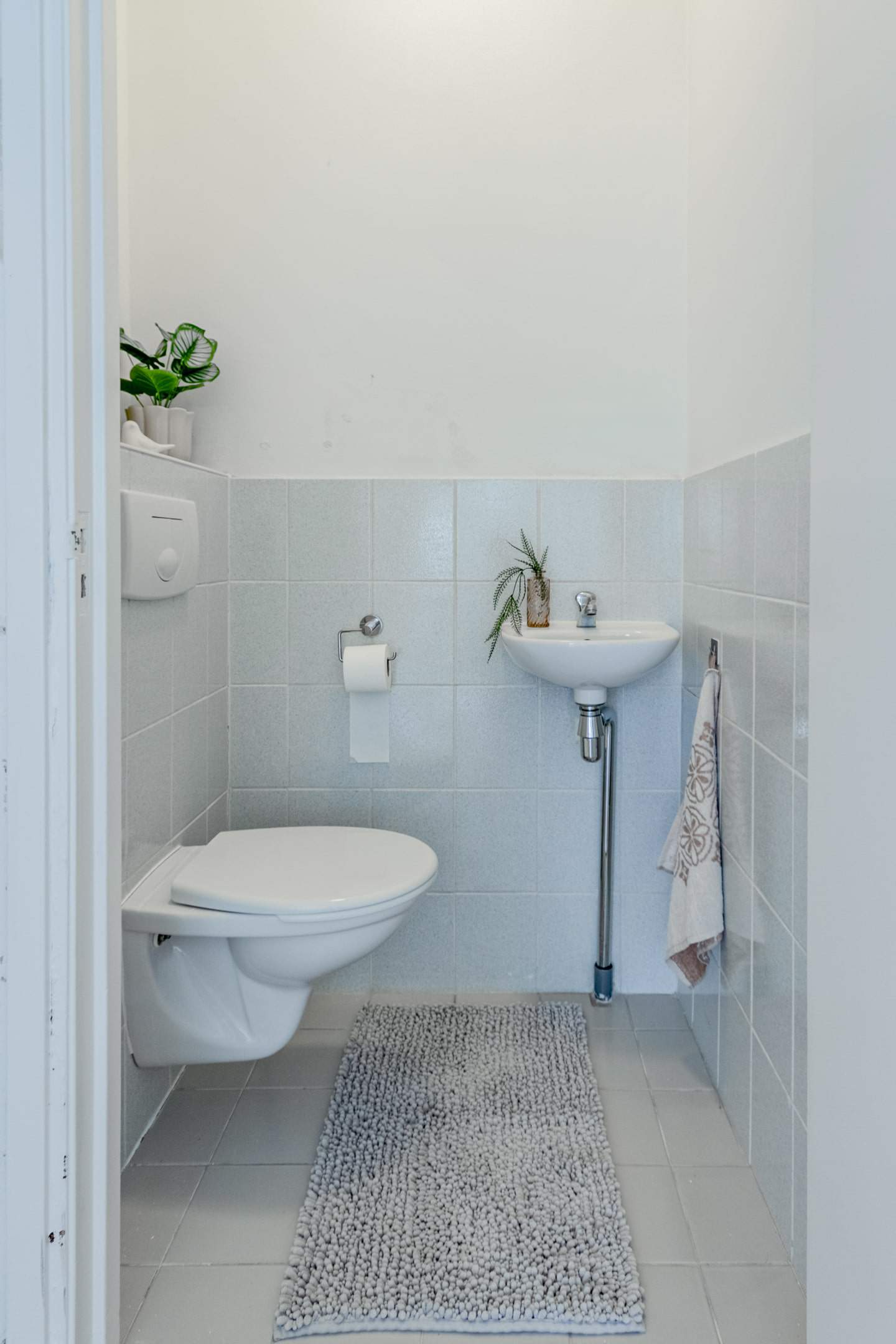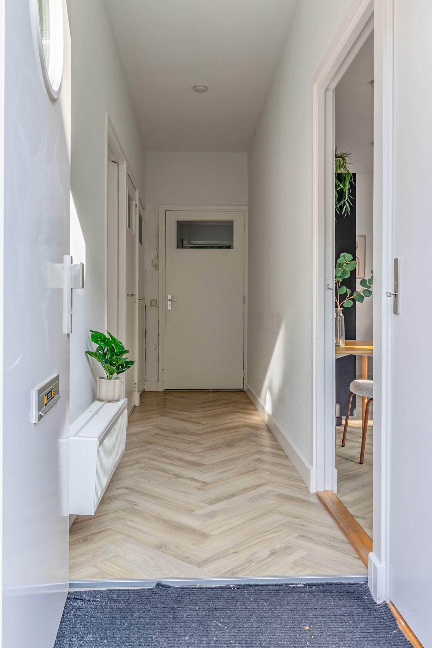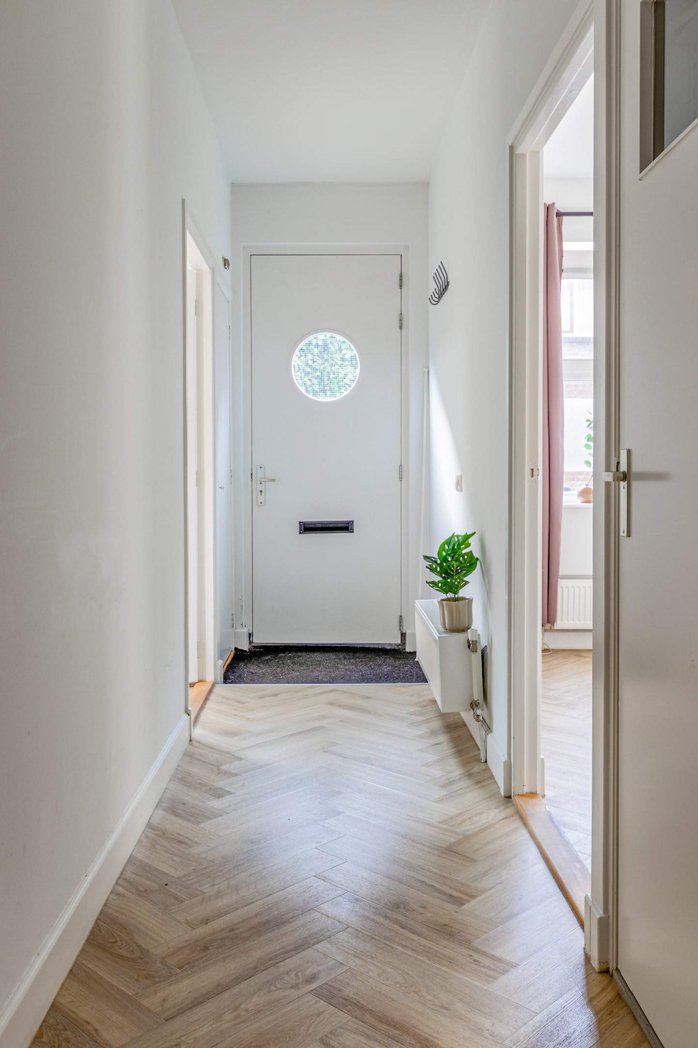 Je komt binnen via een ruime hal met modern toilet en een praktische was-/bergruimte. Hier is ook plek voor een kapstok en zelfs ruimte om een fiets aan de muur te hangen.