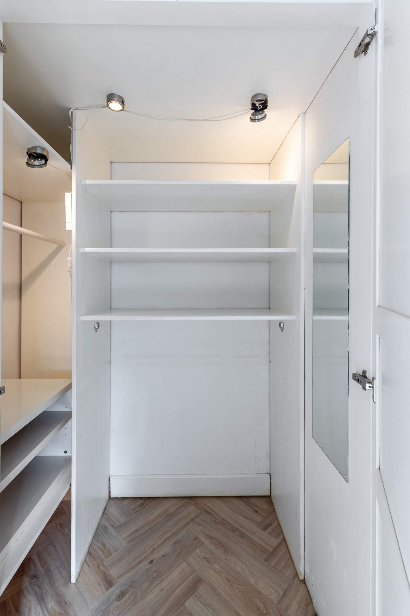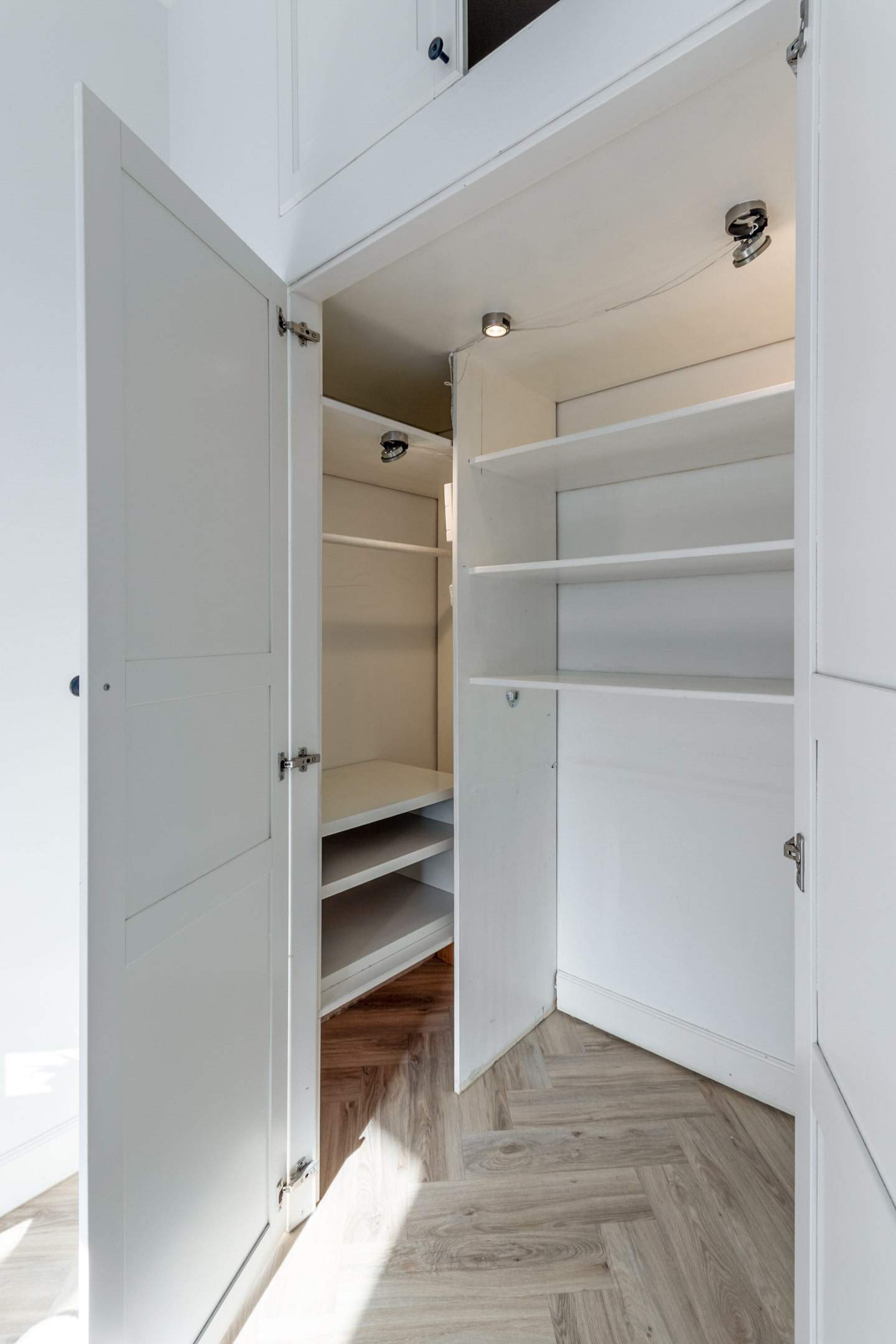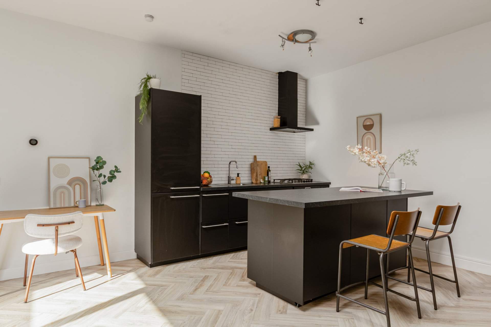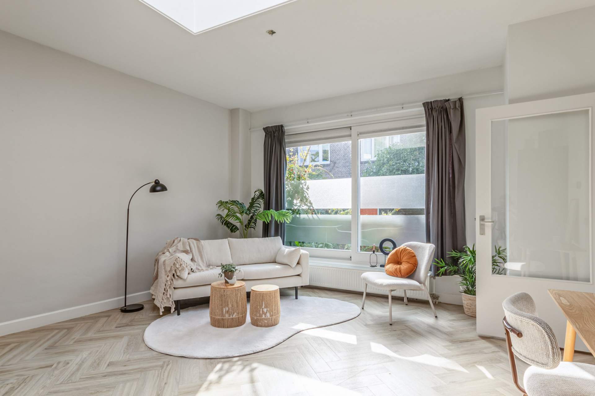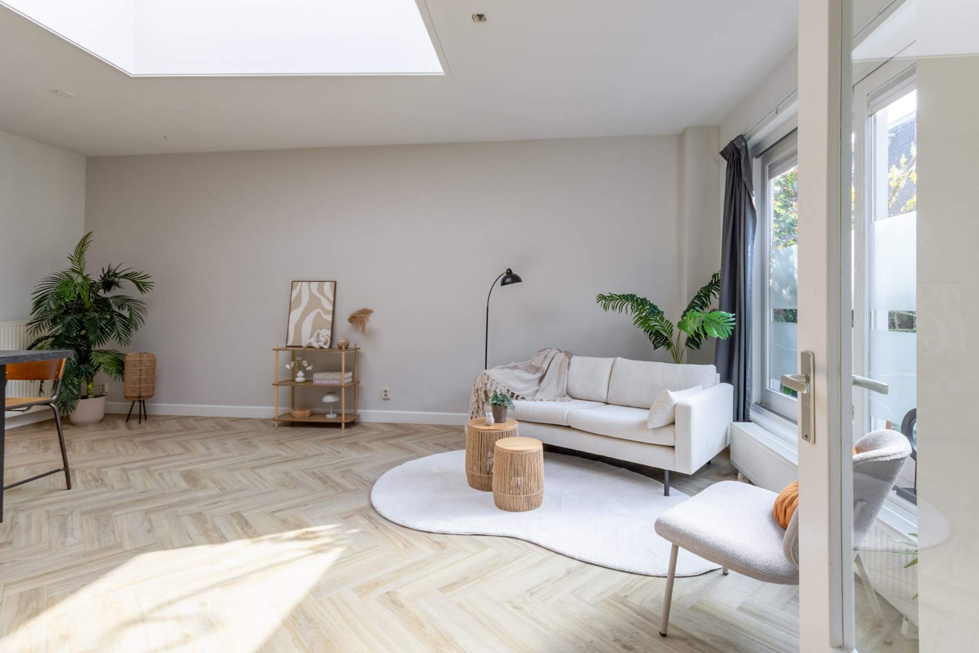 De lichte, royale woonkamer met sfeervolle visgraat pvc-vloer straalt warmte uit en biedt ruimte voor een gezellige zithoek en eethoek. Dankzij het grote raam aan de voorzijde en een dakraam is er veel natuurlijke lichtinval.