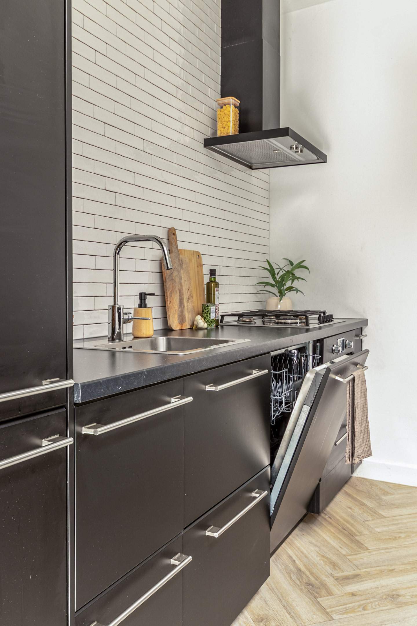 De moderne open keuken is uitgerust met koel-/vriescombinatie, 4-pits gasfornuis, vaatwasser, afzuigkap, combi oven/magnetron, voldoende opbergruimte, barelement voor extra sfeer en gebruiksgemak.