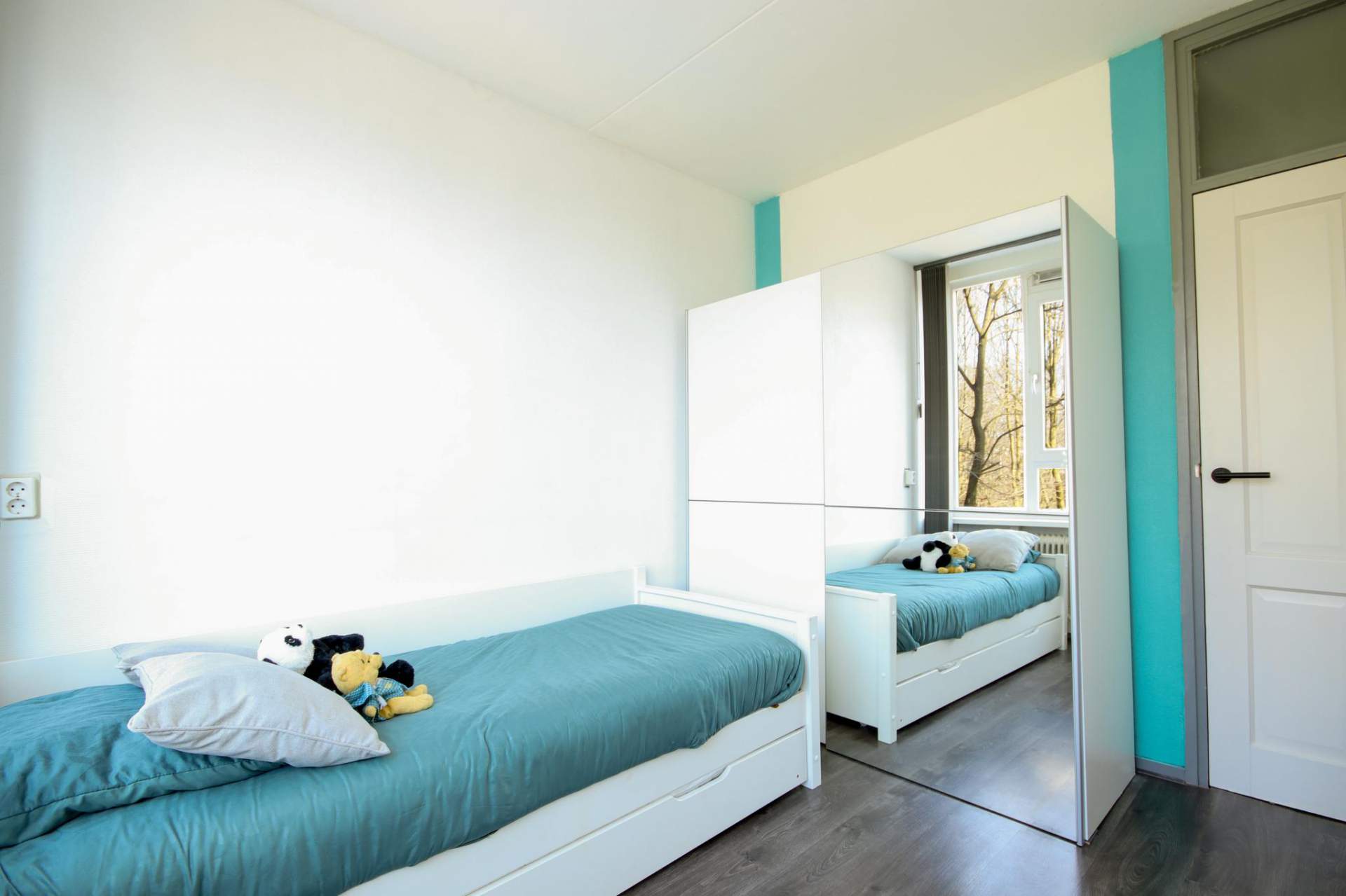 Via de hal bereik je de zeer ruime woonkamer met balkon (zuid-oost) aan de achterzijde met zicht op groen. De grote ramen geven de ruimte enorm veel licht. De overloop naar de slaapkamers is afgesloten door een deur in de woonkamer. De ruimte achter de woonkamer is voorzien van twee heerlijke slaapkamers, een ruim apart zwevend toilet met kleine wastafel en een heerlijke badkamer met ruime wastafel met meubel, spiegelkast, handdoekradiator, douche en extra kastruimte.