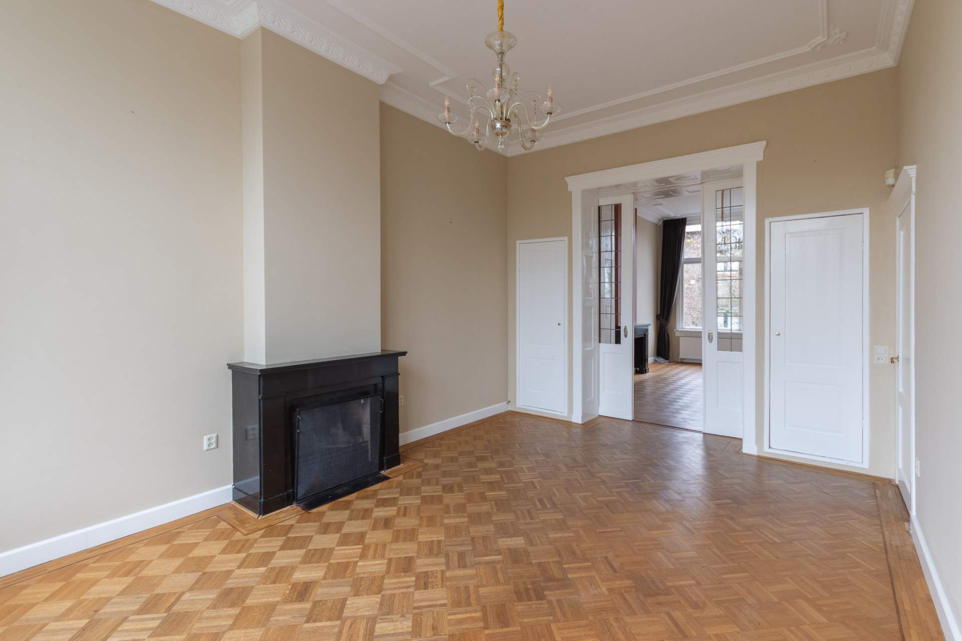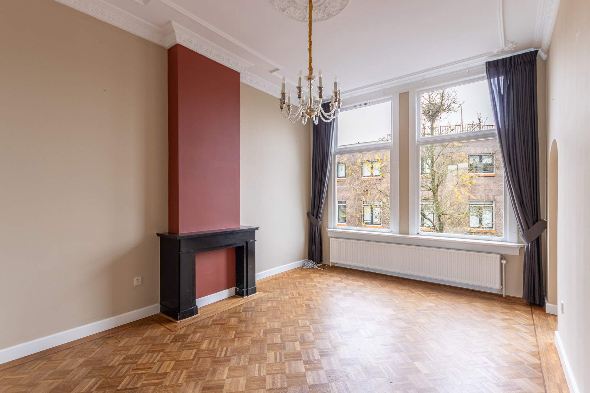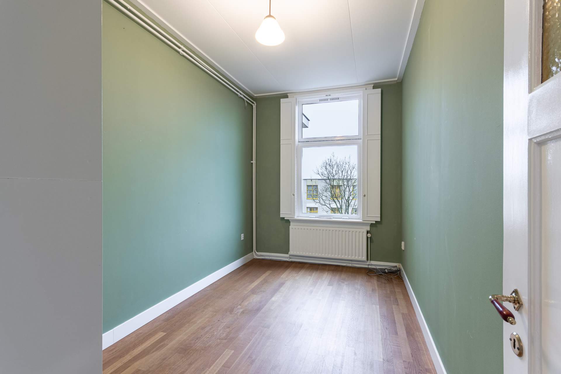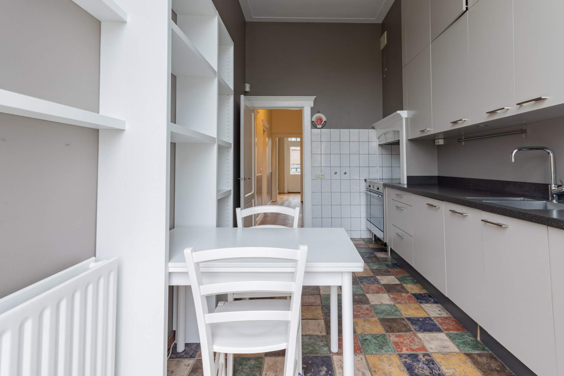 De prachtige kamer-en-suite is voorzien van glas-in-lood schuifdeuren en vaste kasten, wat zorgt voor een klassieke en warme uitstraling. De voorkamer heeft een ornamenten plafond, een zwart marmeren schouw en twee grote ramen met vrij uitzicht over de rustige straat. Aangrenzend bevindt zich een extra kamer, speels verbonden middels een toog, ideaal als werk-, speel- of studeerkamer. Aan de voorzijde zijn tevens openslaande deuren naar een klein balkon met avondzon.