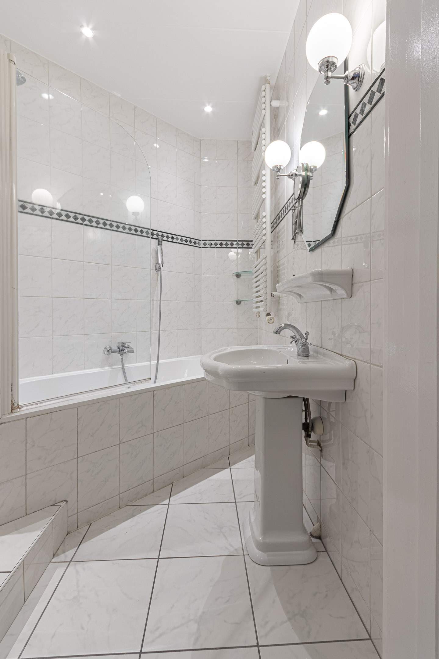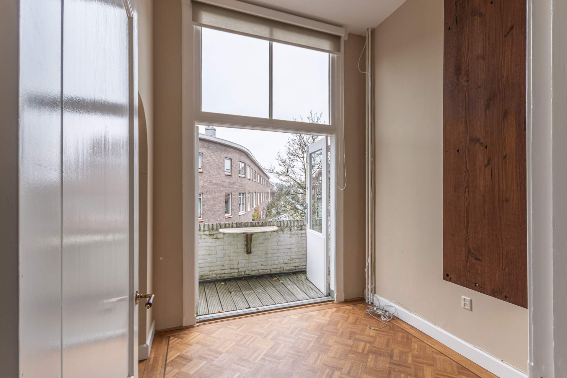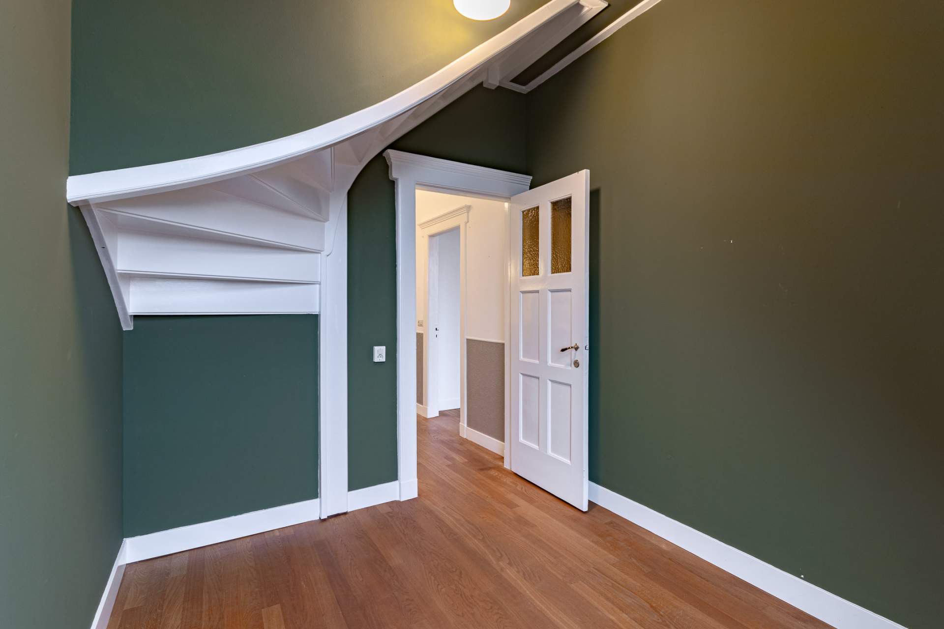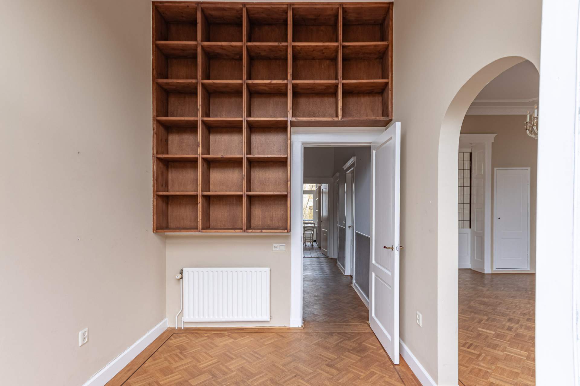 De prachtige kamer-en-suite is voorzien van glas-in-lood schuifdeuren en vaste kasten, wat zorgt voor een klassieke en warme uitstraling. De voorkamer heeft een ornamenten plafond, een zwart marmeren schouw en twee grote ramen met vrij uitzicht over de rustige straat. Aangrenzend bevindt zich een extra kamer, speels verbonden middels een toog, ideaal als werk-, speel- of studeerkamer. Aan de voorzijde zijn tevens openslaande deuren naar een klein balkon met avondzon.