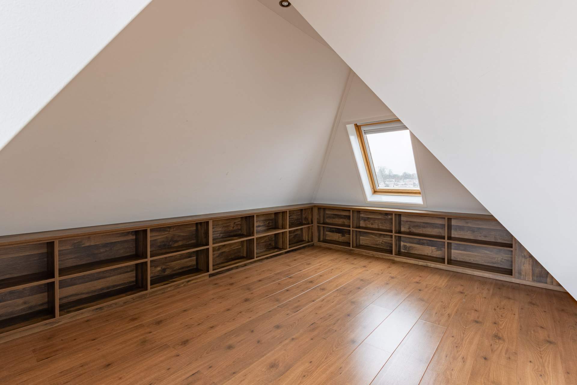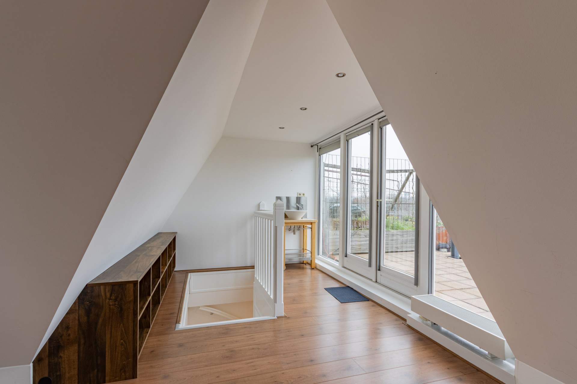 Via een fraaie trap bereik je de bovenste verdieping met een extra werkkamer, gelegen in een charmante punt. Vanuit hier geven openslaande deuren toegang tot het grote dakterras met vrij uitzicht.