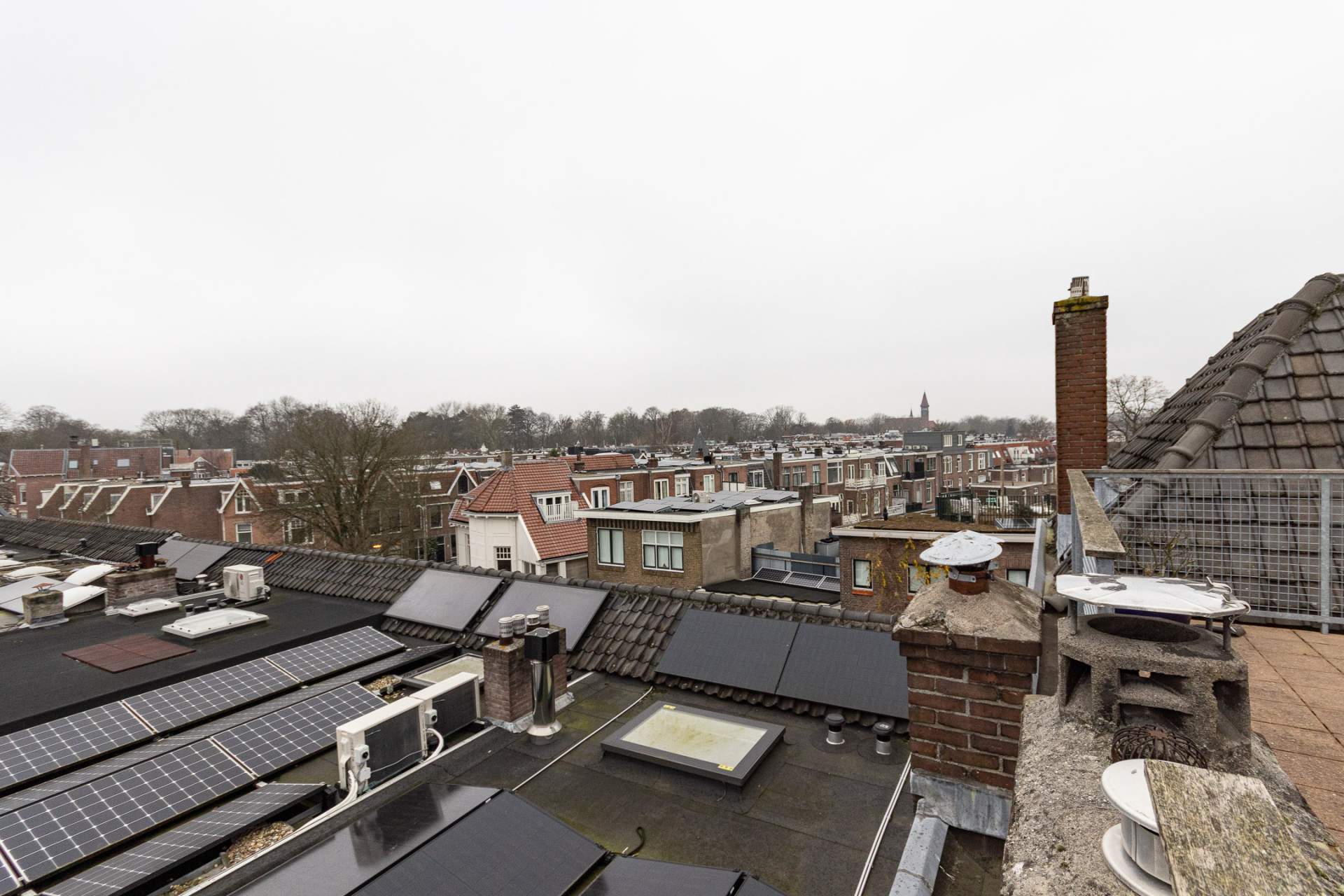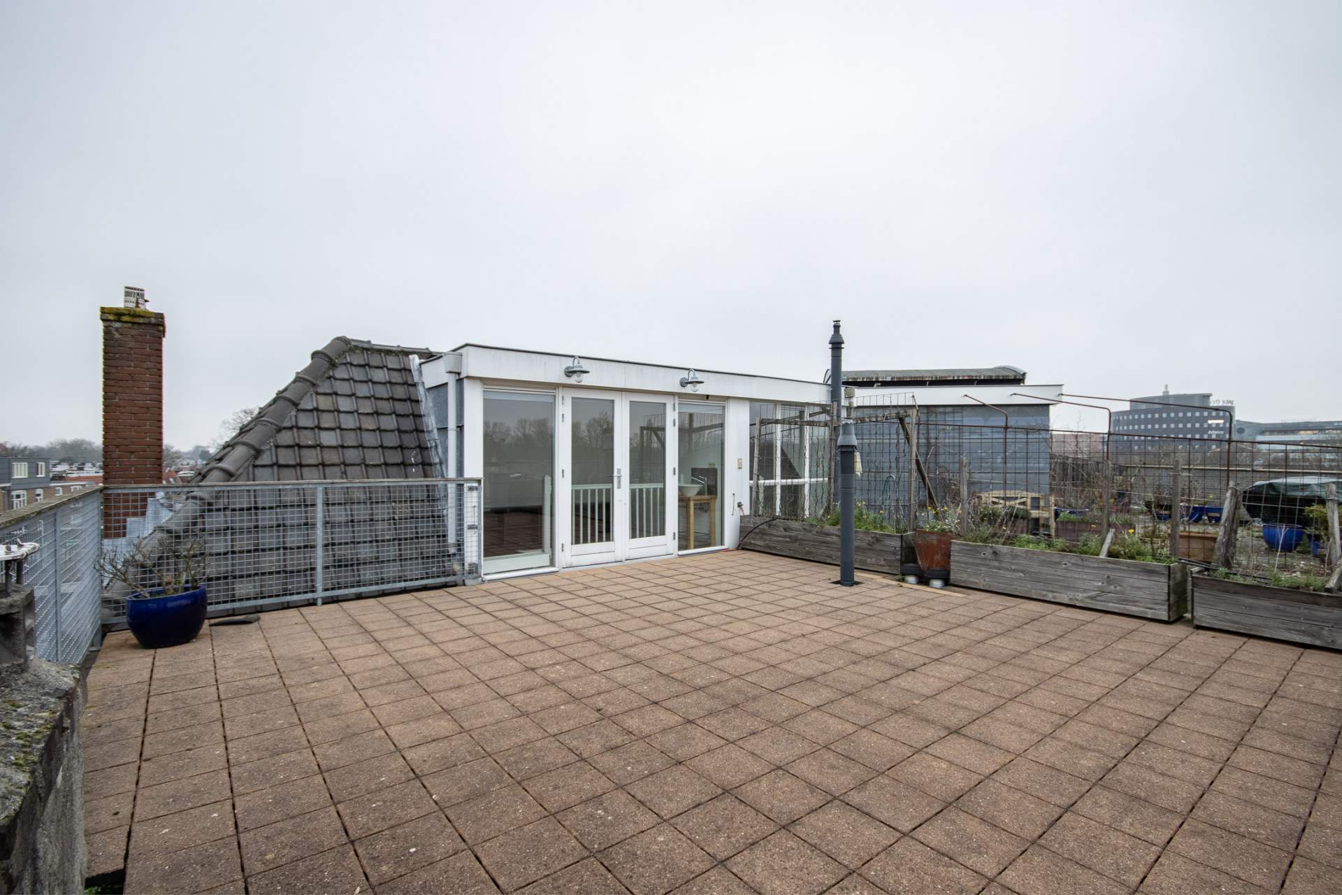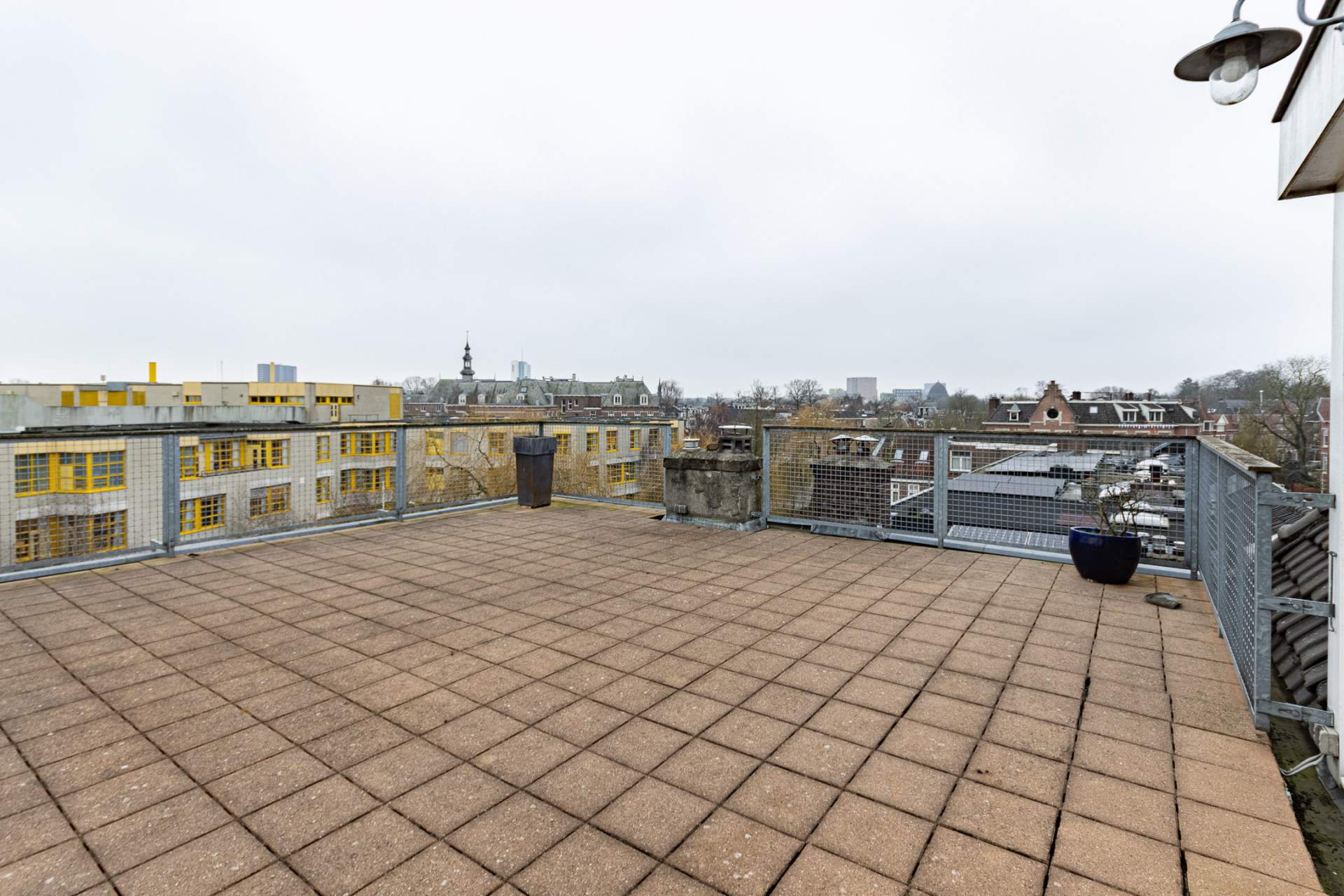 Dit terras is mooi aangelegd en voorzien van elektra, water, tegels, plantenbakken en degelijk hekwerk. Een heerlijke plek om te ontspannen en te genieten van het indrukwekkende uitzicht over de Utrechtse parken en karakteristieke kerktorens.