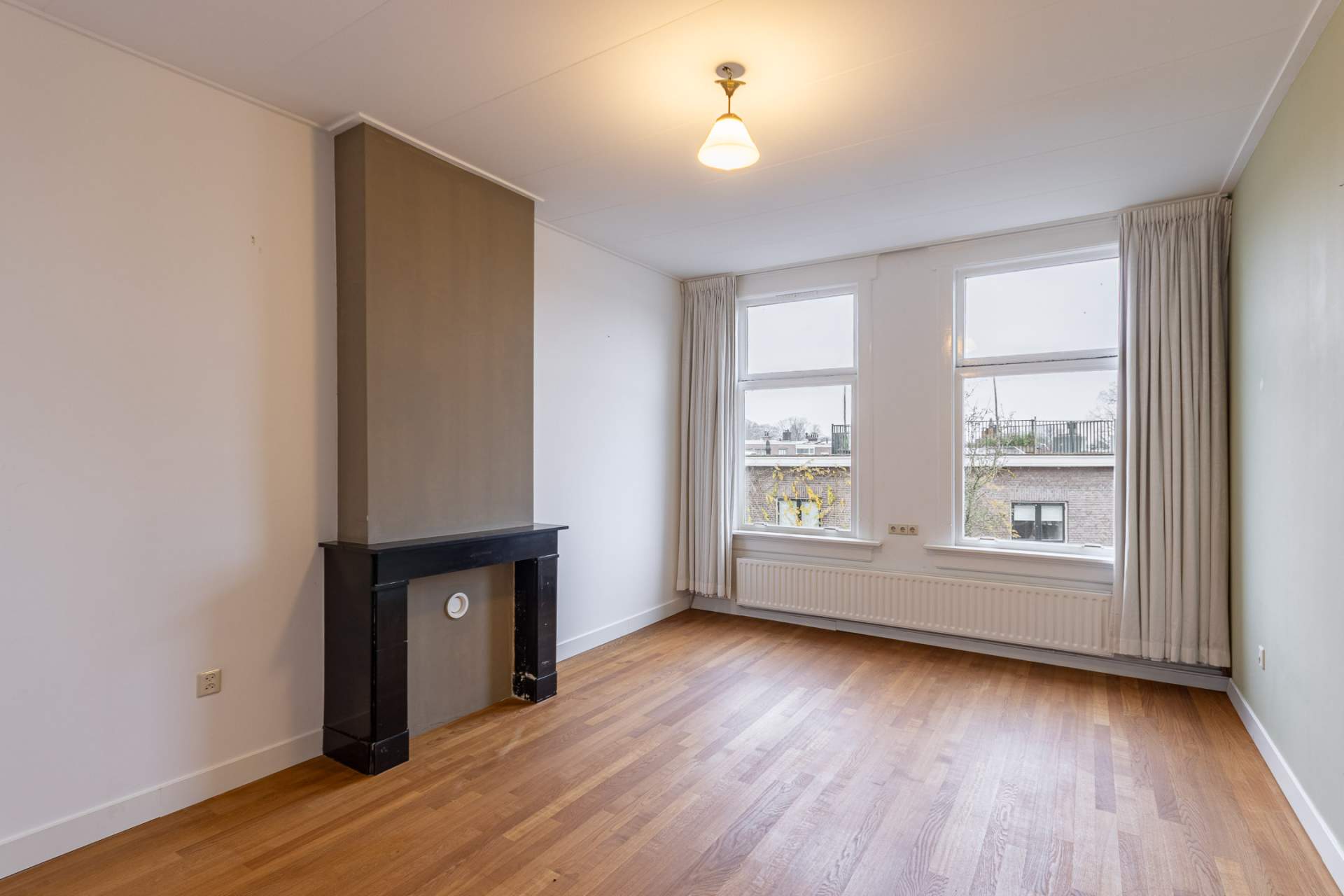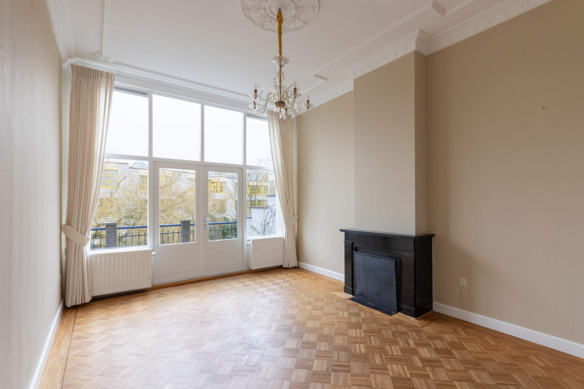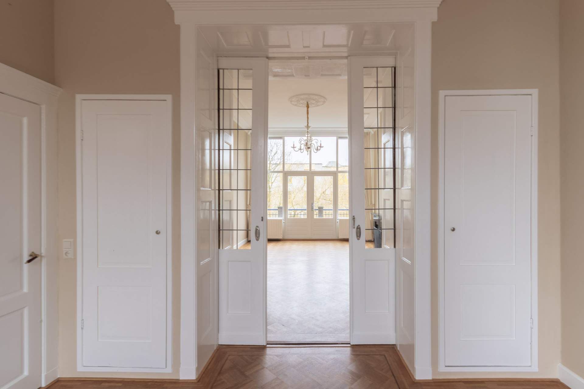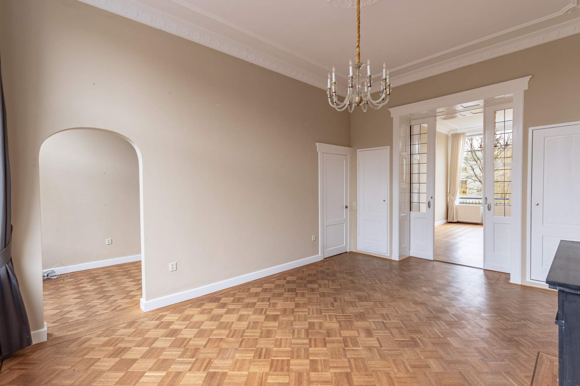 De prachtige kamer-en-suite is voorzien van glas-in-lood schuifdeuren en vaste kasten, wat zorgt voor een klassieke en warme uitstraling. De voorkamer heeft een ornamenten plafond, een zwart marmeren schouw en twee grote ramen met vrij uitzicht over de rustige straat. Aangrenzend bevindt zich een extra kamer, speels verbonden middels een toog, ideaal als werk-, speel- of studeerkamer. Aan de voorzijde zijn tevens openslaande deuren naar een klein balkon met avondzon.