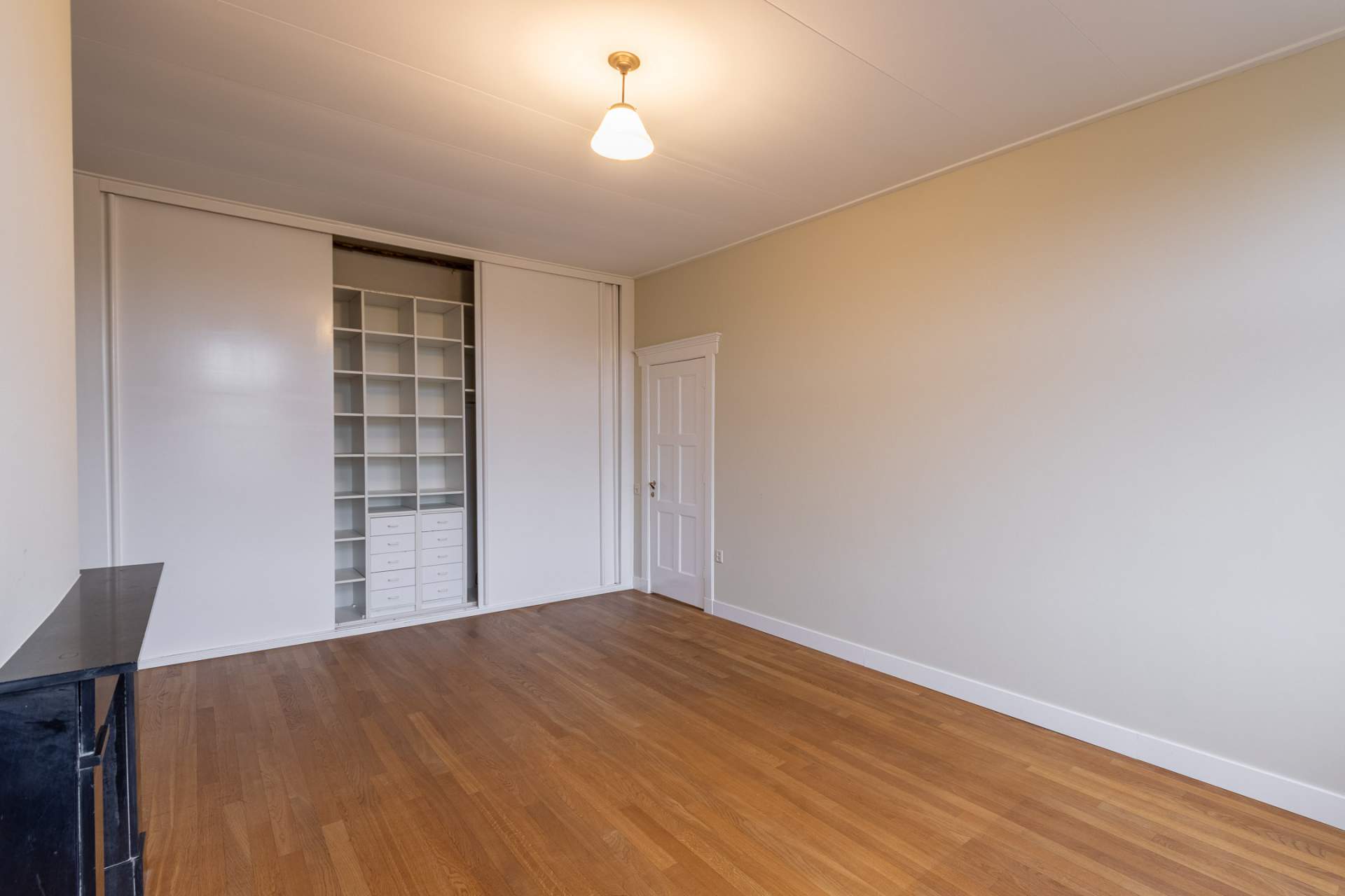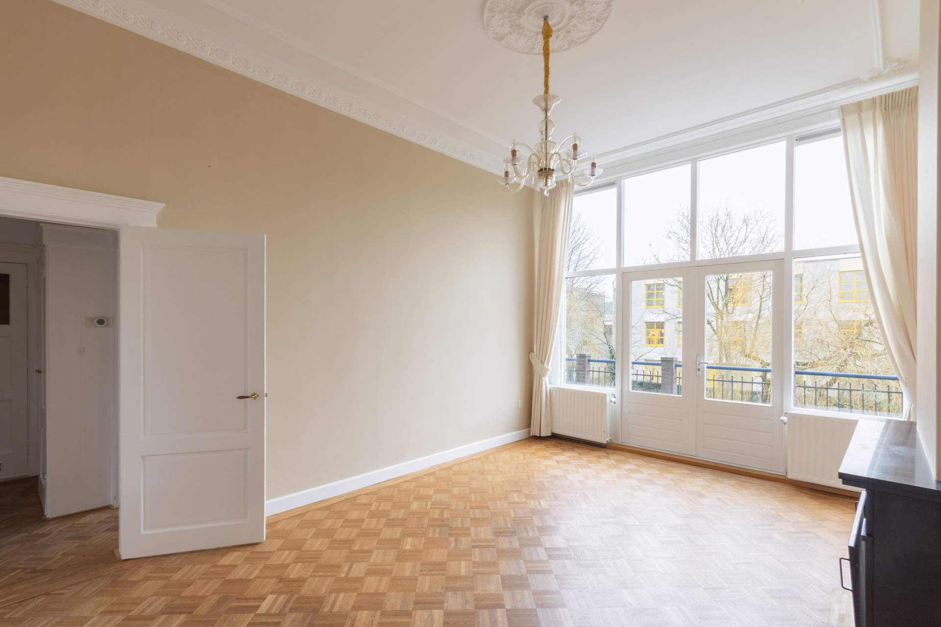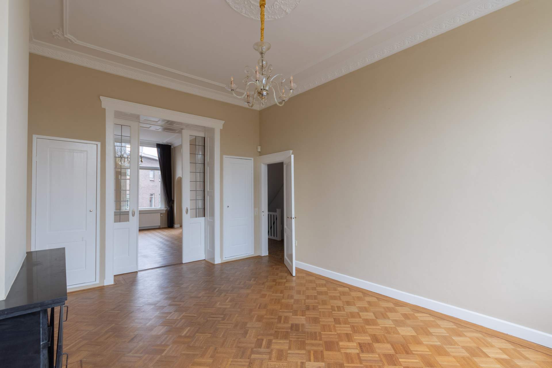 De prachtige kamer-en-suite is voorzien van glas-in-lood schuifdeuren en vaste kasten, wat zorgt voor een klassieke en warme uitstraling. De voorkamer heeft een ornamenten plafond, een zwart marmeren schouw en twee grote ramen met vrij uitzicht over de rustige straat. Aangrenzend bevindt zich een extra kamer, speels verbonden middels een toog, ideaal als werk-, speel- of studeerkamer. Aan de voorzijde zijn tevens openslaande deuren naar een klein balkon met avondzon.