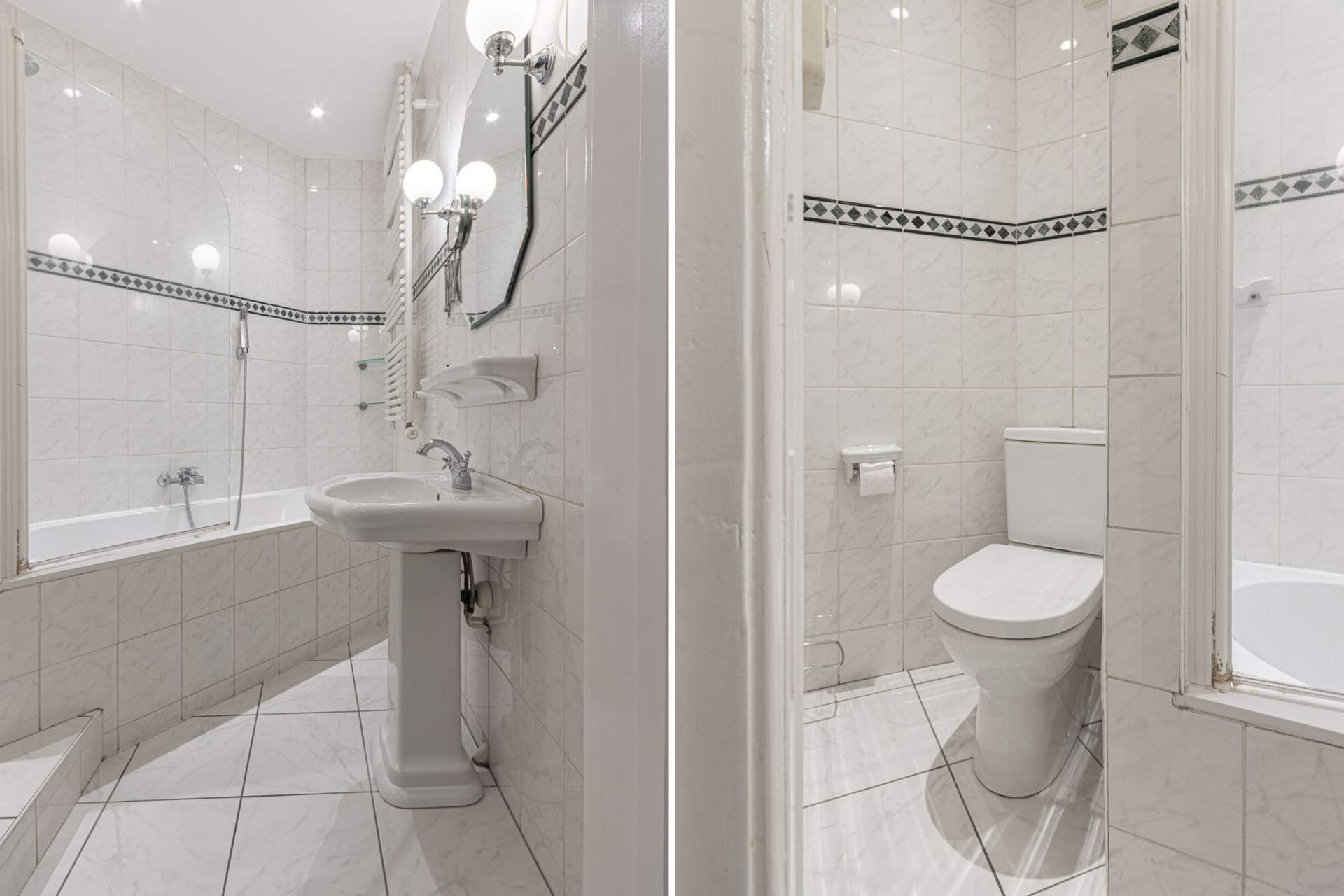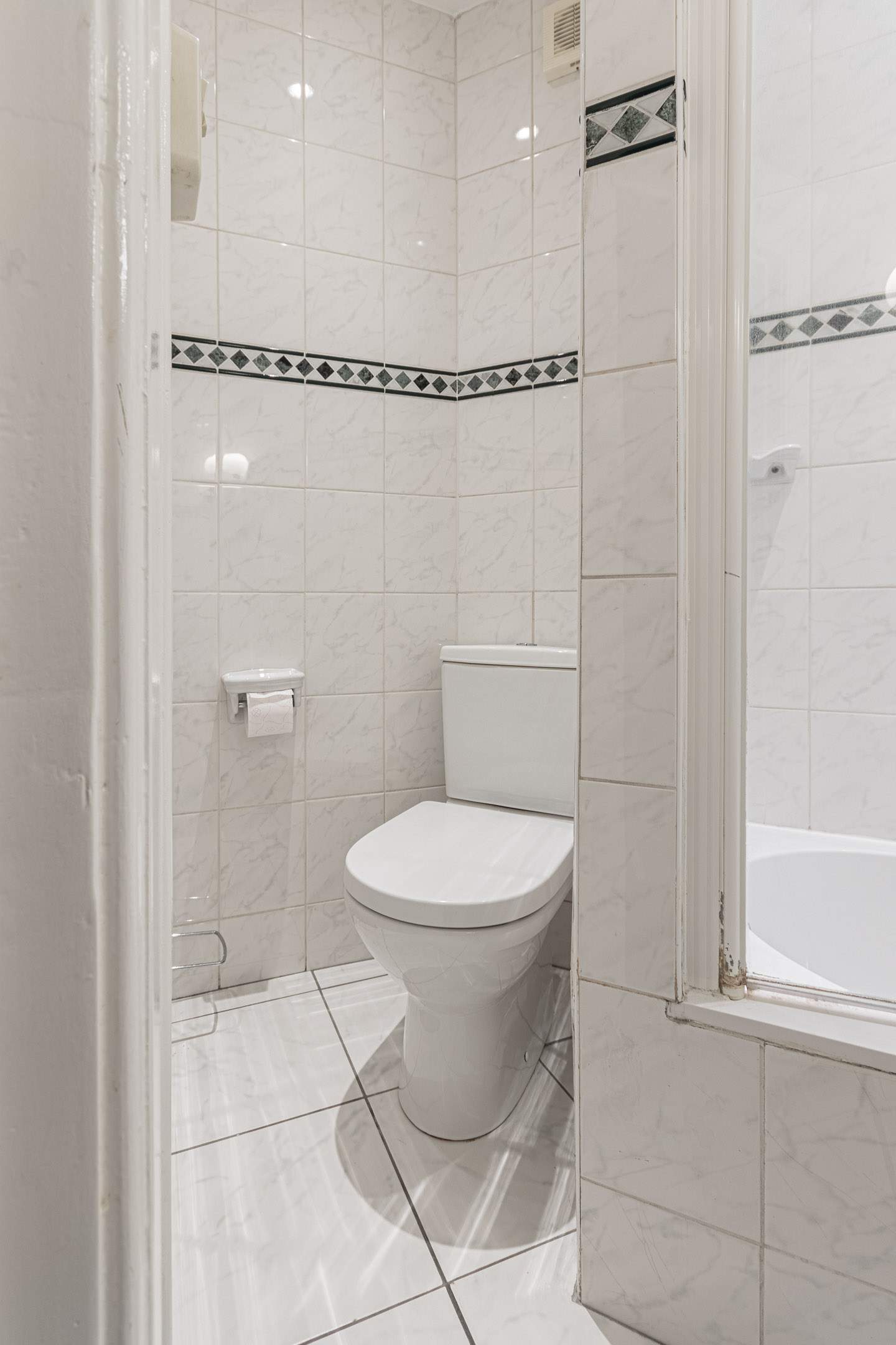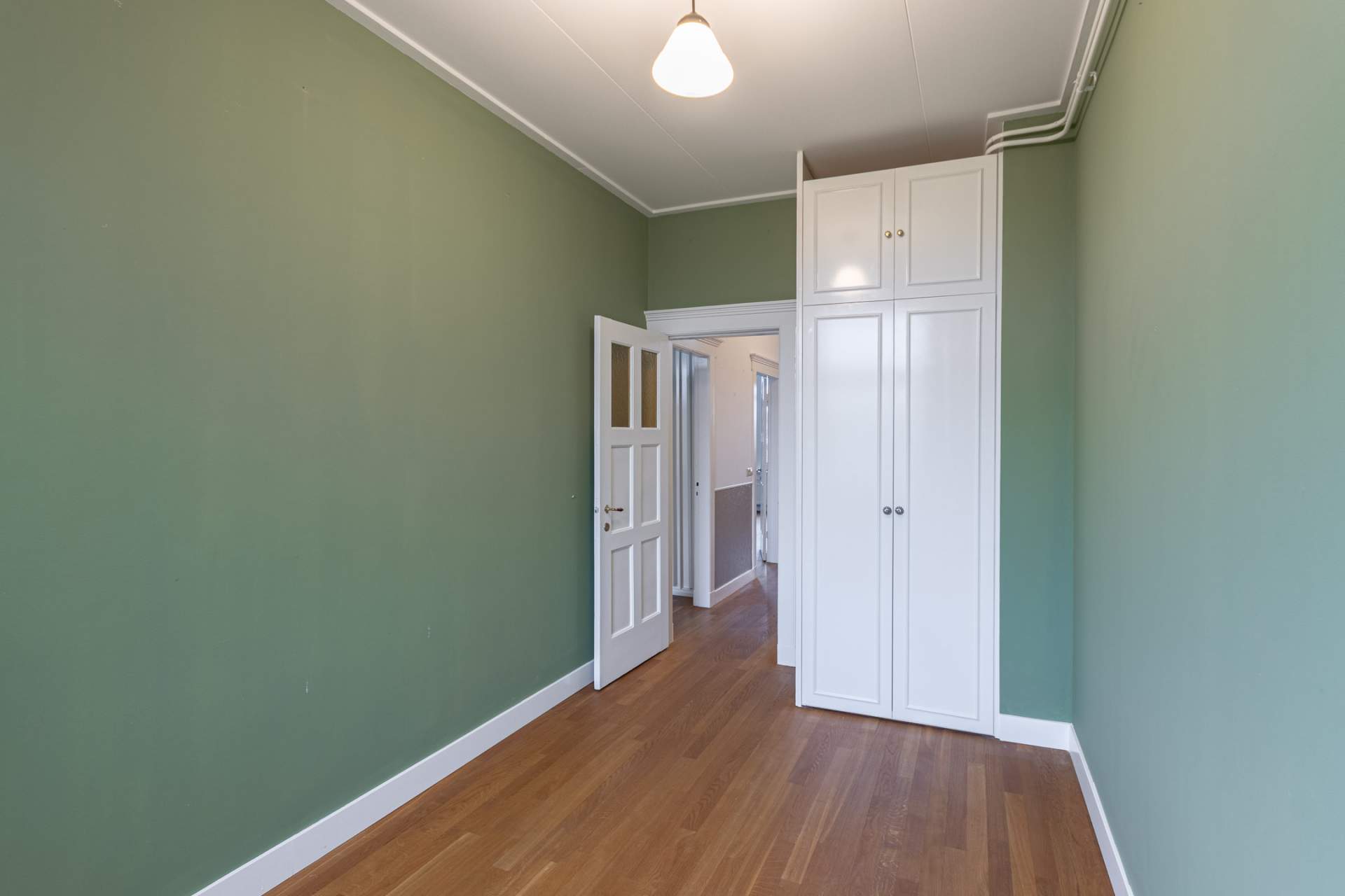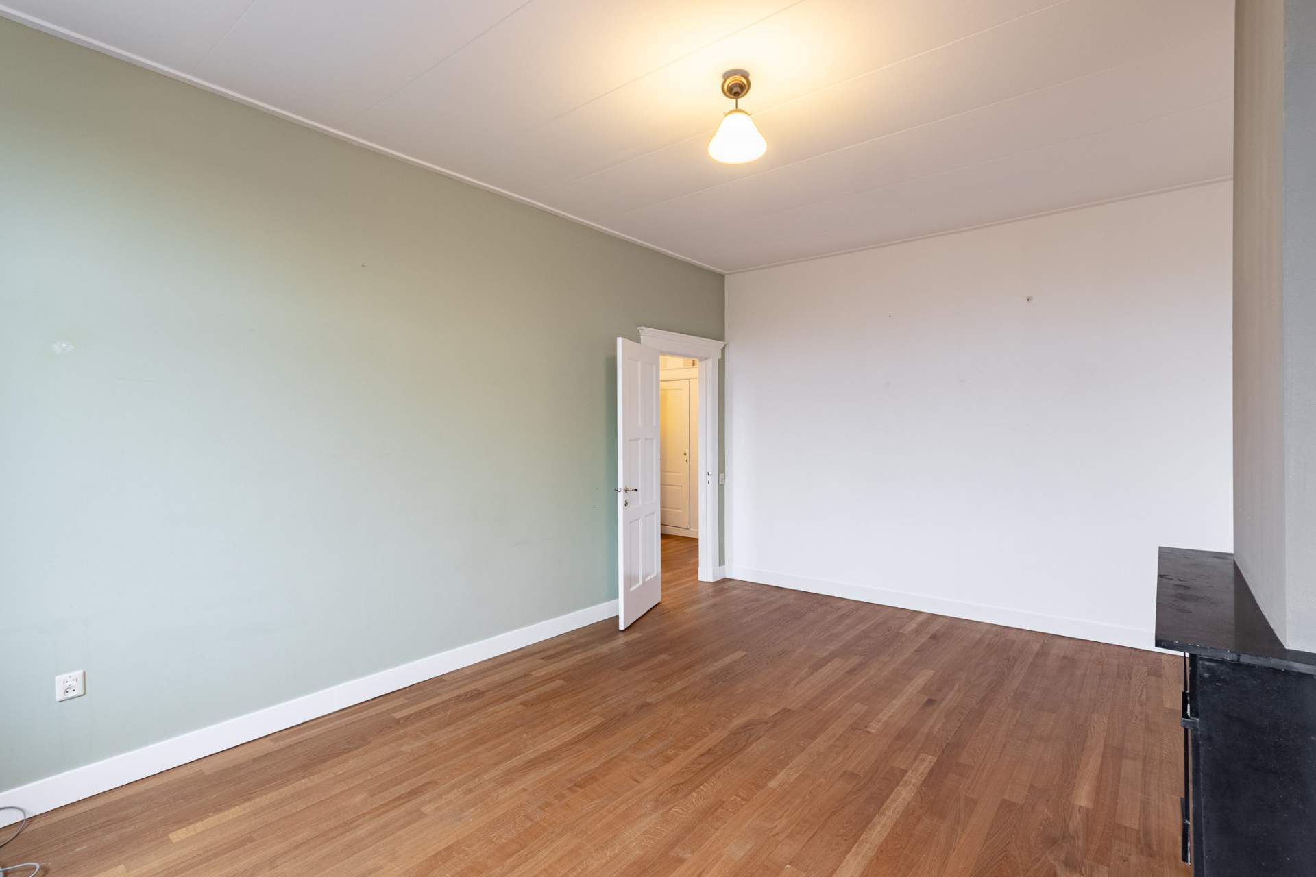 De prachtige kamer-en-suite is voorzien van glas-in-lood schuifdeuren en vaste kasten, wat zorgt voor een klassieke en warme uitstraling. De voorkamer heeft een ornamenten plafond, een zwart marmeren schouw en twee grote ramen met vrij uitzicht over de rustige straat. Aangrenzend bevindt zich een extra kamer, speels verbonden middels een toog, ideaal als werk-, speel- of studeerkamer. Aan de voorzijde zijn tevens openslaande deuren naar een klein balkon met avondzon.