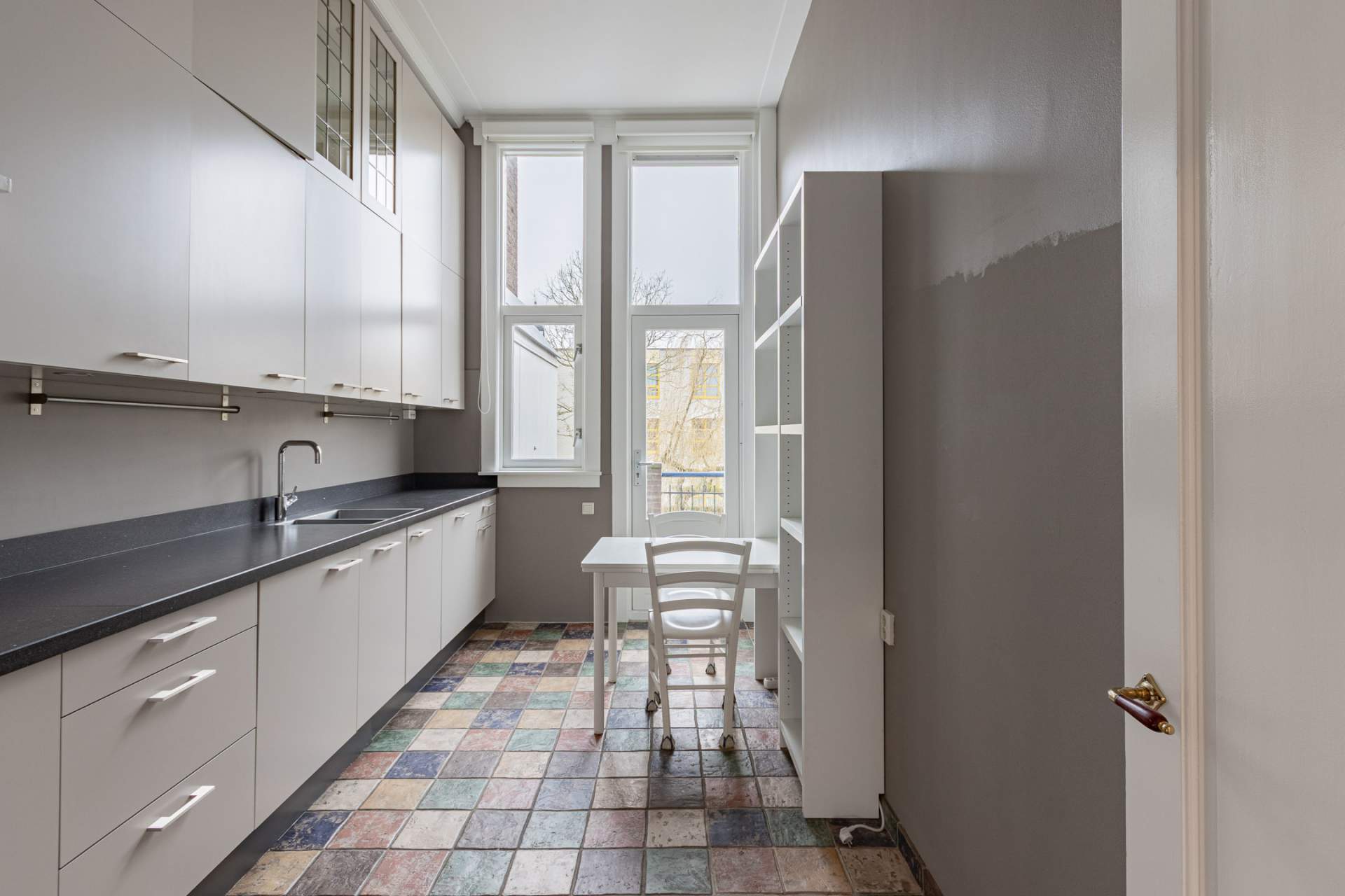 De achterkamer beschikt over een open haard en openslaande deuren naar het eerste, ruim bemeten terras, dat gunstig op de zon ligt en perfect is voor een borrel of diner. De ruime keuken bevindt zich eveneens aan de achterzijde en heeft directe toegang tot het terras. Deze is uitgerust met een origineel schouw, een Smeg-fornuis met zes pitten en afzuigkap, vaatwasmachine, losse koelkast en veel hoge bergkasten. Door de royale hoogte is de ruimte optimaal benut en is er plaats voor een gezellig eettafeltje. De gehele verdieping is voorzien van een fraaie en goed onderhouden parketvloer.