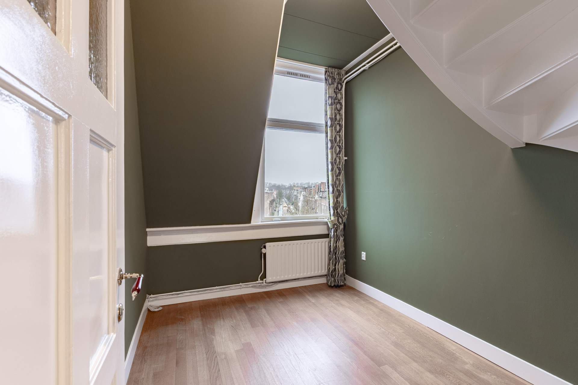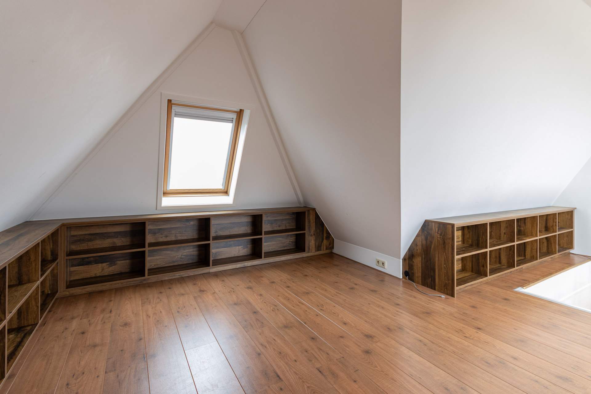 Via een fraaie trap bereik je de bovenste verdieping met een extra werkkamer, gelegen in een charmante punt. Vanuit hier geven openslaande deuren toegang tot het grote dakterras met vrij uitzicht.