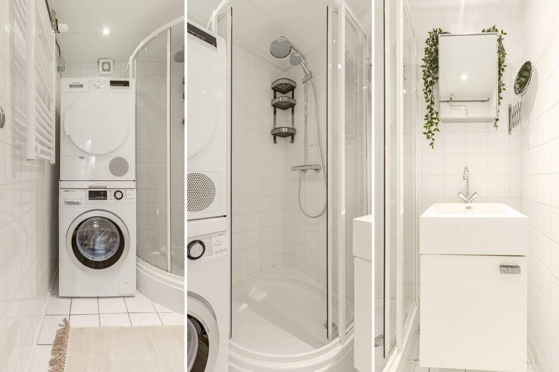 The bathroom includes a sink and shower, as well as space for a washing machine and dryer.