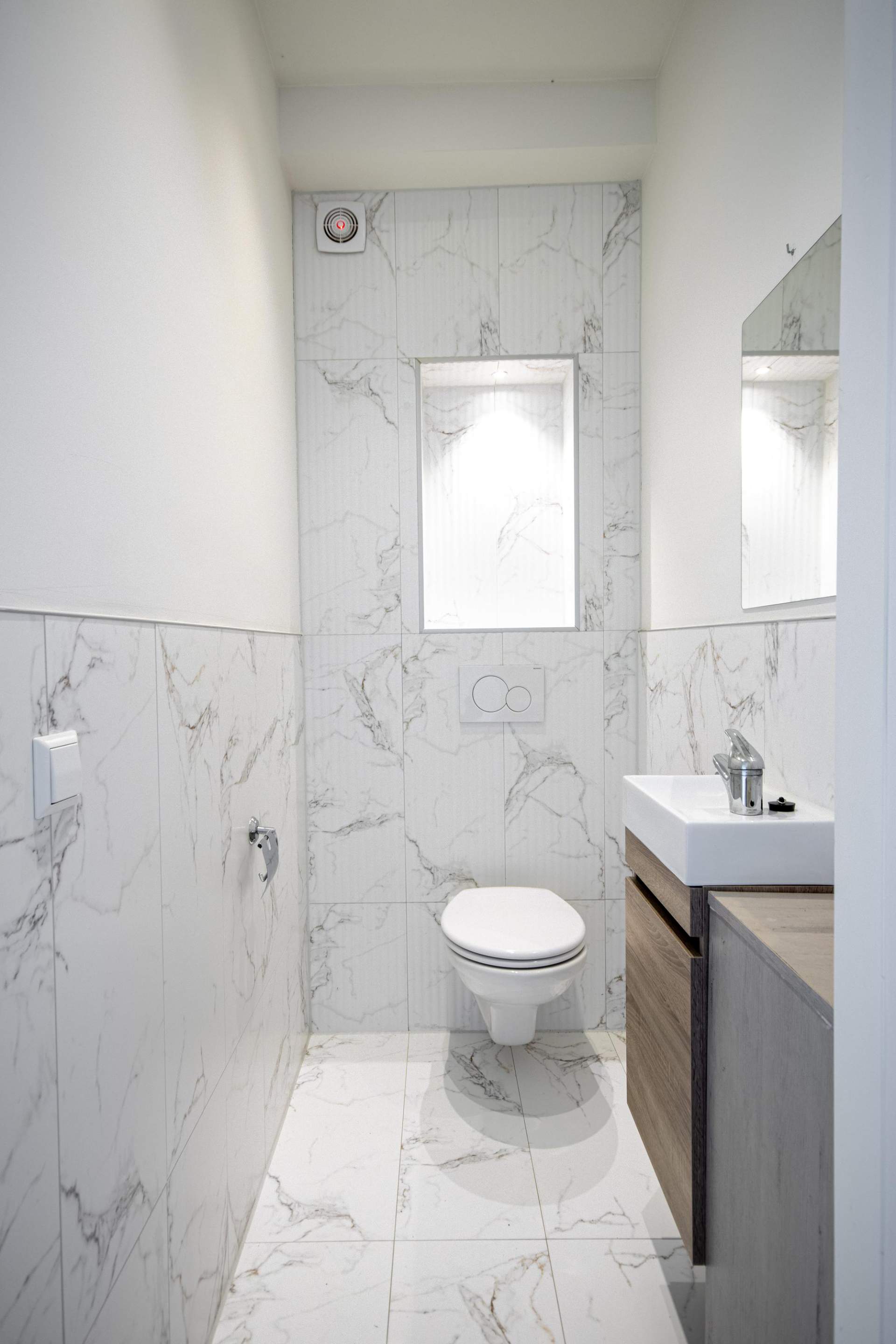 The first apartment is located on the first floor and is accessible via the hall. This apartment has a bright, spacious living room with a luxurious open kitchen with built-in appliances in a corner kitchen layout, a spacious bedroom at the front with an adjoining modern bathroom with walk-in shower and washbasin, a separate toilet and neat upholstery and built-in lighting in the ceiling.