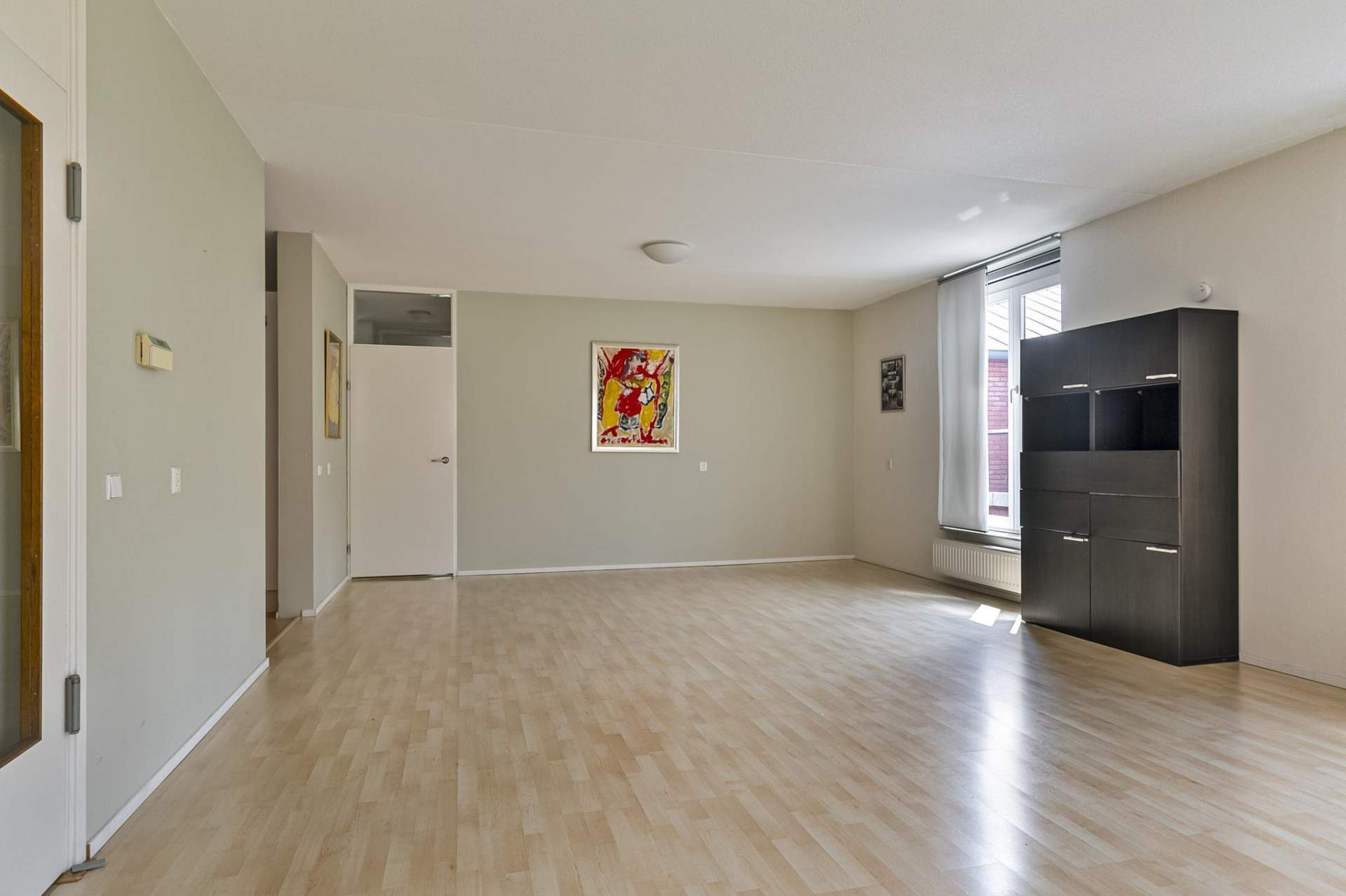 Via dubbele openslaande deuren is de zeer royale woonkamer (8,44 x 5,13m) te betreden met fijne ramen en een natuurlijke lichtinval.