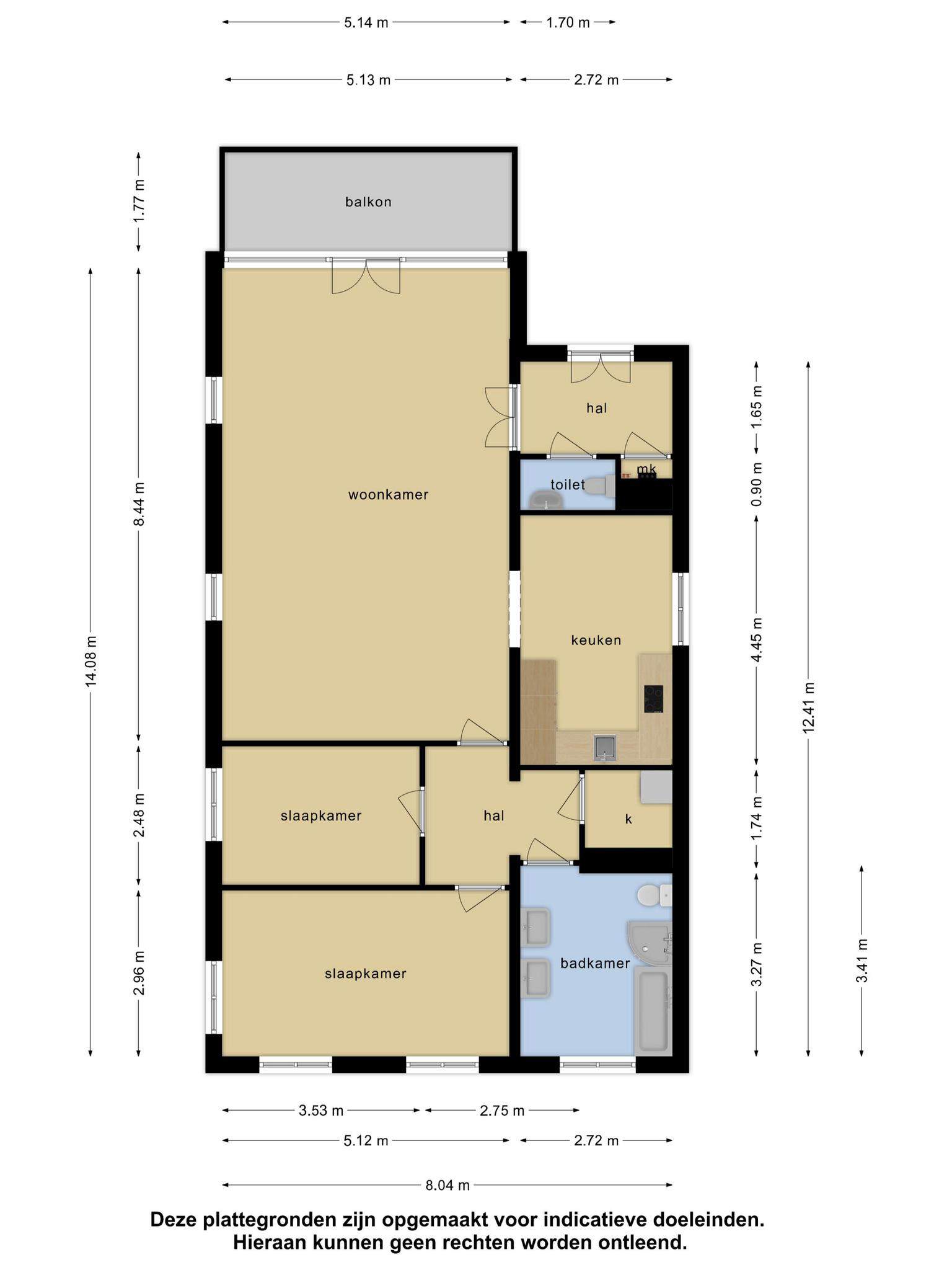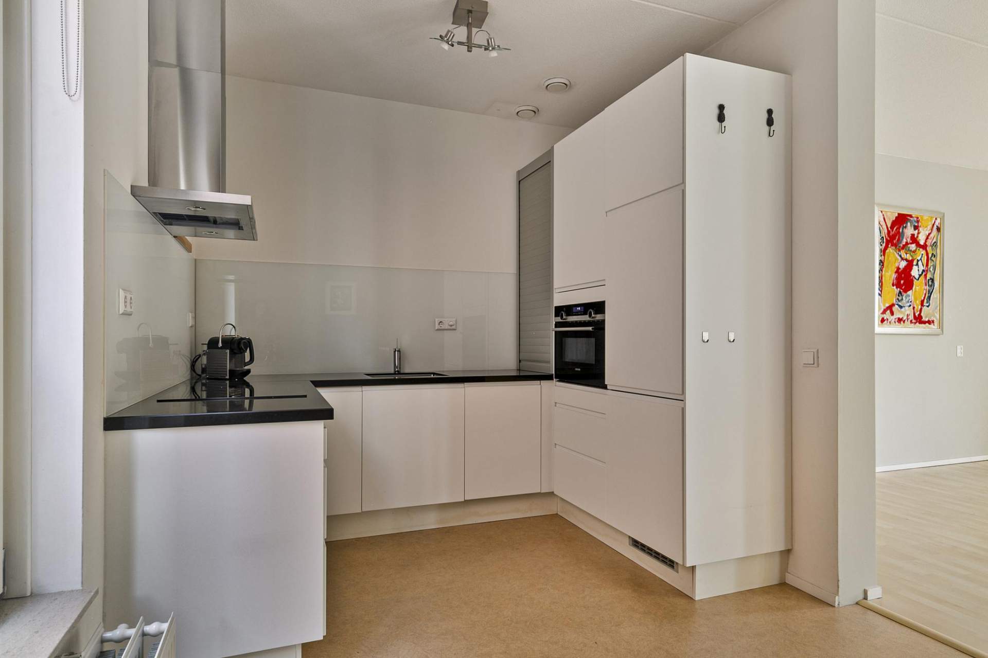 Vanuit hier is er toegang tot de heerlijke zonnige loggia (1,77 x 5,13m) en de half- open (woon)keuken (4,45 x 2,72) van alle gemakken voorzien.