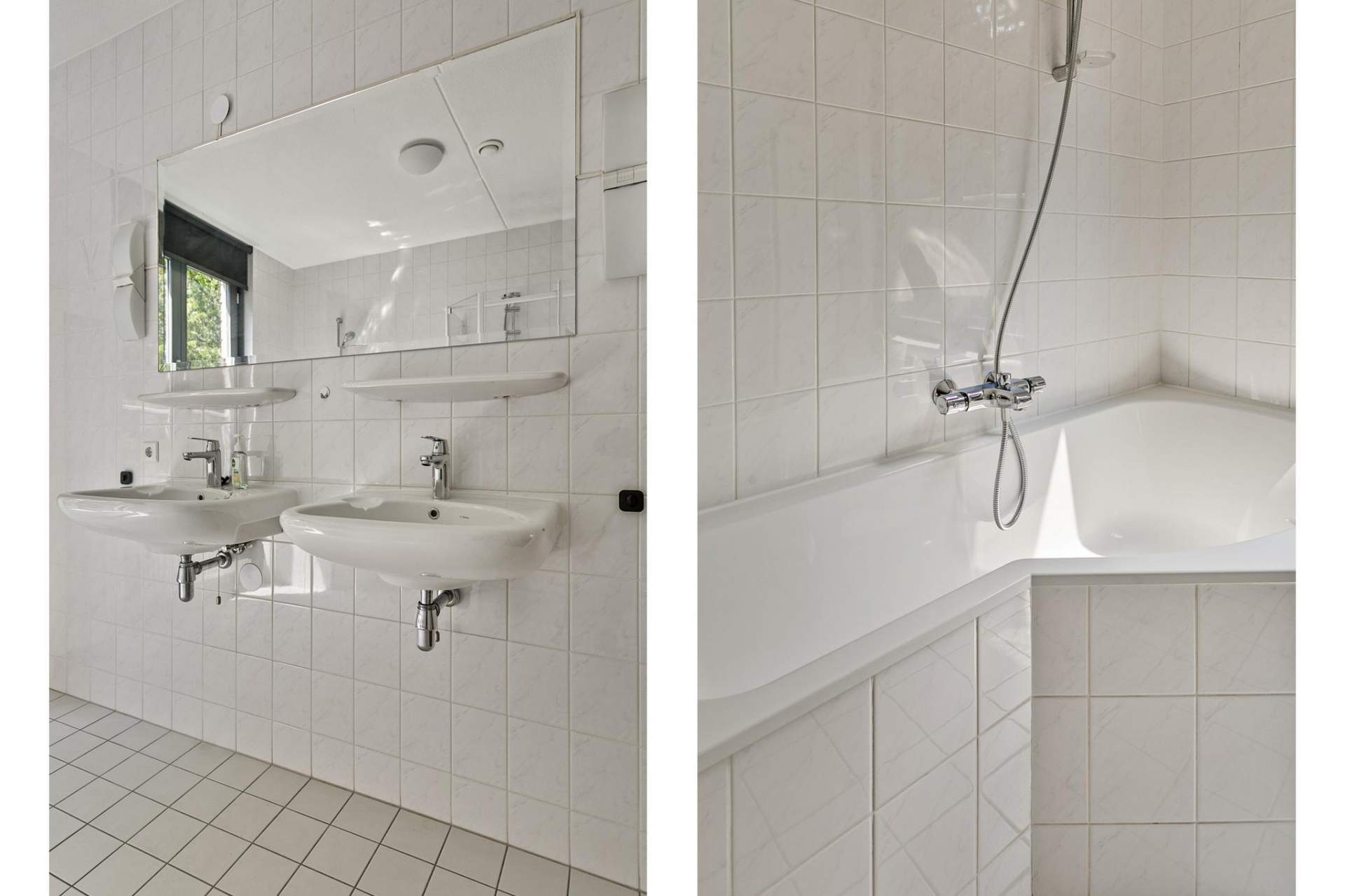 Een tweede ruime hal geeft toegang tot de 2 goede slaapkamers aan de achterzijde (5,12 x 2,96m) / (3,53 x 2,48m) en de royale badkamer (3,27 x 2,72m) met ligbad, douche en 2 wastafels.