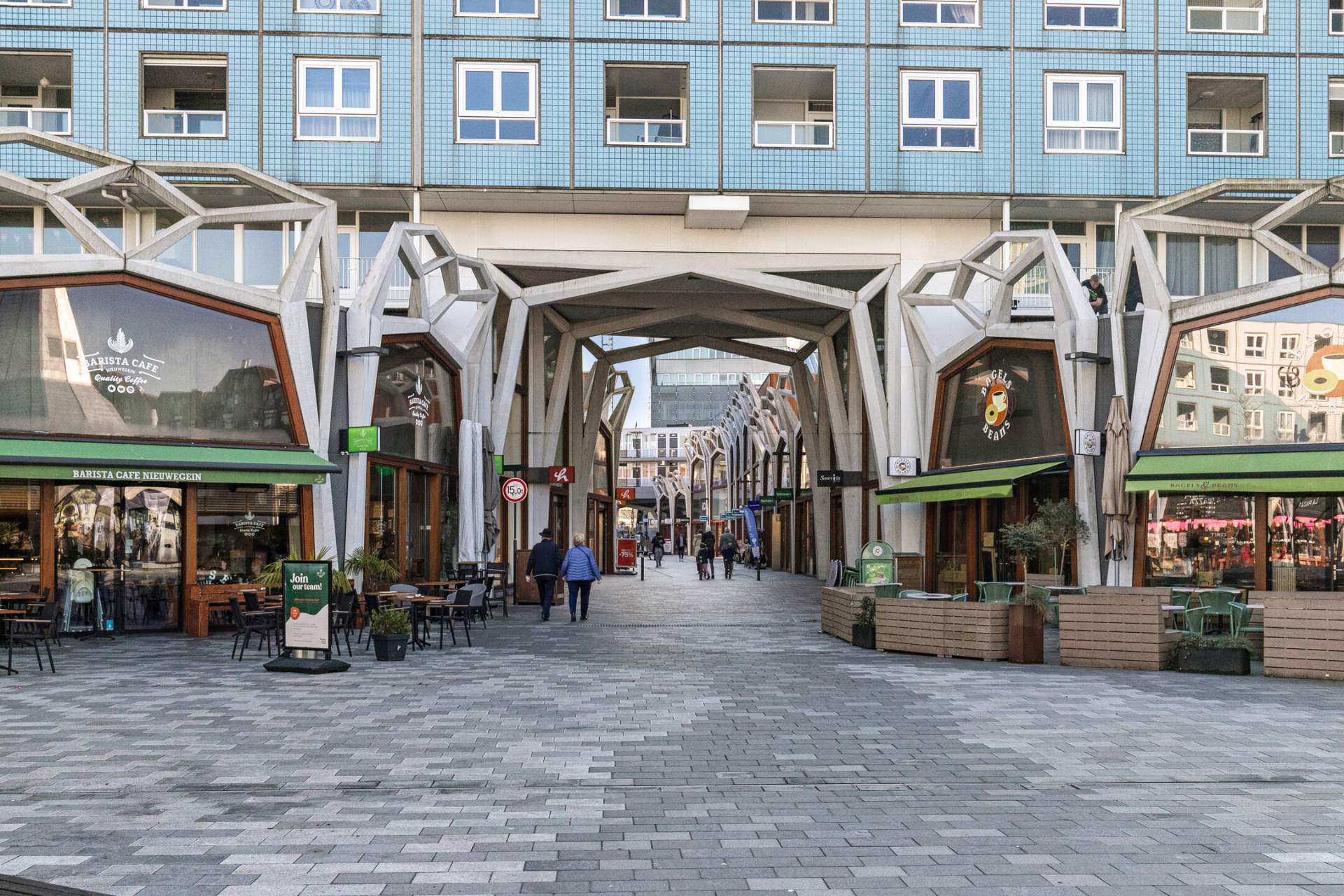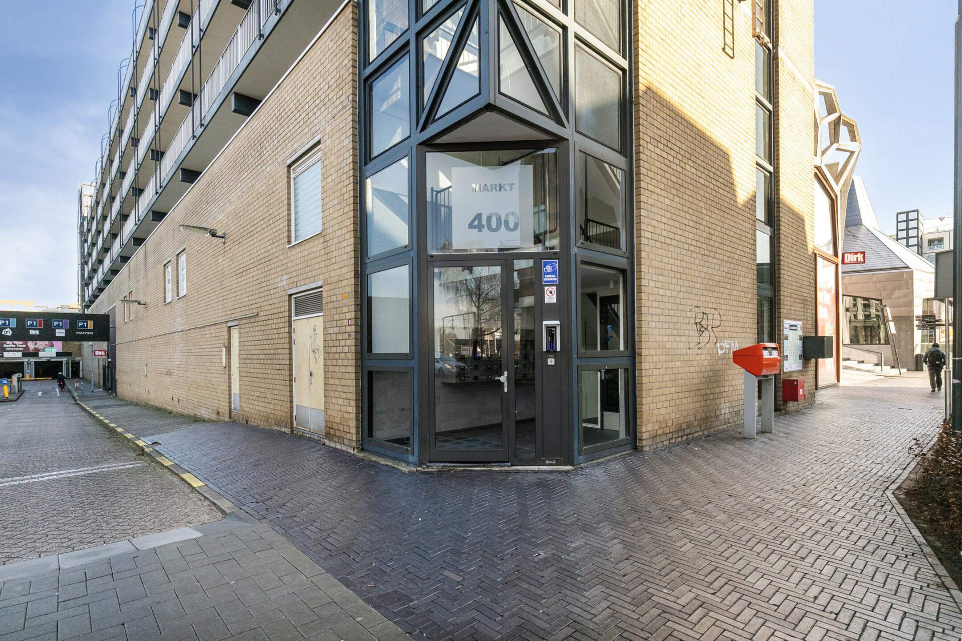 Afgesloten entree met brievenbussen en (video)bel systeem. Er is een trapopgang en lift naar de woonverdiepingen en toegang tot de bergingen.