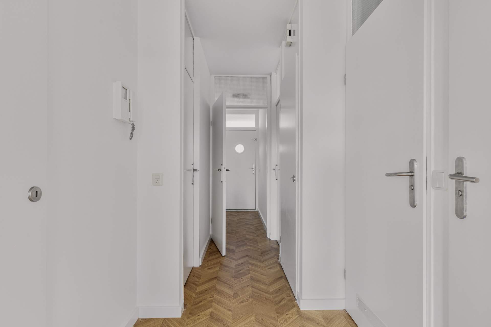 Closed entrance with mailboxes and (video) bell system. There is a staircase and elevator to the living floors and access to the storage rooms.