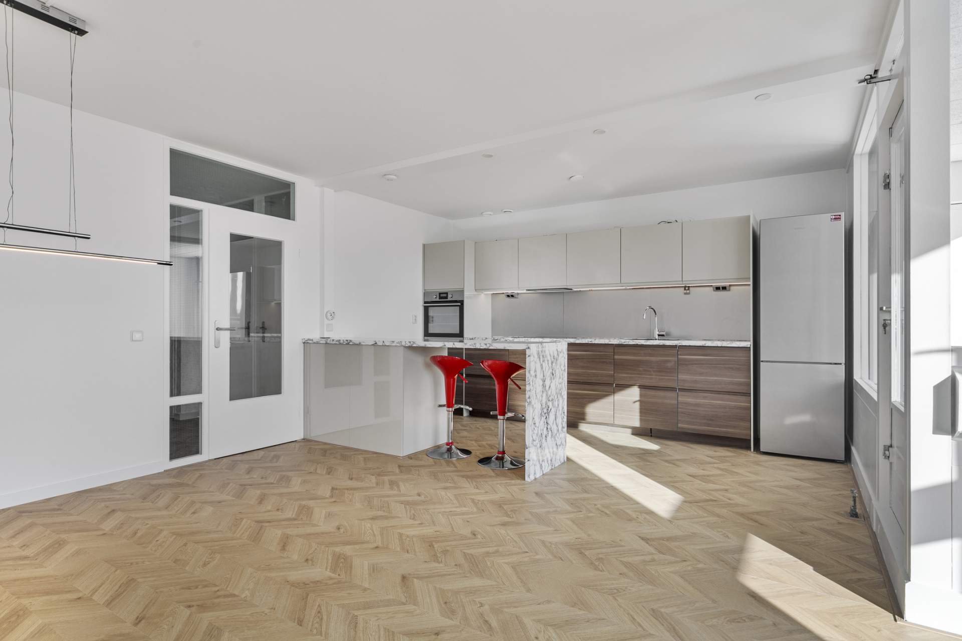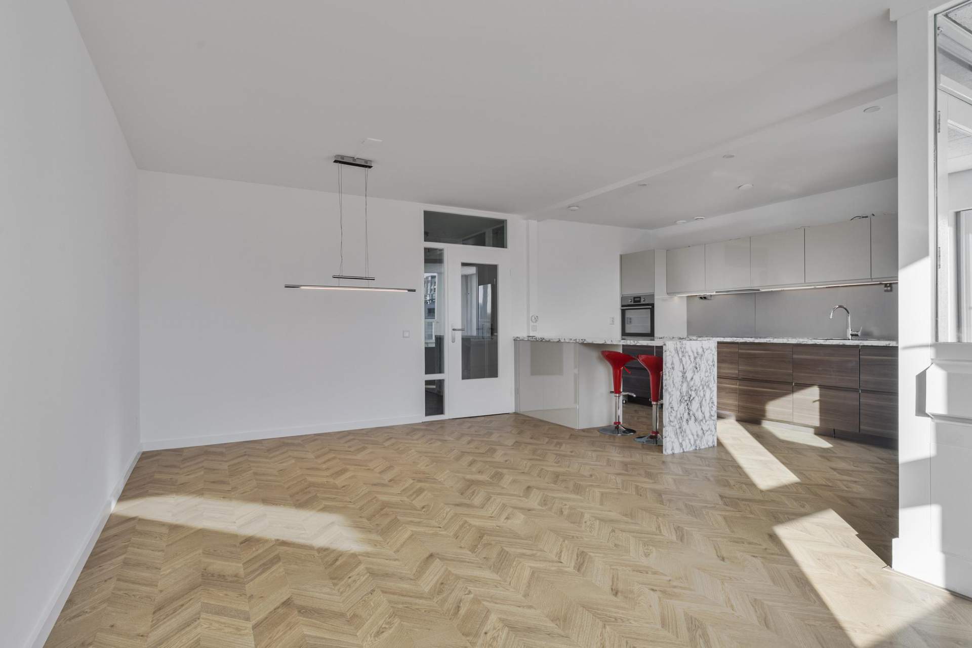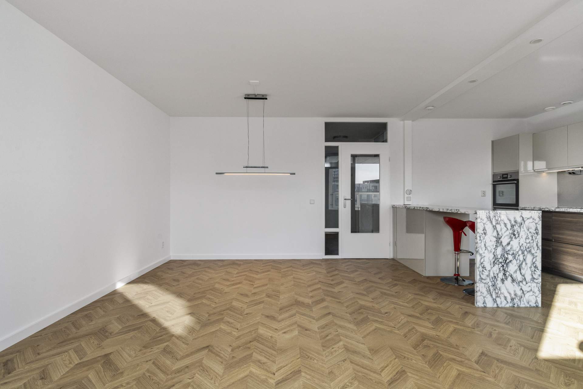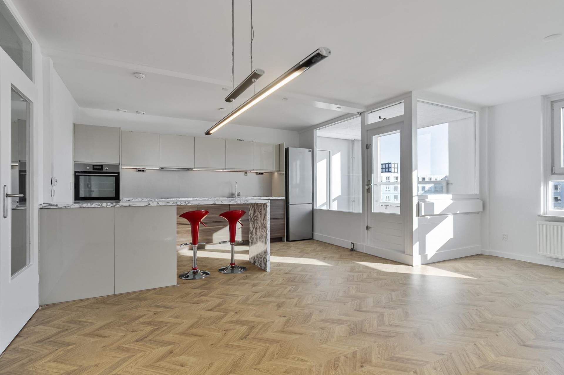 The spacious living room offers an open and bright living environment thanks to the large windows. The direct connection to the kitchen provides a spacious and open character, ideal for both relaxing evenings and cozy dinners. The open kitchen has a sleek and modern design with high-quality built-in appliances. The kitchen includes an induction hob, microwave, oven, fridge, freezer, dishwasher and an extractor hood. Thanks to the spacious layout and the practical island, this kitchen offers optimum cooking comfort and plenty of storage space.