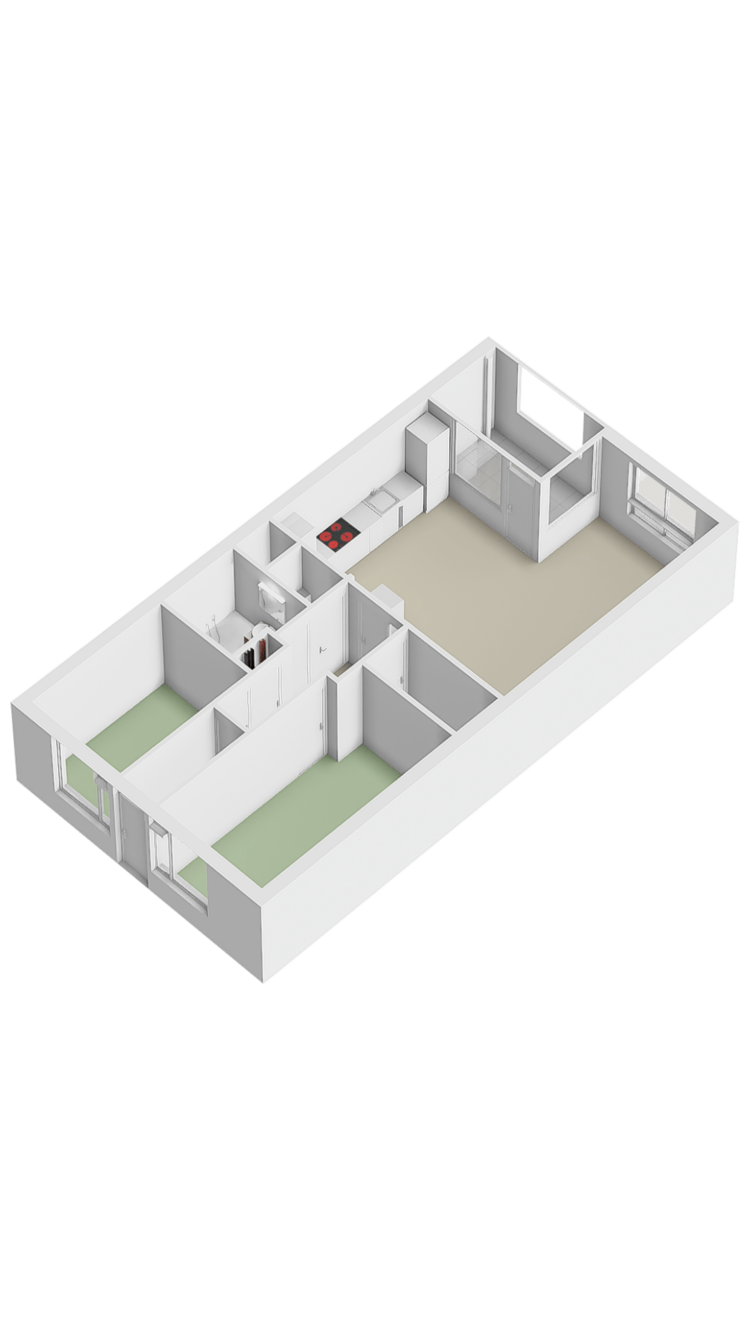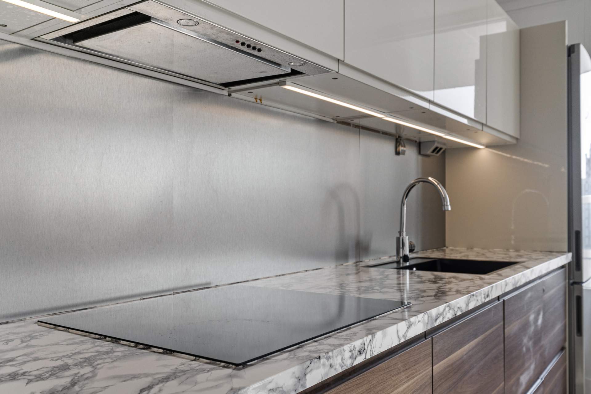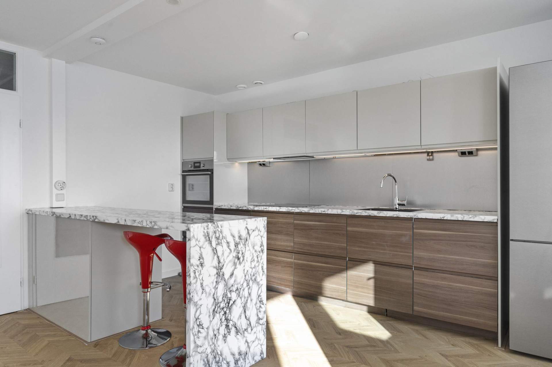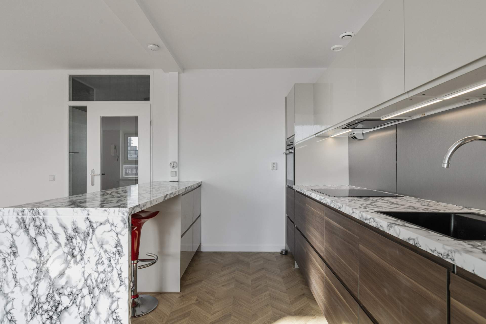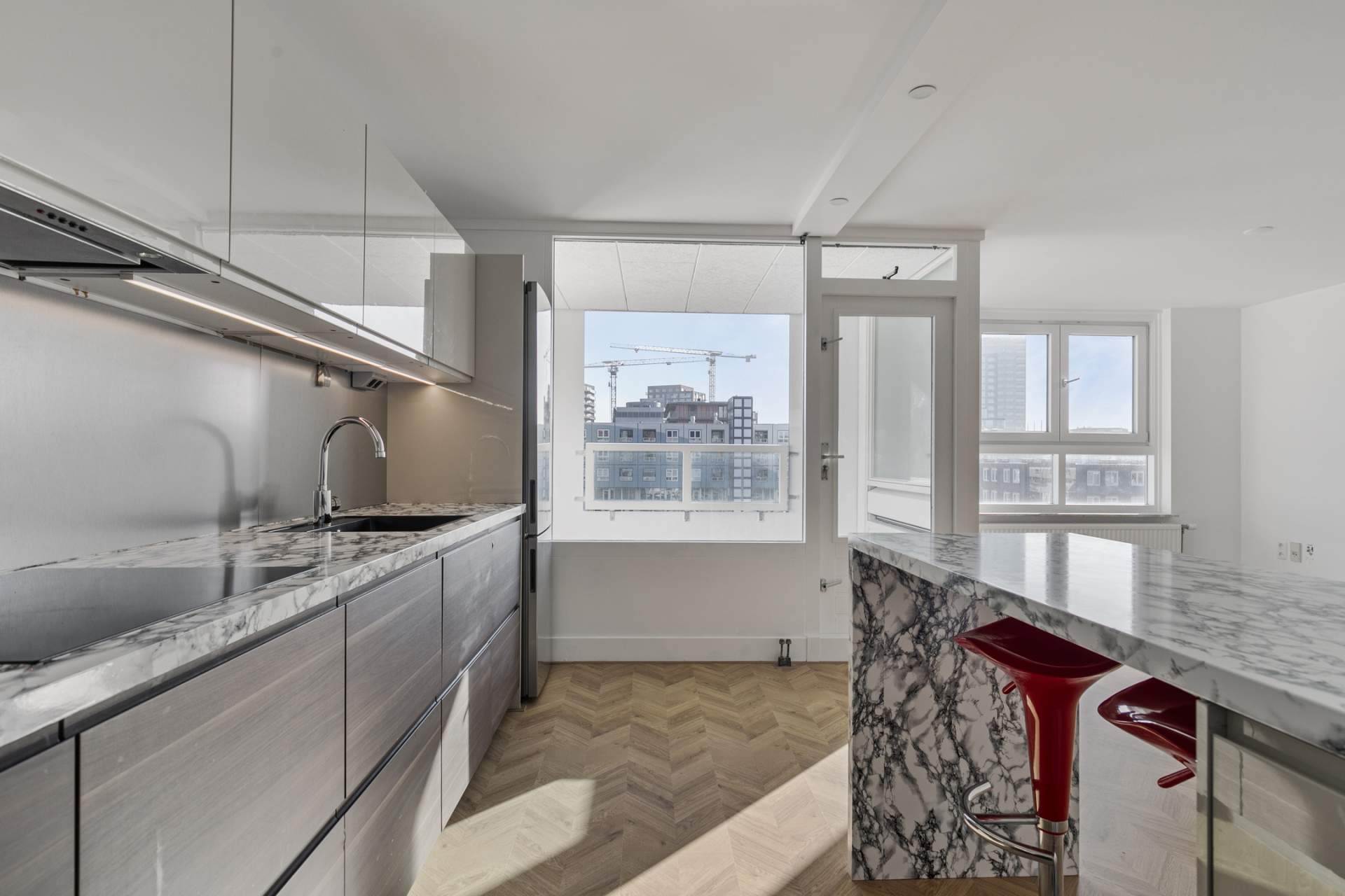The spacious living room offers an open and bright living environment thanks to the large windows. The direct connection to the kitchen provides a spacious and open character, ideal for both relaxing evenings and cozy dinners. The open kitchen has a sleek and modern design with high-quality built-in appliances. The kitchen includes an induction hob, microwave, oven, fridge, freezer, dishwasher and an extractor hood. Thanks to the spacious layout and the practical island, this kitchen offers optimum cooking comfort and plenty of storage space.