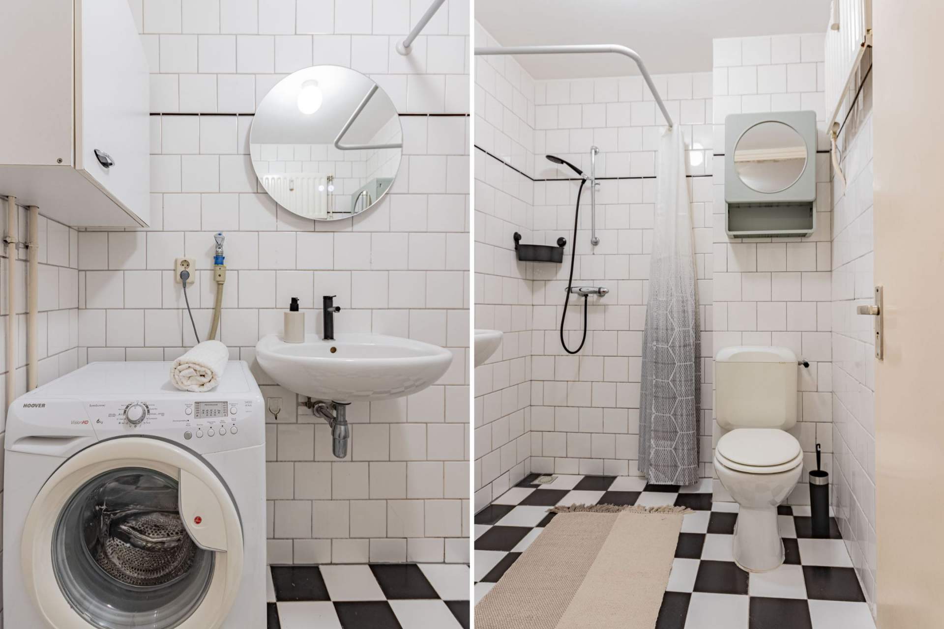 De moderne, volledig betegelde badkamer is uitgerust met een inloopdouche, wastafel, toilet en wasmachine aansluiting