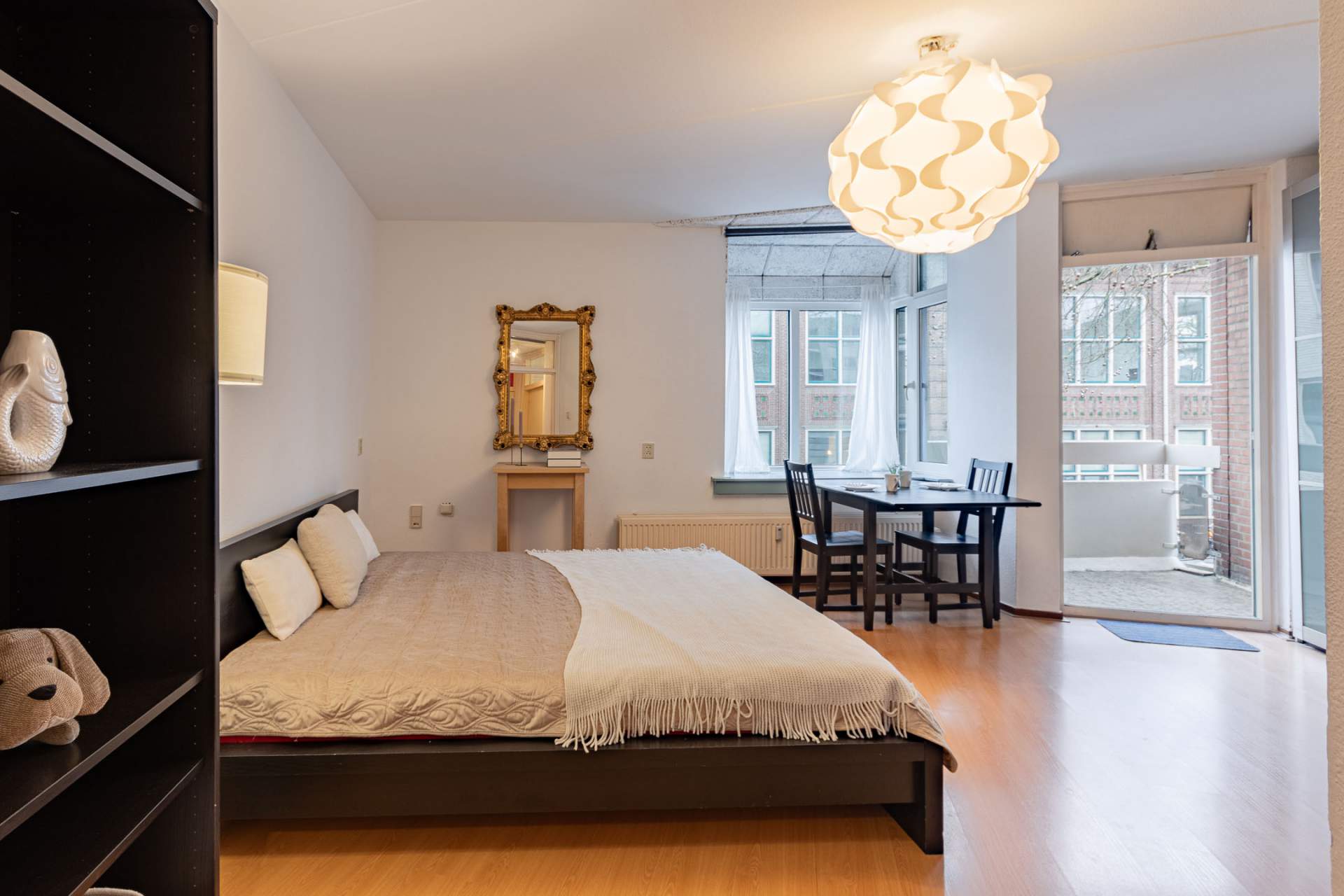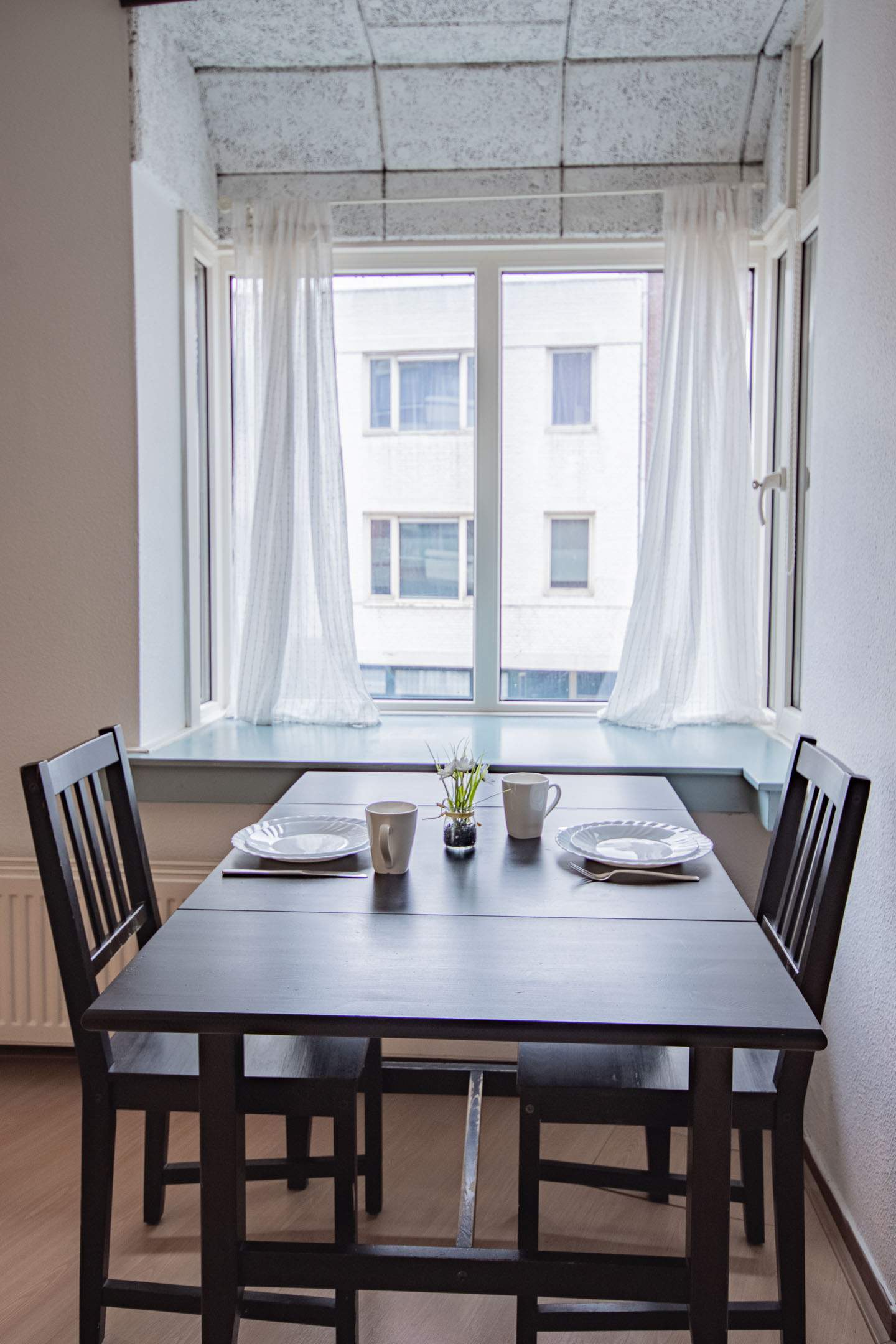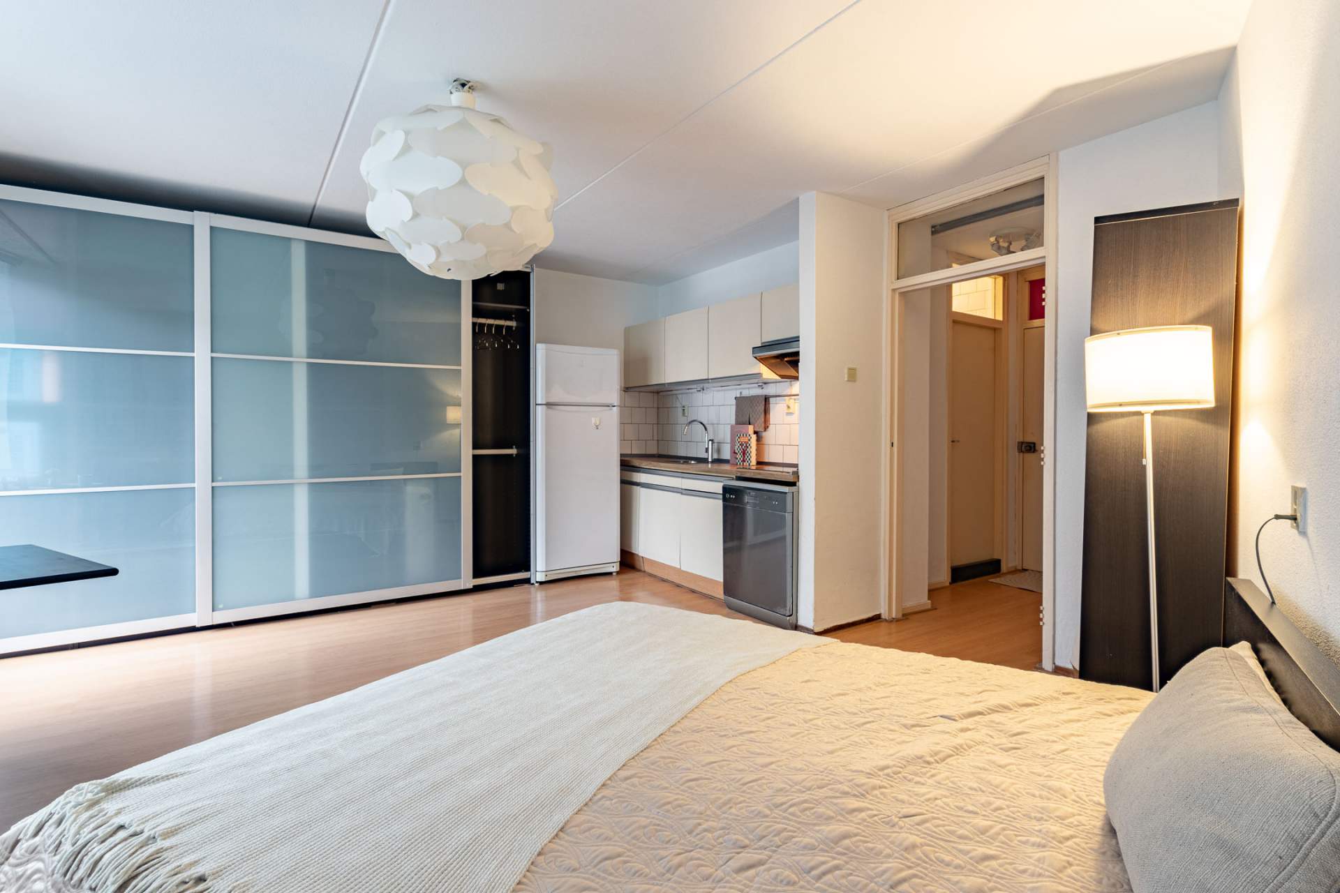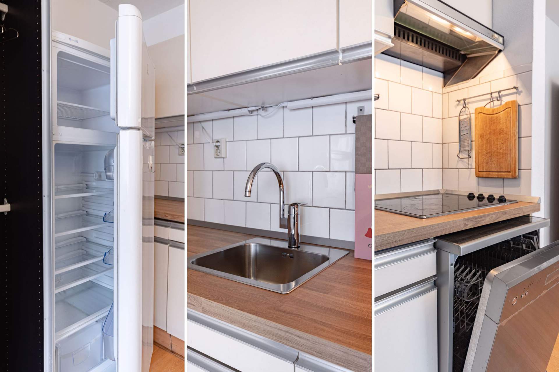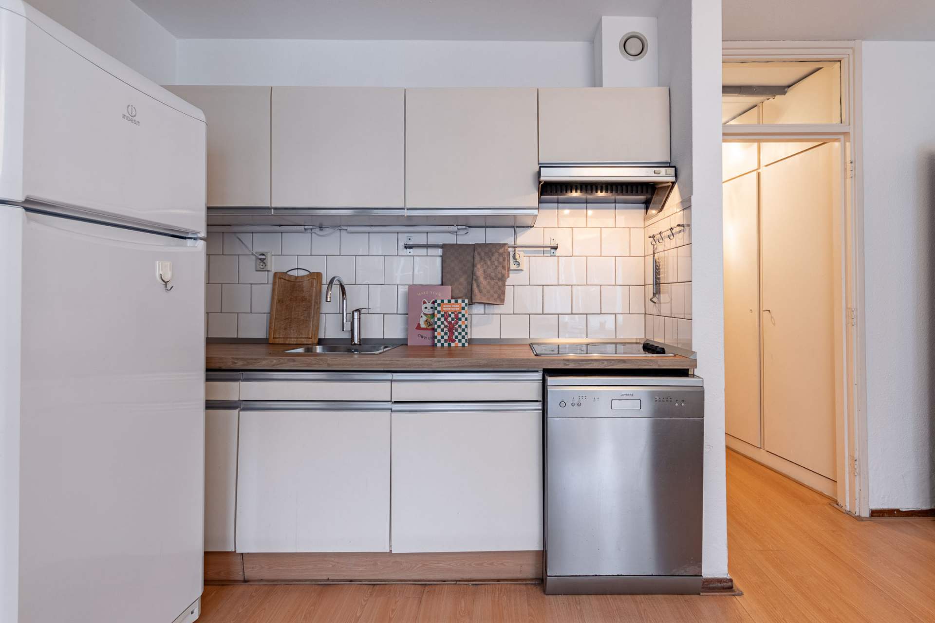 De lichte woon-/slaapruimte beschikt over een open keuken en directe toegang tot het balkon op het Noord-Westen. De keuken is voorzien van een losstaande koel-/vriescombinatie, elektrische kookplaat, afzuigkap en losse vaatwasser.