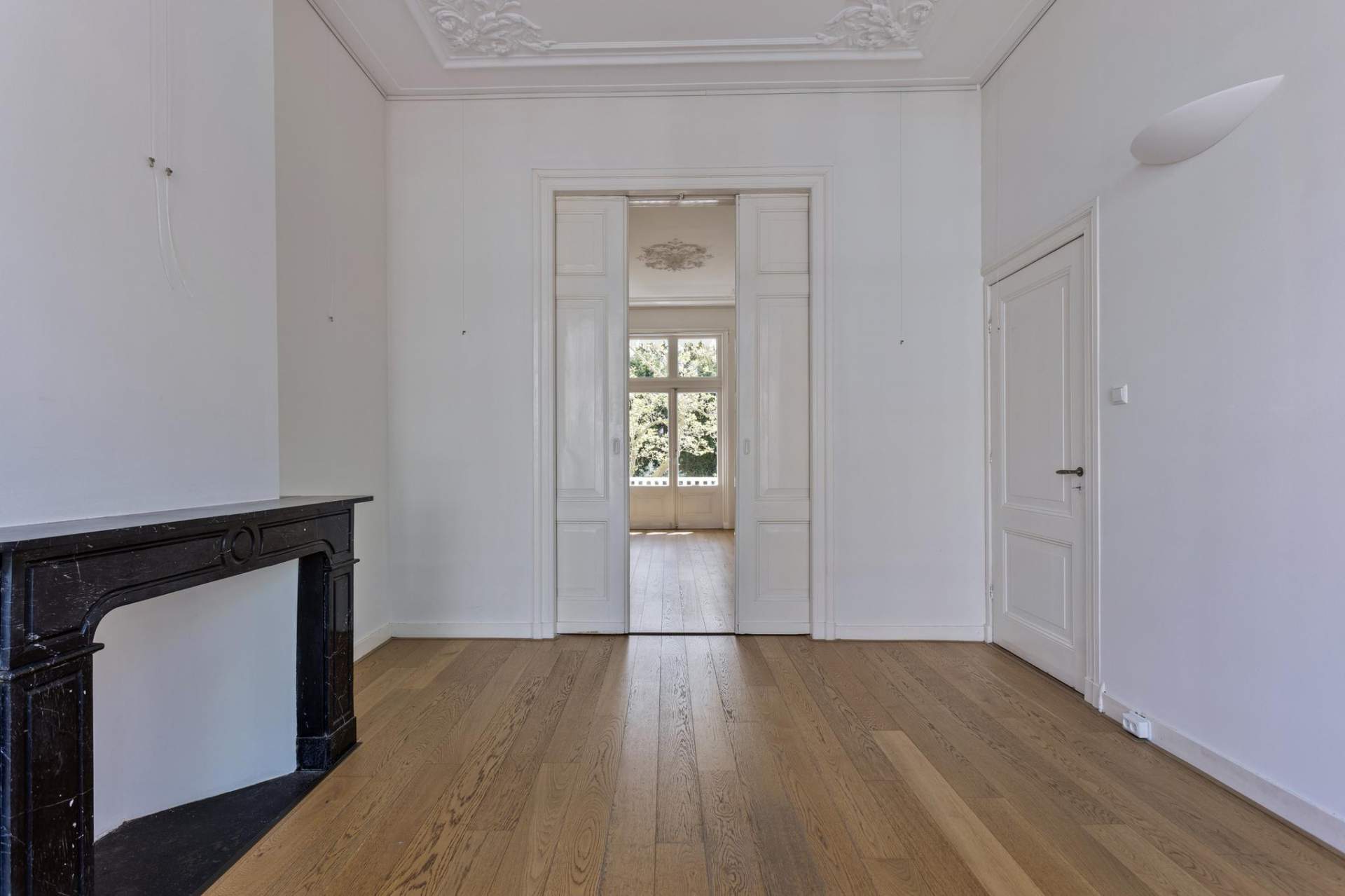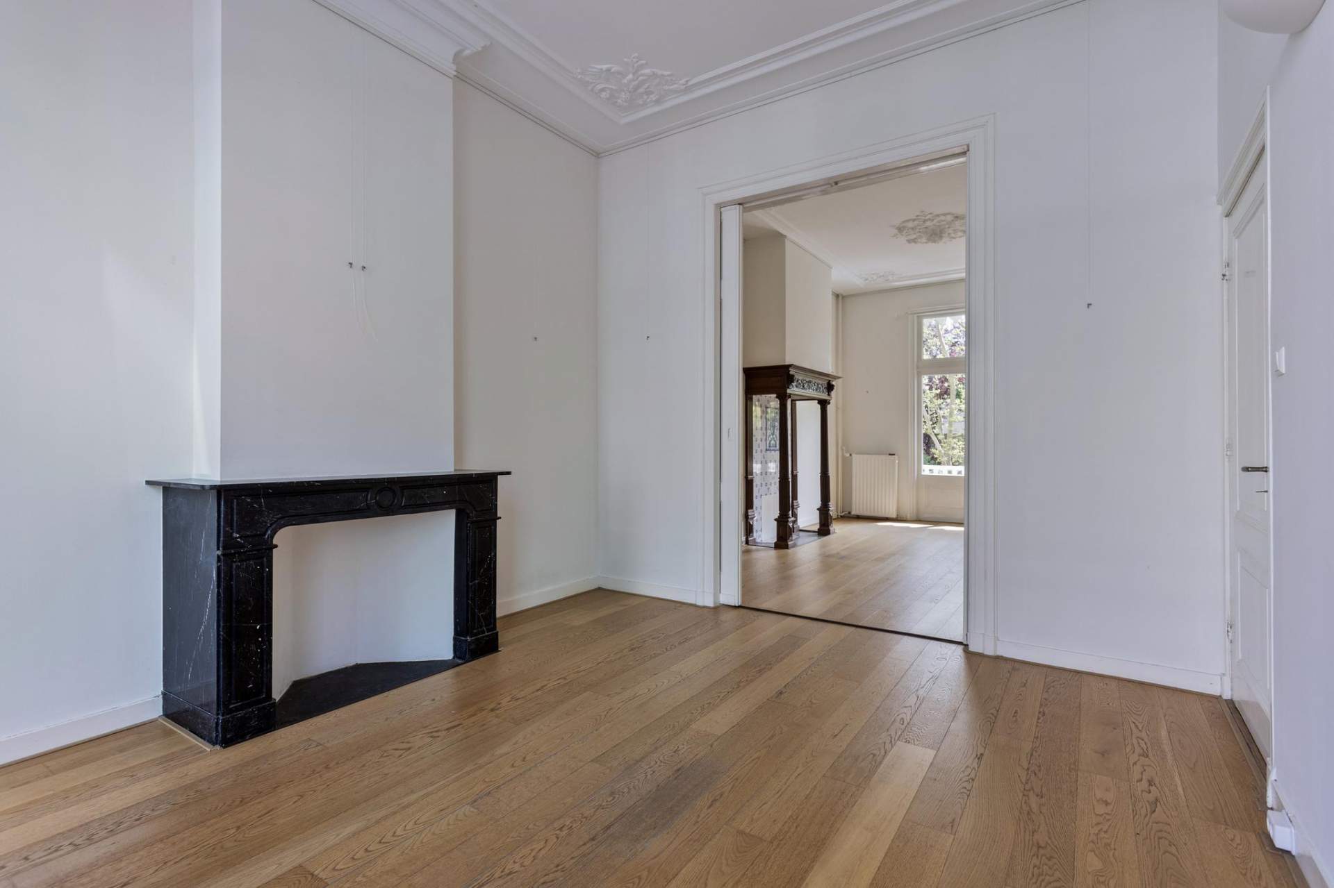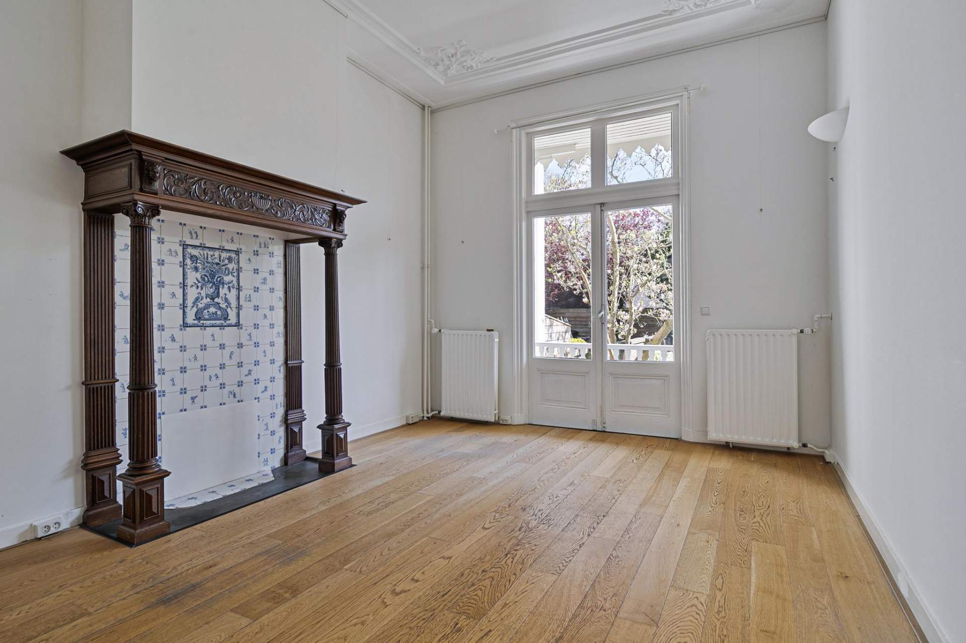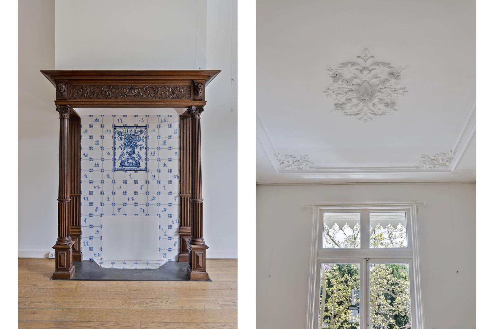 State entrance with original details and a marble floor. Spacious, bright living room en-suite with the original sliding doors, high ceilings with authentic ornaments. A wooden mantelpiece made by the famous Utrecht carpenter William Kuik with Delft blue tiles, depicting children's games.