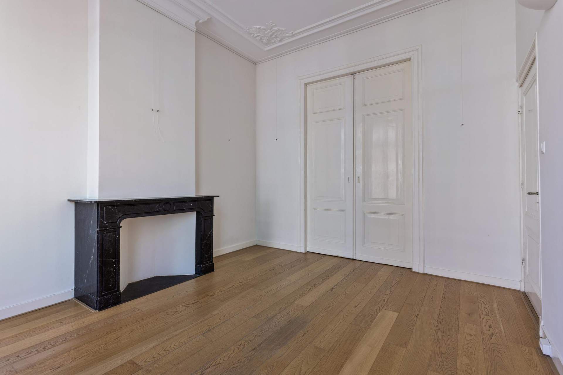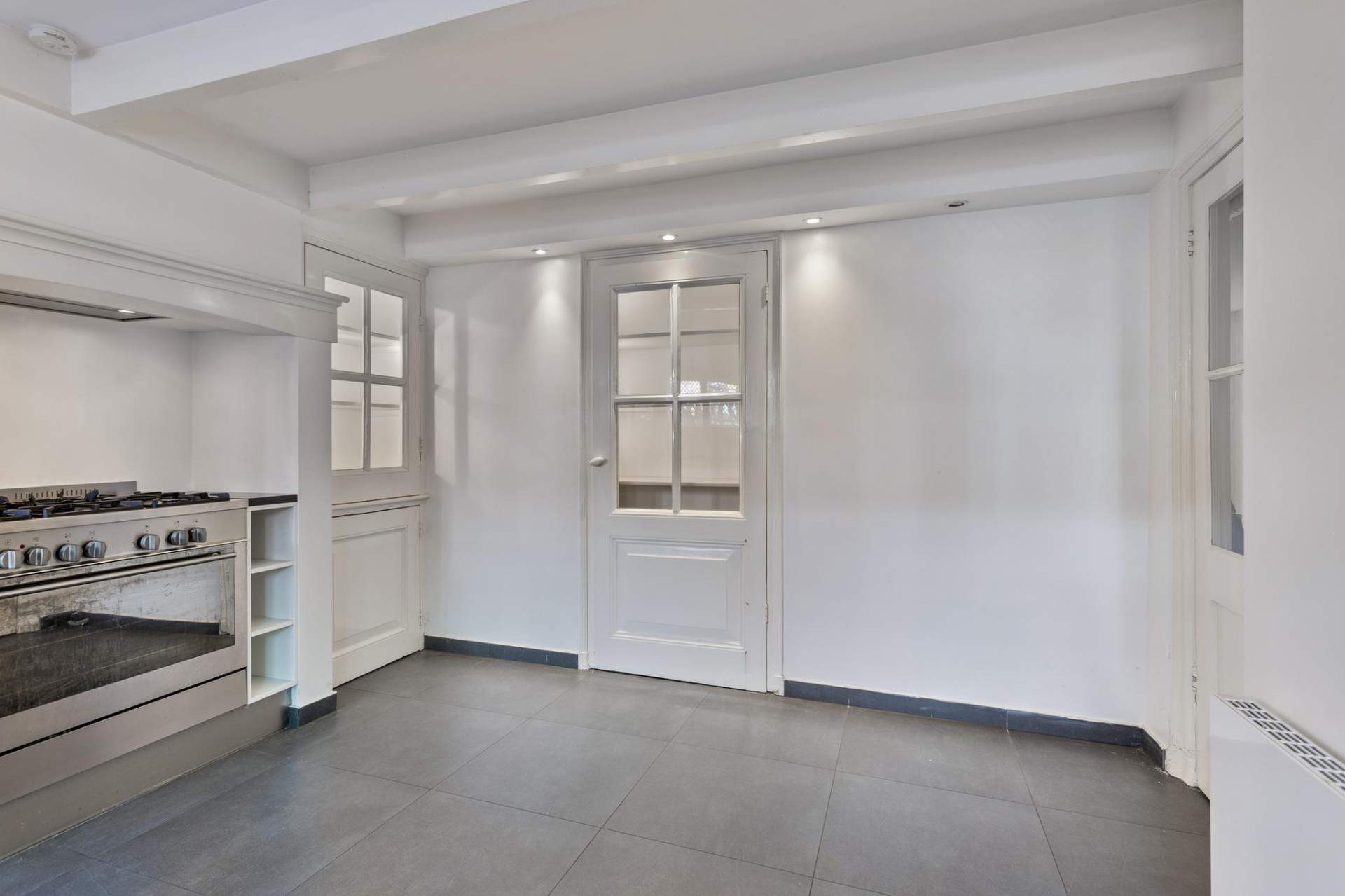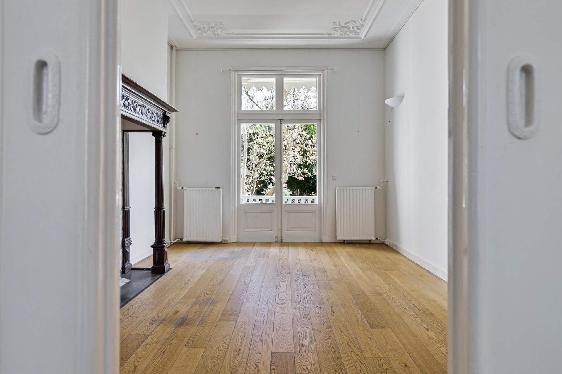 State entrance with original details and a marble floor. Spacious, bright living room en-suite with the original sliding doors, high ceilings with authentic ornaments. A wooden mantelpiece made by the famous Utrecht carpenter William Kuik with Delft blue tiles, depicting children's games.