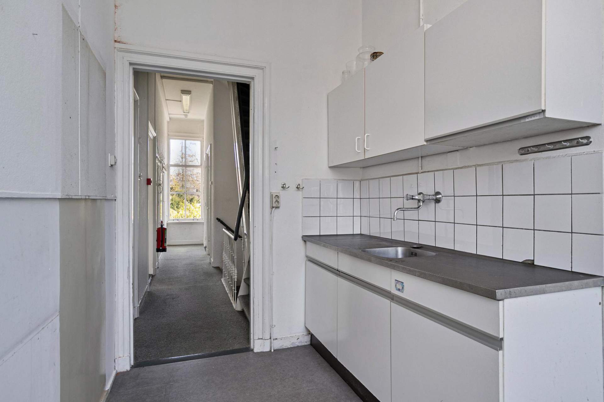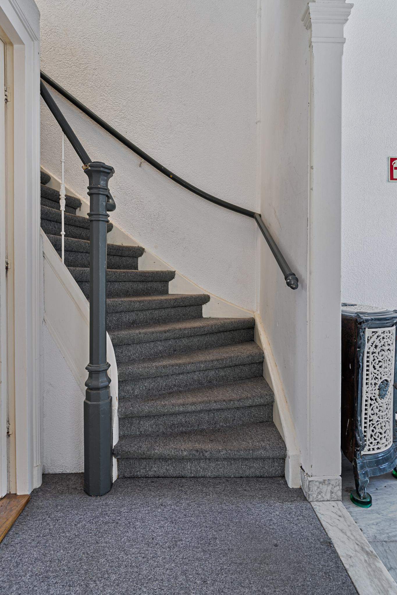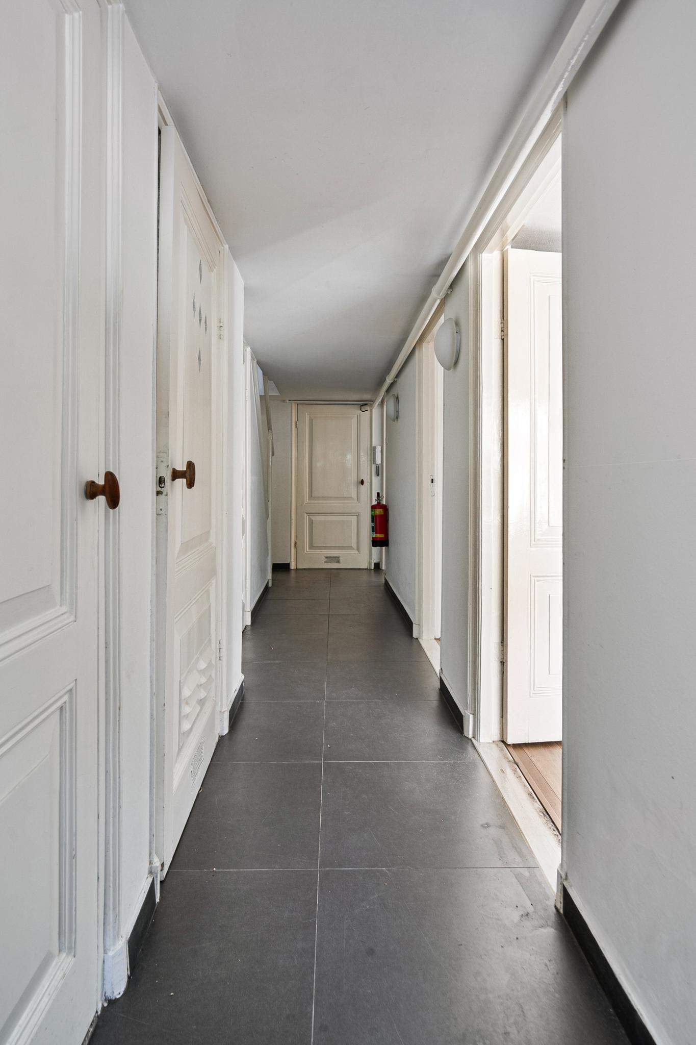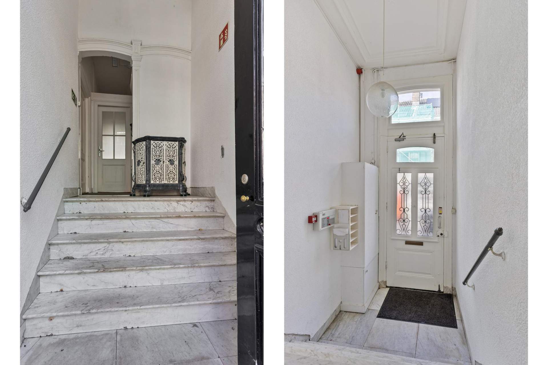 State entrance with original details and a marble floor. Spacious, bright living room en-suite with the original sliding doors, high ceilings with authentic ornaments. A wooden mantelpiece made by the famous Utrecht carpenter William Kuik with Delft blue tiles, depicting children's games.