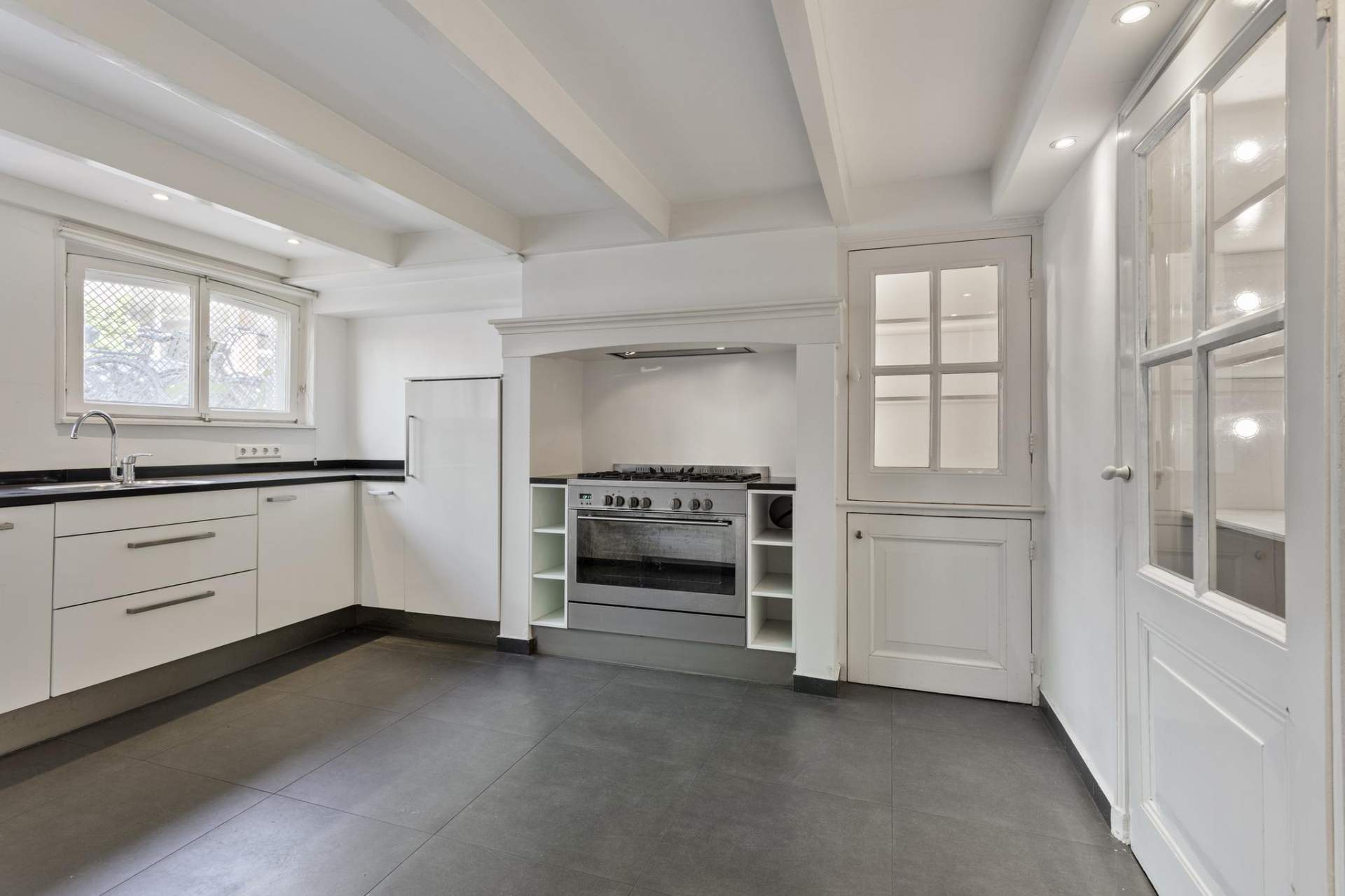 Spacious, cozy kitchen with all amenities and space for a large dining table. On the garden side there is a large room, suitable as a bedroom, playroom, study or second sitting room. From the hallway there is access to a sunken terrace and to the large garden with several terraces.