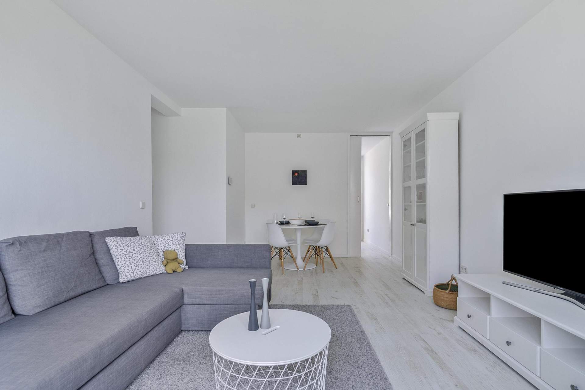 The spacious hall provides access to all the rooms, including a separate toilet with hand basin. The bright living room has access to a rear balcony facing west, perfect for sunsets. The separate kitchen, with floor heating, is equipped with modern appliances: an oven, dishwasher, hob, chimney hood, refrigerator and freezer. The second balcony is located at the front of the apartment. There are two spacious bedrooms, both at the front and rear, and a neat bathroom with shower and sink.
