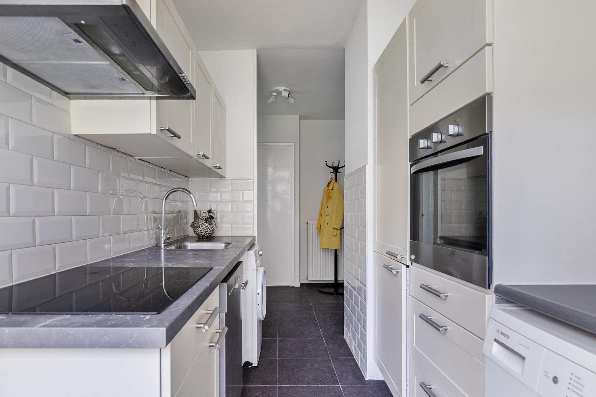 De ruime hal biedt toegang tot alle vertrekken, inclusief een apart toilet met fonteintje. De lichte woonkamer heeft toegang tot een balkon aan de achterzijde, gelegen op het westen, perfect voor zonsondergangen. De aparte keuken, met vloerverwarming, is uitgerust met moderne inbouwapparatuur: een oven, vaatwasser, kookplaat, schouwkap, koelkast en vriezer. Het tweede balkon bevindt zich aan de voorzijde van het appartement. Er zijn twee ruime slaapkamers, zowel aan de voor- als achterzijde, en een nette badkamer met douche en wastafel.
