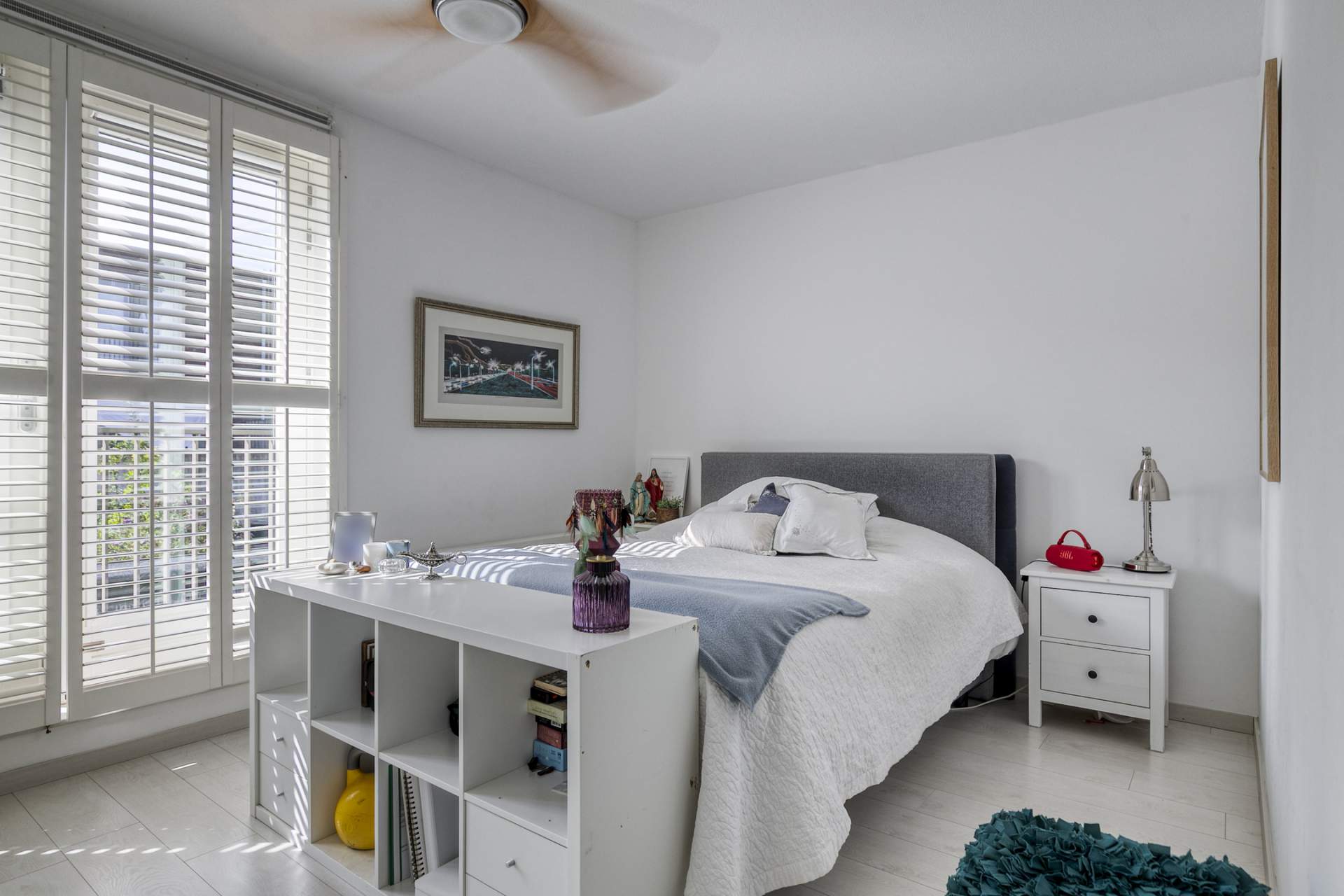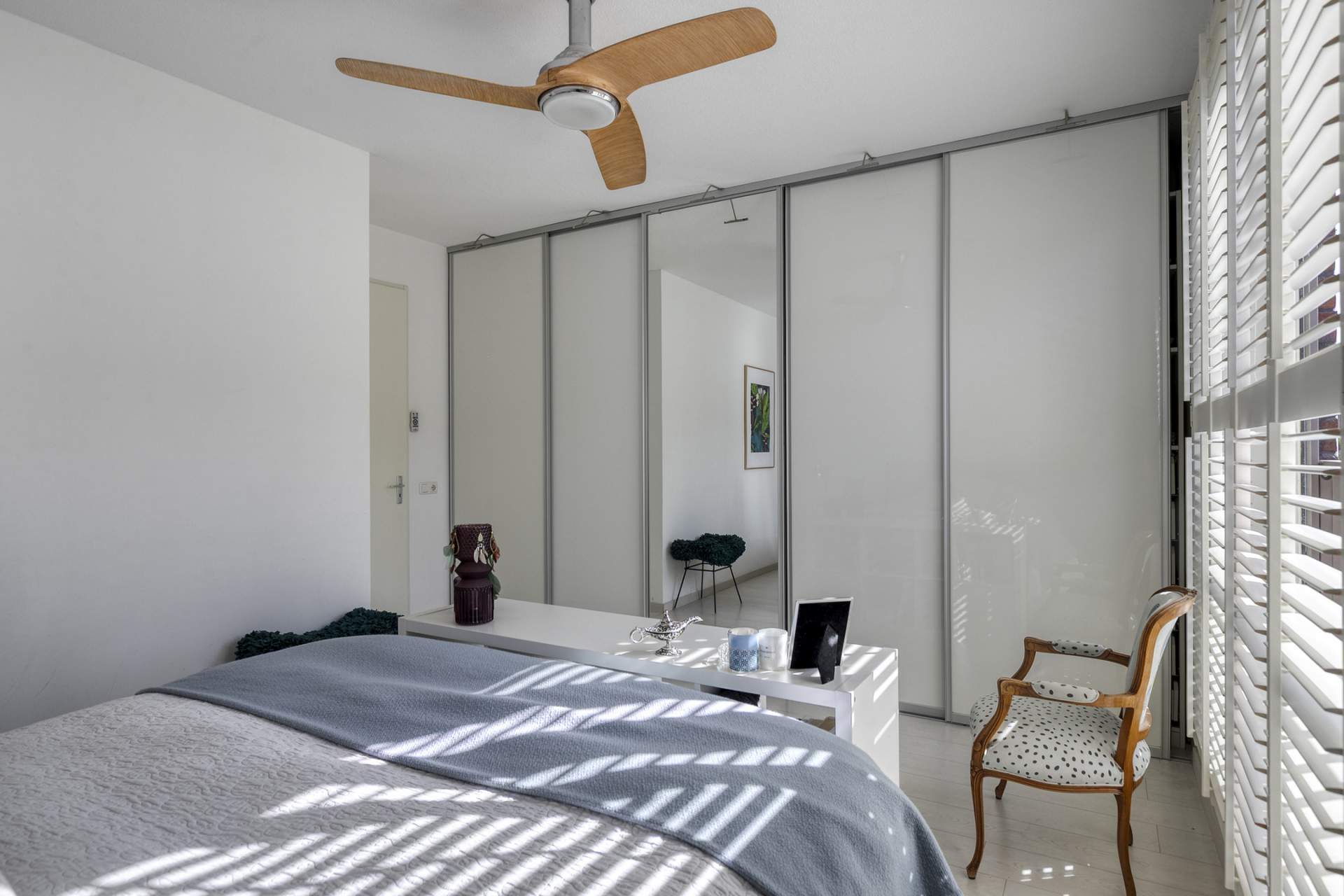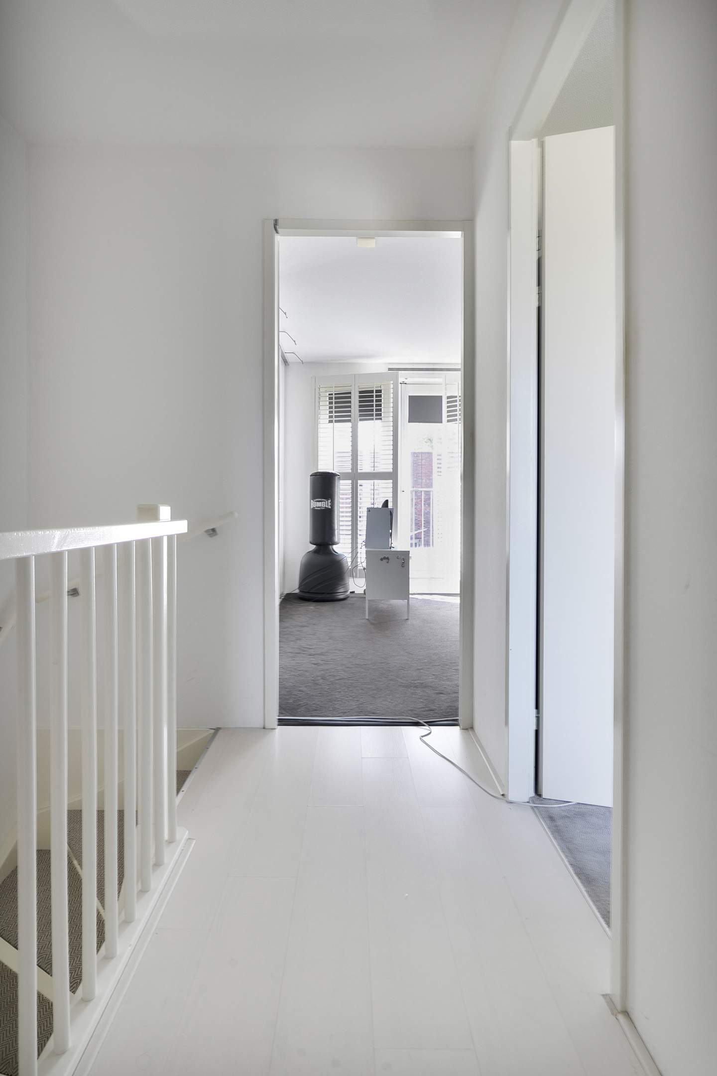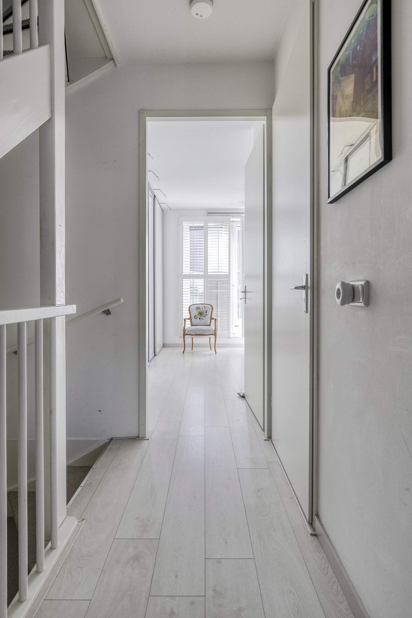 Landing with storage space and access to two more bedrooms. These bedrooms also have French doors with a Juliet balcony. The upper floor has beautiful custom-made wardrobes and laminate flooring beneath the carpeting.