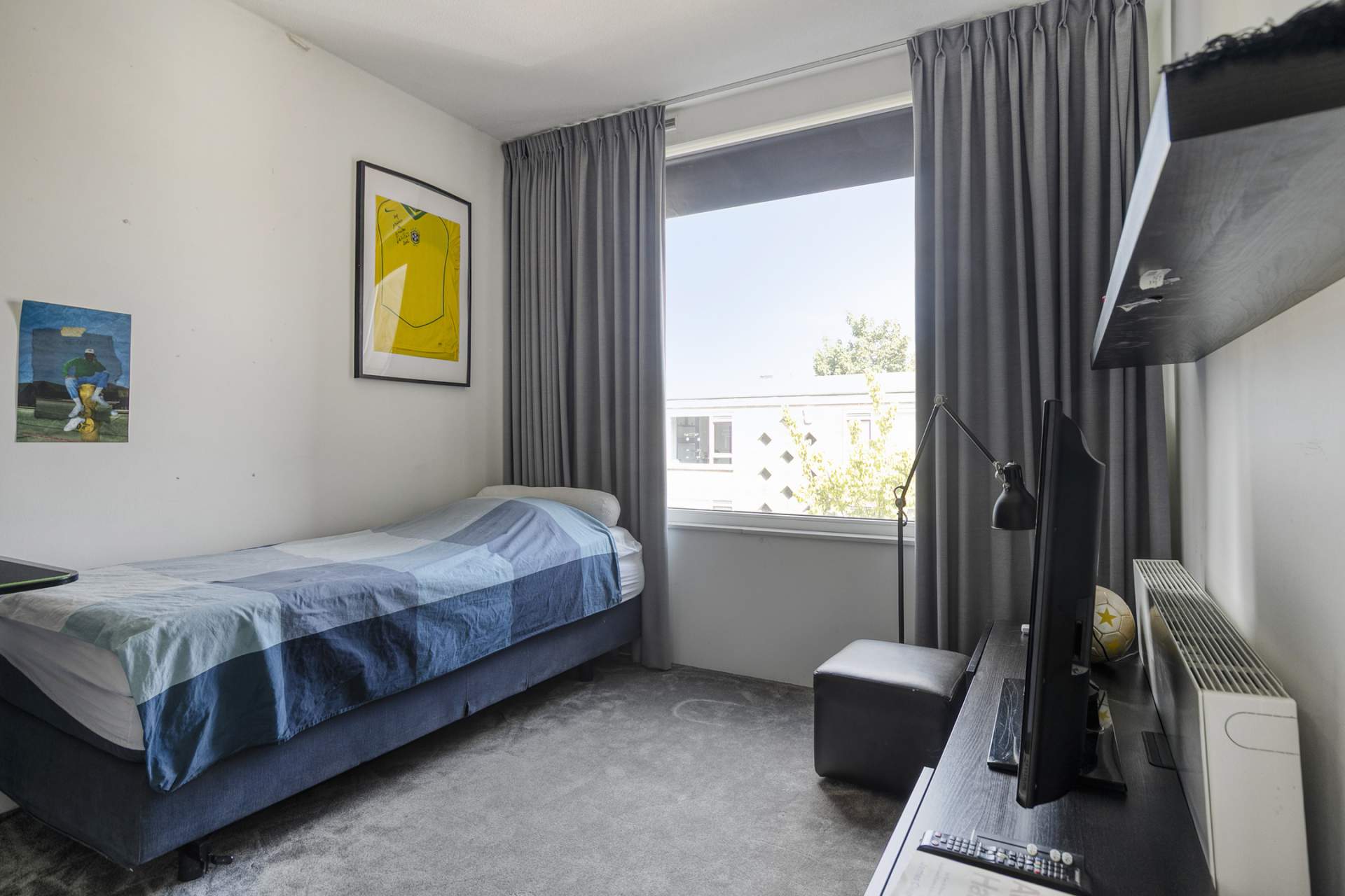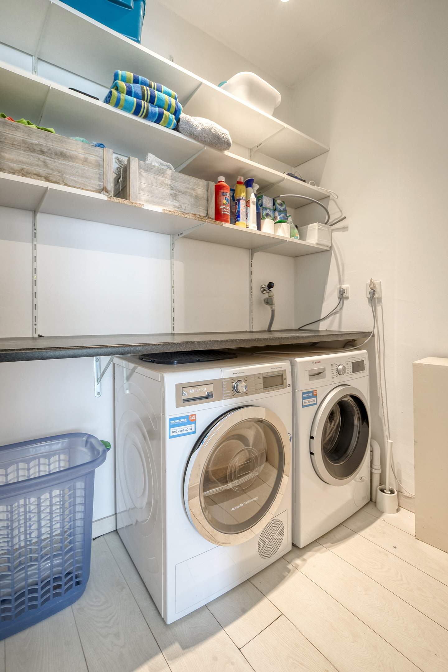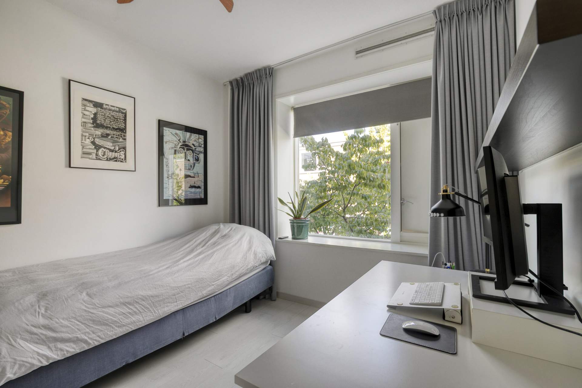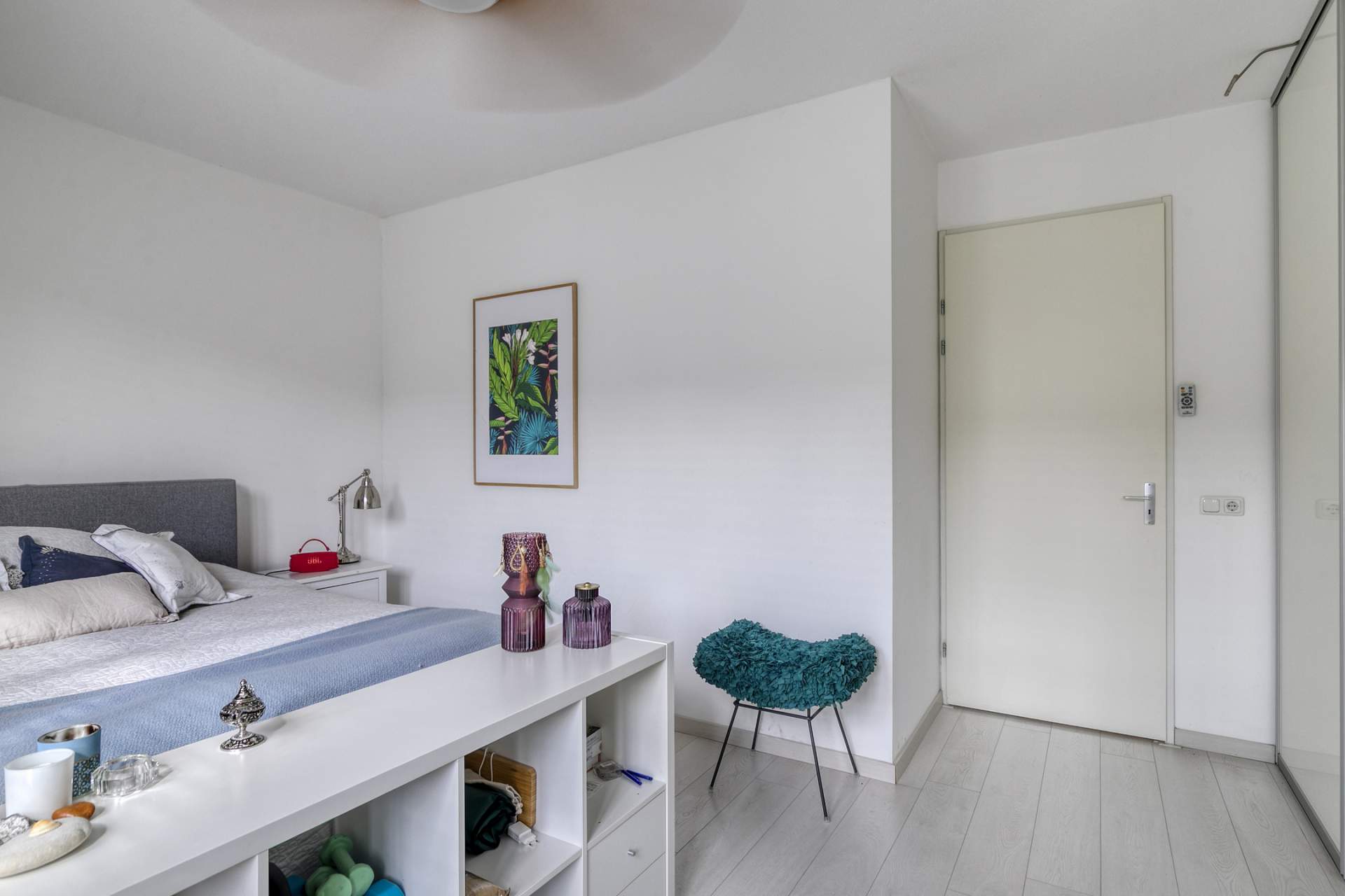 Landing with access to two spacious bedrooms, a storage/laundry room, and a luxurious en-suite bathroom. The bathroom is equipped with a bathtub, shower, second toilet, and sink. The master bedroom is located at the rear and spans the full width of the house, with French doors and a Juliet balcony. The bedroom at the front has a wide window frame with a lovely view of Troelstralaan.
