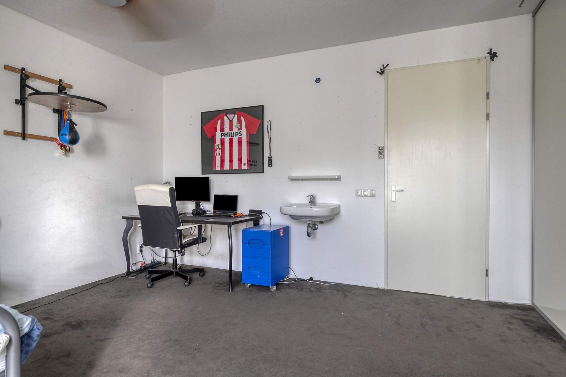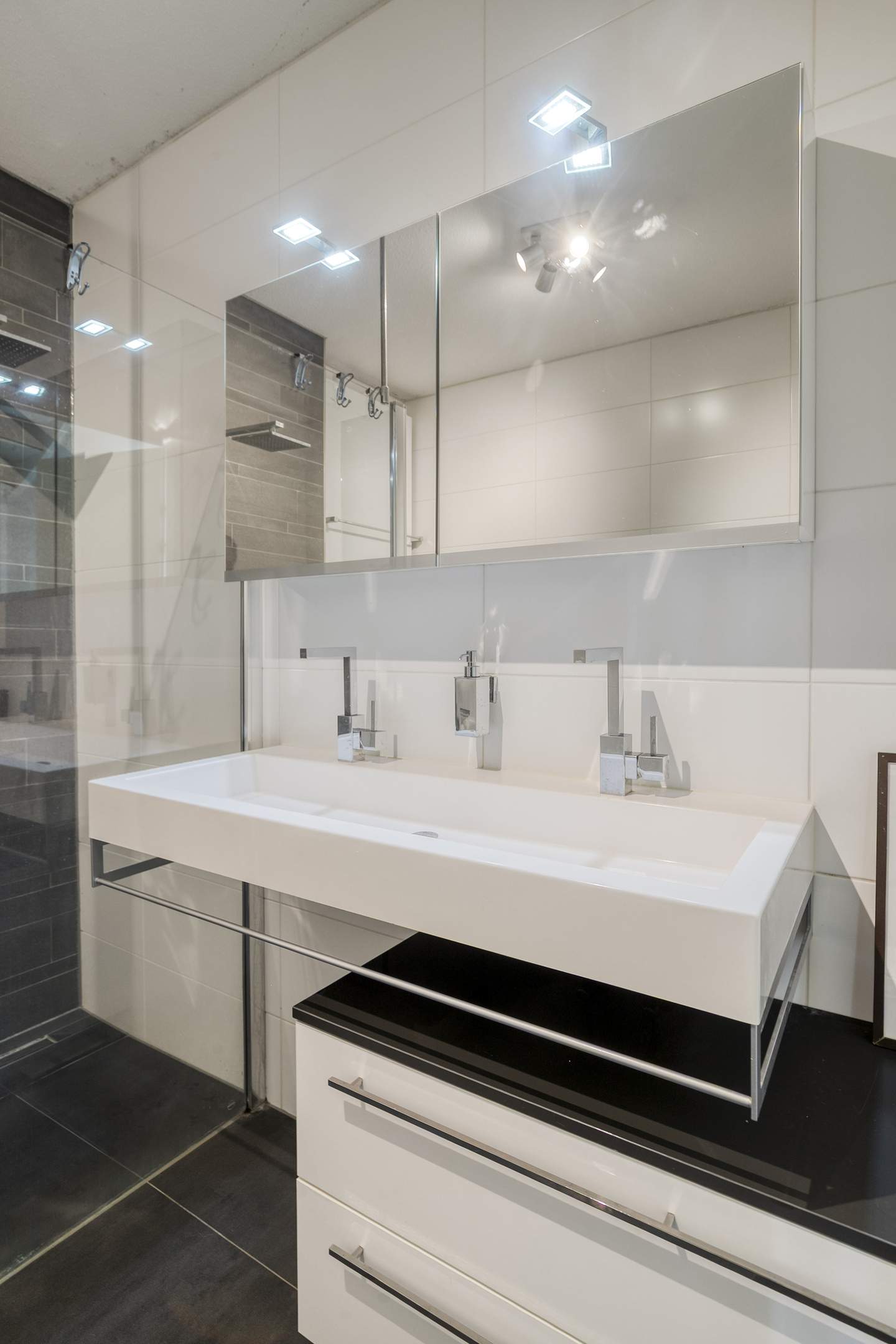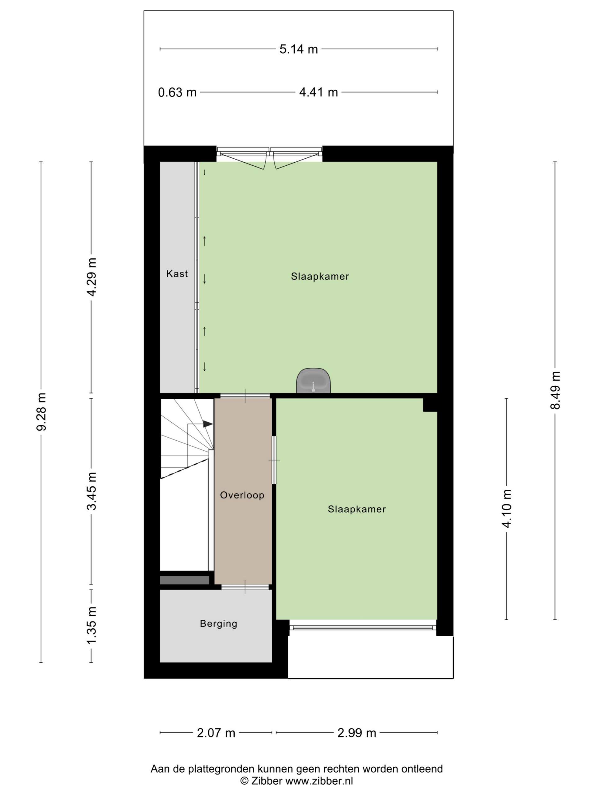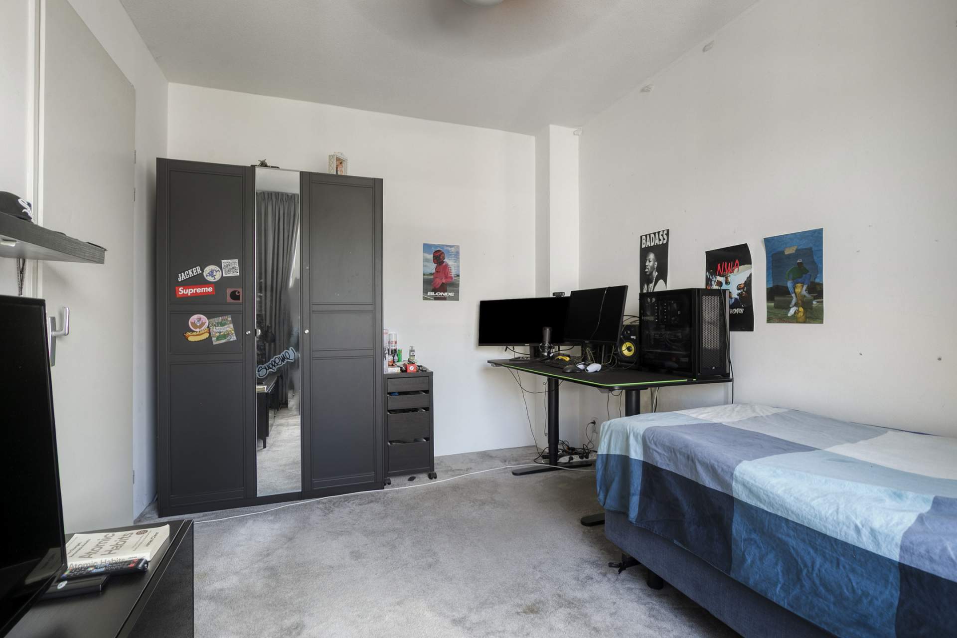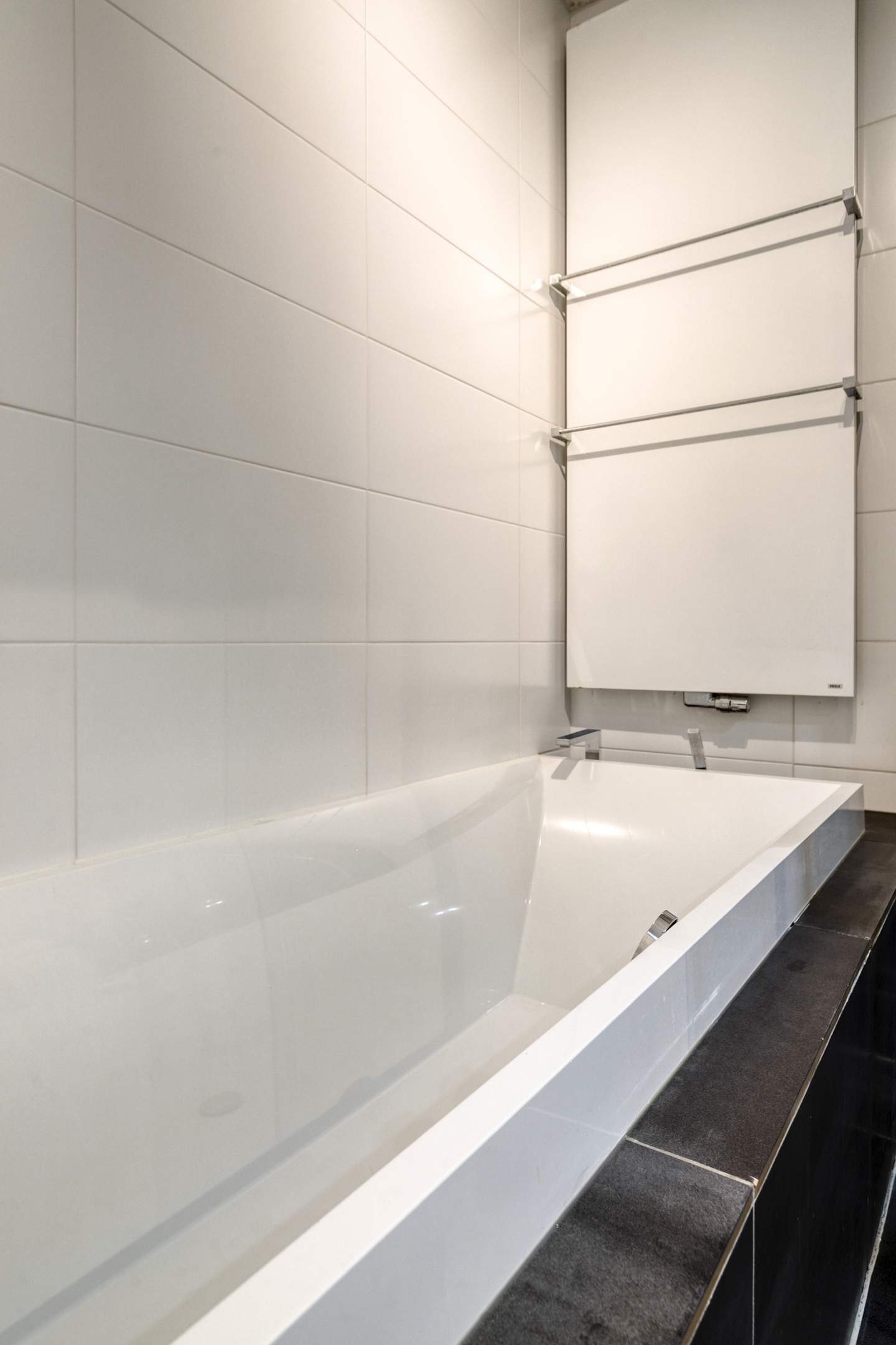 Landing with access to two spacious bedrooms, a storage/laundry room, and a luxurious en-suite bathroom. The bathroom is equipped with a bathtub, shower, second toilet, and sink. The master bedroom is located at the rear and spans the full width of the house, with French doors and a Juliet balcony. The bedroom at the front has a wide window frame with a lovely view of Troelstralaan.